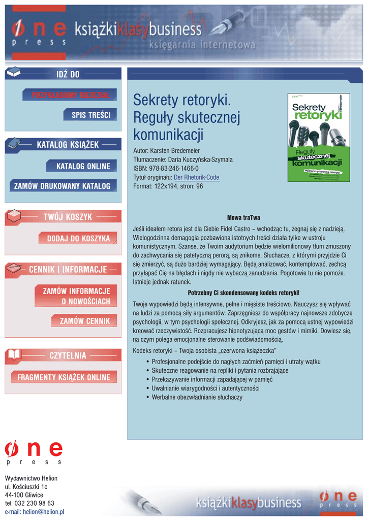 Sekrety retoryki. Regu³y skutecznej komunikacji Autor: Karsten Bredemeier T³umaczenie: Daria Kuczyñska-Szymala ISBN: 978-83-246-1466-0 Tytu³ orygina³u: Der Rhetorik-Code Format: 122x194, stron: 96 Mowa traTwa Jeœli idea³em retora jest dla Ciebie Fidel Castro – wchodz¹c tu, ¿egnaj siê z nadziej¹. Wielogodzinna demagogia pozbawiona istotnych treœci dzia³a tylko w ustroju komunistycznym. Szanse, ¿e Twoim audytorium bêdzie wielomilionowy t³um zmuszony do zachwycania siê patetyczn¹ peror¹, s¹ znikome. S³uchacze, z którymi przyjdzie Ci siê zmierzyæ, s¹ du¿o bardziej wymagaj¹cy. Bêd¹ analizowaæ, kontemplowaæ, zechc¹ przy³apaæ Ciê na b³êdach i nigdy nie wybacz¹ zanudzania. Pogotowie tu nie pomo¿e. Istnieje jednak ratunek. Potrzebny Ci skondensowany kodeks retoryki! Twoje wypowiedzi bêd¹ intensywne, pe³ne i miêsiste treœciowo. Nauczysz siê wp³ywaæ na ludzi za pomoc¹ si³y argumentów. Zaprzêgniesz do wspó³pracy najnowsze zdobycze psychologii, w tym psychologii spo³ecznej. Odkryjesz, jak za pomoc¹ ustnej wypowiedzi kreowaæ rzeczywistoœæ. Rozpracujesz hipnotyzuj¹c¹ moc gestów i mimiki. Dowiesz siê, na czym polega emocjonalne sterowanie podœwiadomoœci¹. Kodeks retoryki – Twoja osobista „czerwona ksi¹¿eczka” • Profesjonalne podejœcie do nag³ych zaæmieñ pamiêci i utraty w¹tku • Skuteczne reagowanie na repliki i pytania rozbrajaj¹ce • Przekazywanie informacji zapadaj¹cej w pamiêæ • Uwalnianie wiarygodnoœci i autentycznoœci • Werbalne obezw³adnianie s³uchaczy SPIS TRECI I. II. Uwagi wstpne 11 Nowe odkrycia psychologii i psychologii spoecznej 13 Najnowsze osignicia nauk kognitywnych 14 Upoledzenie informacyjne 16 Pierwszorzdne przygotowanie 19 Jasno zdefiniowany cel Z perspektywy medycyny Z perspektywy psychologii Z perspektywy sów tworzcych rzeczywisto 22 23 23 24 Profesjonalny przekaz zasadniczy Trzy wskazówki dotyczce zasadniczego przekazu 25 25 Apel skierowany do odbiorcy 27 III. Retoryka — 10 podstawowych zasad 31 Zaoenie 31 Zasada nr 1: Baza — powrót do kontekstu 31 Zasada nr 2: Sowa tworzce rzeczywisto Unikaj bezosobowych przekazów Unikaj relatywizujcych „poduszeczek” Unikaj trybu przypuszczajcego i wypowiedzi typu „moglibymy”, „chcielibymy”, „powinnimy” Unikaj anonimowych przekazów 32 33 33 5 34 34 Unikaj „gdybania” Koniec z pozornymi „pytaniami retorycznymi” Chwileczk… Zapomnij o swoich ulubionych „wypeniaczach” Uywaj wyrae odnoszcych si do teraniejszoci, twórz w ten sposób fakty 34 35 36 37 38 Zasada nr 3: Pozytywne sformuowania 38 Zasada nr 4: Strona czynna 41 Zasada nr 5: Oceny kreujce wizerunek 42 Zasada nr 6: Konsekwentne uporzdkowanie 42 Zasada nr 7: Umysowe kotwice 43 Zasada nr 8: Kropka = pauza 46 Zasada nr 9: Fakty, daty i relacje midzy nimi 47 Zasada nr 10: Odpowiedni rytm 48 IV. Skuteczne stosowanie regu retoryki — wzmocnienia 53 Skuteczno sytuacyjna Programowanie Deprogramowanie Reprogramowanie 54 54 55 55 Swobodna postawa Na stojco Na siedzco 56 56 58 Rytualizacja gestów i sygnaów Czas trwania gestu 58 59 Kontakt wzrokowy to Twoja wiarygodno 59 By i pozosta autentycznym 60 Stworzenie i umocnienie „brzmienia”, które mona nastpnie przywoywa 61 6 Profesjonalne podejcie do nagych zamie i utraty wtku Pierwsza moliwo: Nigdy nie mów nigdy... Druga moliwo: Powiedz to inaczej Trzecia moliwo: Powtórz si Czwarta prowokujca moliwo: Jakie pytanie? 62 63 63 63 64 Skuteczne reagowanie na repliki — regua trzech T Kada odpowied to legitymizacja pytania! 65 68 Informacja zwrotna wedug Bredemeiera sposobem na powstrzymanie eskalacji konfliktu 75 Przymus mówienia — emocjonalne sterowanie podwiadomoci 79 Dodatek 85 Specyficzne zastosowania regu retoryki 85 wiczenia 86 Literatura 87 7 II. PIERWSZORZDNE PRZYGOTOWANIE Ustosunkowanie si na paszczynie jzykowej jest w biznesie równoznaczne z okreleniem swego stanowiska przez mówc. „Jeste panem swoich sów, ale gdy je ju wypowiesz, one zaczn panowa nad tob.” szkockie przysowie Oto optymalny sposób postpowania, który naley realizowa krok po kroku: 1. Na etapie przygotowa do planowanej rozmowy lub prezentacji szczegóowo zdefiniuj na gos swoje cele oraz sformuuj najwaniejsze czci skadowe swojej wypowiedzi, czyli jej zasadniczy przekaz i apele kierowane do odbiorcy. 2. Na tej podstawie sformuuj gono swój tekst, jednoczenie go zapisujc. 3. Przejrzyj go ponownie, konsekwentnie stosujc podstawowe reguy retoryki (s. 33 i kolejne). 4. Wielokrotnie i powoli przeczytaj tekst na gos. W ten sposób powstanie jego mentalne sformuowanie, forma sowna, która utrwali si w Twojej wiadomoci i bdzie moga zosta przywoana (to rodzaj programowania z wykorzystaniem ptli fonologicznych). 5. Skró cay tekst do kilku hase, za którymi bd si kry cae akapity tekstu zgromadzone i usystematyzowane w Twojej pamici i gotowe do przywoania. Bd to reprezentacje opracowanych wczeniej fragmentów tekstu, które Twoja podwiadomo przypisze potem do poszczególnych hase, umoliwiajc ich przywoanie. 19 6. Naucz si na pami wprowadzenia, zasadniczego przekazu oraz apelów do odbiorcy. Pierwsze wraenie ma decydujce znaczenie, natomiast ostatnie utrzymuje si najduej. 7. Nastpnie powoli wypowiedz cay tekst, posikujc si hasami. Jeli wystpi jakie trudnoci, jeszcze raz przeczytaj powoli cay tekst na gos. 8. wicz tak dugo, a opanujesz wszystkie elementy planowanej wypowiedzi czy prezentacji. Tym, co odrónia orkiestr profesjonaln od amatorskiej, jest praktyka! Kurt Masur, dyrygent Taki zoptymalizowany sposób postpowania warto stosowa w przypadku rozmów, prezentacji czy wykadów, które mog si odbywa w rozmaitych sytuacjach, na przykad podczas rozmów kwalifikacyjnych, rozmów z klientami, prezentacji projektów czy wystpie zwizanych z wejciem firmy na gied. Zalet powyszego postpowania jest to, e podczas takiego metodycznego przygotowania zarówno w pamici krótkotrwaej, jak i dugotrwaej zostaj zgromadzone gotowe elementy argumentacji, które mona p