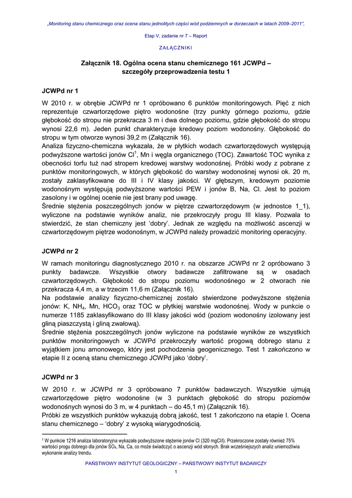 „Monitoring stanu chemicznego oraz ocena stanu jednolitych części wód podziemnych w dorzeczach w latach 2009–2011”, Etap V, zadanie nr 7 – Raport ZAŁĄCZNIKI Załącznik 18. Ogólna ocena stanu chemicznego 161 JCWPd – szczegóły przeprowadzenia testu 1 JCWPd nr 1 W 2010 r. w obrębie JCWPd nr 1 opróbowano 6 punktów monitoringowych. Pięć z nich reprezentuje czwartorzędowe piętro wodonośne (trzy punkty górnego poziomu, gdzie głębokość do stropu nie przekracza 3 m i dwa dolnego poziomu, gdzie głębokość do stropu wynosi 22,6 m). Jeden punkt charakteryzuje kredowy poziom wodonośny. Głębokość do stropu w tym otworze wynosi 39,2 m (Załącznik 16). Analiza fizyczno-chemiczna wykazała, że w płytkich wodach czwartorzędowych występują podwyższone wartości jonów Cl1, Mn i węgla organicznego (TOC). Zawartość TOC wynika z obecności torfu tuż nad stropem kredowej warstwy wodonośnej. Próbki wody z pobrane z punktów monitoringowych, w których głębokość do warstwy wodonośnej wynosi ok. 20 m, zostały zaklasyfikowane do III i IV klasy jakości. W głębszym, kredowym poziomie wodonośnym występują podwyższone wartości PEW i jonów B, Na, Cl. Jest to poziom zasolony i w ogólnej ocenie nie jest brany pod uwagę. Średnie stężenia poszczególnych jonów w piętrze czwartorzędowym (w jednostce 1_1), wyliczone na podstawie wyników analiz, nie przekroczyły progu III klasy. Pozwala to stwierdzić, że stan chemiczny jest ‘dobry’. Jednak ze względu na możliwość ascenzji w czwartorzędowym piętrze wodonośnym, w JCWPd należy prowadzić monitoring operacyjny. JCWPd nr 2 W ramach monitoringu diagnostycznego 2010 r. na obszarze JCWPd nr 2 opróbowano 3 punkty badawcze. Wszystkie otwory badawcze zafiltrowane są w osadach czwartorzędowych. Głębokość do stropu poziomu wodonośnego w 2 otworach nie przekracza 4,4 m, a w trzecim 11,6 m (Załącznik 16). Na podstawie analizy fizyczno-chemicznej zostało stwierdzone podwyższone stężenia jonów: K, NH4, Mn, HCO3 oraz TOC w płytkiej warstwie wodonośnej. Wody w punkcie o numerze 1185 zaklasyfikowano do III klasy jakości wód (poziom wodonośny izolowany jest gliną piaszczystą i gliną zwałową). Średnie stężenia poszczególnych jonów wyliczone na podstawie wyników ze wszystkich punktów monitoringowych w JCWPd przekroczyły wartość progową dobrego stanu z wyjątkiem jonu amonowego, który jest pochodzenia geogenicznego. Test 1 zakończono w etapie II z oceną stanu chemicznego JCWPd jako ‘dobry’. JCWPd nr 3 W 2010 r. w JCWPd nr 3 opróbowano 7 punktów badawczych. Wszystkie ujmują czwartorzędowe piętro wodonośne (w 3 punktach głębokość do stropu poziomów wodonośnych wynosi do 3 m, w 4 punktach – do 45,1 m) (Załącznik 16). Próbki ze wszystkich punktów wykazują dobrą jakość, test 1 zakończono na etapie I. Ocena stanu chemicznego – ‘dobry’ z wysoką wiarygodnością. 1 W punkcie 1216 analiza laboratoryjna wykazała podwyższone stężenie jonów Cl (320 mgCl/l). Przekroczone zostały również 75% wartości progu dobrego dla jonów SO4, Na, Ca, co może świadczyć o ascenzji wód słonych. Brak wcześniejszych analiz uniemożliwia wykonanie analizy trendu. PAŃSTWOWY INSTYTUT GEOLOGICZNY – PAŃSTWOWY INSTYTUT BADAWCZY 1 „Monitoring stanu chemicznego oraz ocena stanu jednolitych części wód podziemnych w dorzeczach w latach 2009–2011”, Etap V, zadanie nr 7 – Raport ZAŁĄCZNIKI PAŃSTWOWY INSTYTUT GEOLOGICZNY – PAŃSTWOWY INSTYTUT BADAWCZY 2 „Monitoring stanu chemicznego oraz ocena stanu jednolitych części wód podziemnych w dorzeczach w latach 2009–2011”, Etap V, zadanie nr 7 – Raport ZAŁĄCZNIKI JCWPd nr 4 W 2010 r., w ramach monitoringu diagnostycznego, na obszarze JCWPd nr 4, opróbowano 2 punkty – 1 punkt ujmuje czwartorzędowy poziom wodonośny, drugi utwory kredy górnej. Głębokość do stropu poziomów wodonośnych wynosi do 8,6 m (Załącznik 16). W obu punktach przypisano III klasę jakości. W punkcie 948 stężenie kadmu przekroczyło 75% wartości progowej dobrego stanu. Mimo to test 1 zakończono na etapie I z wynikiem ‘dobry’. Ocenę przypisano z wysoką wiarygodnością. JCWPd nr 5 W ramach monitoringu diagnostycznego w 2010 r. opróbowano 2 punkty o numerach 2222 i 2224. Punkty te reprezentują czwartorzędowe piętro wodonośne (Załącznik 16). W badanych punktach nie stwierdzono przekroczenia wartości progowej III klasy poszczególnych jonów. Test 1 zakończono na etapie I. Ocena stanu chemicznego jest ‘dobry’ z wysoką wiarygodnością. JCWPd nr 6 Na obszarze JCWPd nr 6 w 2010 r. w ramach monitoringu diagnostycznego opróbowano trzy punkty o numerach 2151, 1094 i 1200. Reprezentują one różne poziomy wodonośne, które lokalnie stanowią główny poziom użytkowy (Załącznik 16) Wartości stężeń poszczególnych jonów w żadnym punkcie nie przekroczyły wartości progowej III klasy. Test 1 zakończono na etapie I. Ocena stanu chemicznego JCWPd jest ‘dobry’ z wysoką wiarygodnością. JCWPd nr 7 W ramach monitoringu diagnostycznego 2010 r. na obszarze JCWPd nr 7 opróbowano 6 punktów badawczych. 5 punktów ujmuje czwartorzędowy poziom wodonośny, gdzie głębokość do stropu wynosi od 10 do 38 m. Jeden punkt ujmuje mioceński poziom wodonośny. Wszystkie charakteryzują się zwierciadłem napiętym (Załącznik 16). Wartości stężeń poszczególnych jonów w żadnym punkcie nie przekroczyły wartości progowej III klasy. Test 1 zakończono na etapie I. Ocena stanu chemicznego JCWPd jest ‘dobry’ (z wysoką wiarygodnością). JCWPd nr 8 Na obszarze JCWPd nr 8 w 2010 r., w ramach monitoringu diagnostycznego opróbowano 4 punkty pomiarowe o numerach 222, 223, 784 i 946. Dwa punkty reprezentują czwartorzędowe piętro wodonośne, gdzie głębokości do stropu poziomów wodonośnych wynoszą odpowiednio 3,1 m i 35 m. Pozostałe punkty 784 i 222 ujmują kolejno poziom kredowy i 