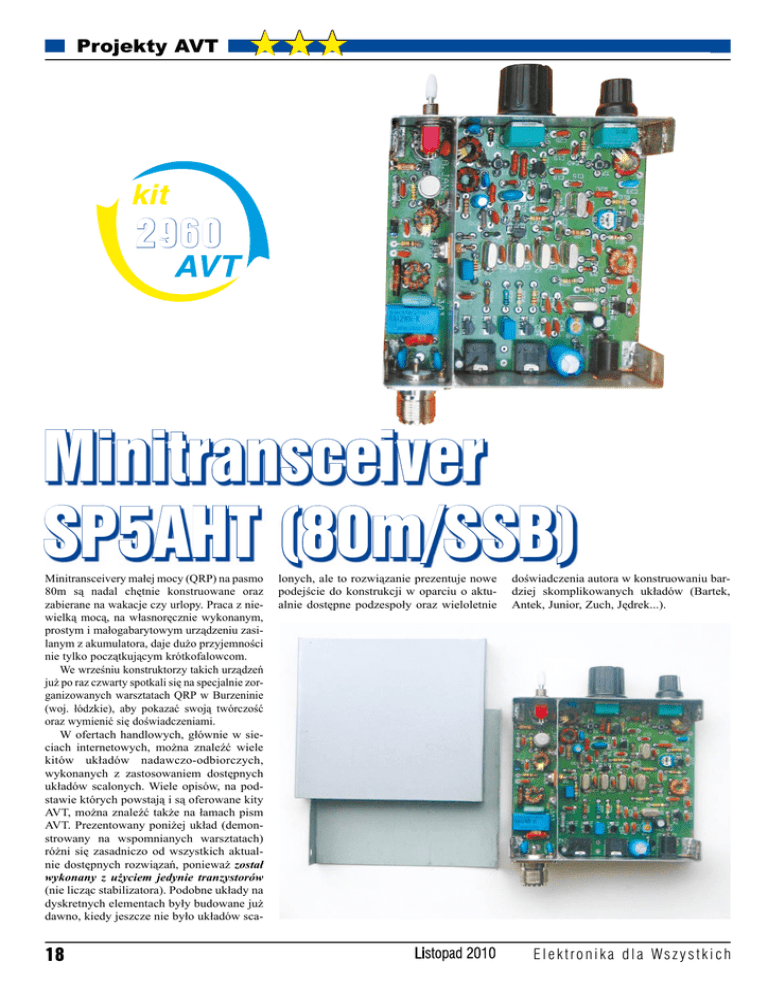 Projekty AVT 2960 Minitransceiver SP5AHT (80m/SSB) Minitransceivery małej mocy (QRP) na pasmo 80m są nadal chętnie konstruowane oraz zabierane na wakacje czy urlopy. Praca z niewielką mocą, na własnoręcznie wykonanym, prostym i małogabarytowym urządzeniu zasilanym z akumulatora, daje dużo przyjemności nie tylko początkującym krótkofalowcom. We wrześniu konstruktorzy takich urządzeń już po raz czwarty spotkali się na specjalnie zorganizowanych warsztatach QRP w Burzeninie (woj. łódzkie), aby pokazać swoją twórczość oraz wymienić się doświadczeniami. W ofertach handlowych, głównie w sieciach internetowych, można znaleźć wiele kitów układów nadawczo-odbiorczych, wykonanych z zastosowaniem dostępnych układów scalonych. Wiele opisów, na podstawie których powstają i są oferowane kity AVT, można znaleźć także na łamach pism AVT. Prezentowany poniżej układ (demonstrowany na wspomnianych warsztatach) różni się zasadniczo od wszystkich aktualnie dostępnych rozwiązań, ponieważ został wykonany z użyciem jedynie tranzystorów (nie licząc stabilizatora). Podobne układy na dyskretnych elementach były budowane już dawno, kiedy jeszcze nie było układów sca- 18 lonych, ale to rozwiązanie prezentuje nowe podejście do konstrukcji w oparciu o aktualnie dostępne podzespoły oraz wieloletnie doświadczenia autora w konstruowaniu bardziej skomplikowanych układów (Bartek, Antek, Junior, Zuch, Jędrek...). Listopad 2010 E l e k t r o n i k a d l a Ws z y s t k i c h Projekty AVT Wykaz elementów Choć liczba zastosowanych elementów została ograniczona do niezbędnego minimum, to jednak uzyskane parametry umożliwiają dwukierunkową pracę w wycinku pasma 80m, jak na urządzeniu bardziej skomplikowanym i jednocześnie droższym. Moc wyjściowa nadajnika przy zasilaniu z zasilacza 12V wynosiła około 2W, zaś wymiary urządzenia (około) 100x100x35mm. Przydatność urządzenia została potwierdzone podczas łączności lokalnych z anteną typu dipol 2x19,5m oraz LW z układem dopasowania. Konstrukcję tę polecamy zwłaszcza początkującym konstruktorom, nie tylko ze względu na niską cenę użytych podzespołów, ale przede wszystkim ze względy na walory edukacyjne. W takim szkolnym urządzeniu bardzo łatwo jest prześledzić tory sygnałów oraz poznać pracę poszczególnych bloków i bez problemu zrozumieć zasadę działania transceivera. Konstrukcja ta może być pierwszą wprawką, po zdobyciu licencji, do budowy układów nadawczo-odbiorczych i poznawania tajników krótkofalarstwa na popularnym paśmie HF. WJ Rezystory R1,R2 . . . . . . . . . . . . . . . . . . . . . . . . . . . . . . . . . . 1Ω R3,R29 . . . . . . . . . . . . . . . . . . . . . . . . . . . . . . . 560Ω R4 . . . . . . . . . . . . . . . . . . . . . . . . . . . . . . . . . . . 10Ω R5 . . . . . . . . . . . . . . . . . . . . . . . . . . . . . . . . . . 2,7kΩ R6,R7 . . . . . . . . . . . . . . . . . . . . . . . . . . . . . . . . 200Ω R8,R14,R17,R20 . . . . . . . . . . . . . . . . . . . . . . . . 47kΩ R9,R24 . . . . . . . . . . . . . . . . . . . . . . . . . . . . . . . . 2kΩ R10 . . . . . . . . . . . . . . . . . . . . . . . . . . . . . . . . 470kΩ R11,R26,R31 . . . . . . . . . . . . . . . . . . . . . . . . . . 10kΩ R12,R18,R21-R23 ���������������������������������������������� 1kΩ R13,R19,R30 . . . . . . . . . . . . . . . . . . . . . . . . . . 68kΩ R15,R16 . . . . . . . . . . . . . . . . . . . . . . . . . . . . wg opisu R25 . . . . . . . . . . . . . . . . . . . . . . . . . . . . . . . . 2,2MΩ R27 . . . . . . . . . . . . . . . . . . . . . . . . . . . . . . . . . . 1MΩ R28 . . . . . . . . . . . . . . . . . . . . . . . . . . . . . . . . . 3,3kΩ P1 . . . . . . . . . . . . . . 1kΩ/A (potencjometr obrotowy) P2 . . . . . . . . . . . . . 10kΩ/A (potencjometr obrotowy) PR1 . . . . . . . . . . . . 2,5kΩ (potencjometr montażowy) Kondensatory C1-C3,C6,C7,C9-C11,C16,C19,C20,C24C26,C33,C38,C43,C49 . . . . . . . . . . . . . . . . . . . 100nF C4,C8,C21,C34,C35 . . . . . . . . . . . . . . . . . . . . . . 4,7nF C5,C39,C48 . . . . . . . . . . . . . . . . . . . . . . . . . . . 180pF C12,C13 . . . . . . . . . . . . . . . . . . . . . . . . . . . . . . 820pF C14,C15,C17,C18,C22,C23,C27 ��������������������� 100pF C28,C32,C50 . . . . . . . . . . . . . . . . . . . . . . . . . . 8,2pF C29,C31 . . . . . . . . . . . . . . . . . . . . . . . . . . . . . . . 33pF C30 . . . . . . . . . . . . . . . . . . . . . . . . . . . . . . . . . . 51pF C36,C37 . . . . . . . . . . . . . . . . . . . . 470nF (680nF-1uF) C40,C42 . . . . . . . . . . . . . . . . . . . . . . . . . . . . . . . 18pF C44 . . . . . . . . . . . . . . . . . . . . . . . . . . . . . 100μF/16V C45 . . . . . . . . . . . . . . . . . . . . . . . . . . . . 1000μF/16V C46 . . . . . . . . . . . . . . . . . . . . . . . . . . . . . . 10μF/16V C47 . . . . . . . . . . . . . . . . . . . . . . . . . . . . . . 47μF/16V C51 . . . . . . . . . . . . . . . . . . . . . . . . . . . 20pF (trymer) Półprzewodniki D1 . . . . . . . . . . . . . . . . . . . . . . . . . . . . . . . . . 1N4004 D2-D7 . . . . . . . . . . . . . . . . . . . . . . . . . . . . . . 1N4148 D8 . . . . . . . . . . . . . . . . . . . . . . . . . . . . . . . . . . BB112 T1 . . . . . . . . . . . . . . . . . . . . . . . . . . . . . . . . . 2SC2078 T2 . . . . . . . . . . . . . . . . . . . . . . . . . . . . . . . . . . 2N2219 T3,T7 . . . . . . . . . . . . . . . . . . . . . . . . . . . . . . . . BF966 T4-T6,T9-T12 . . . . . . . . . . . . . . . . . . . . . . . . . . BC547 T8 . . . . . . . . . . . . . . . . . . . . . . . . . . . . . . . . . . BF245B US1 . . . . . . . . . . . . . . . . . . . . . . . . . . . . . . . . . 78L09 Pozostałe X1 . . . . . . . . . . . . . . . . 4,9MHz (rezonator ceramiczny) ,X3,X5-X8 . . . . . . . . 8,6016MHz (rezonatory kwarcowe) 