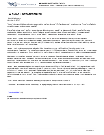 W DNIACH OSTATECZNYCH Published on World Challenge (https://worldchallenge.org) W DNIACH OSTATECZNYCH David Wilkerson October 1, 2015 Teraz ?yjemy w biblijnym okresie znanym jako „pó?ny deszcz” i Bo?y plan zosta? uruchomiony. Po ca?ym ?wiecie wysokie mury miasta szatana upadaj?. Pomy?lcie o tym co si? sta?o z komunizmem. Literalne mury upad?y w Niemczech, Rosji i w ca?ej Europie wschodniej. Miliony ludzi, którzy kiedy? ?yli pod tyrani? szatana, staje si? wolnymi i wielu s?yszy ewangeli? zwiastowan? po raz pierwszy. „Mocni ludzie” kiedy? zatwardzeni w grzechu, teraz wielbi? Boga. Mówi? wam, ?yjemy w szczególnym czasie. Nigdy dot?d nie widzia?em czego? takiego w moich ponad pi??dziesi?ciu latach s?u?by kaznodziejskiej. Nasz zespó? prowadzi? ewangelizacj? w Nigerii i 500 000 ludzi przysz?o w pierwszy wieczór. Jest tam taki g?ód Boga, który wydaje si? bezprecedensowy, kiedy widzimy rzeczy, które kiedy? wydawa?y si? niemo?liwe. Jeden z tych cudów ma miejsce w Iranie. Kilka dekad temu moja ksi??ka Krzy? i sztylet zosta?a tam wydrukowana. Ocenia si?, ?e zosta?o rozprowadzonych 25.000 egzemplarzy. Równie? film Jezus by? pokazywany w tajemnicy dla setek grup. Teraz setki tysi?cy Ira?czyków przyjmuj? zbawienie poprzez takie poselstwa ewangelii. Niedawno otrzyma?em poruszaj?cy raport na temat programu Teen Challenge w kraju ?rodkowego Wschodu, którego nazwy nie mog? podawa?. Ten Islamski kraj jest n?kany przez alkoholizm i narkotyki. W?adze tego kraju przyznaj?, ?e ten problem ich przerasta, ale poprzez wybawiaj?c? moc Jezusa Chrystusa, program Teen Challenge wyprodukowa? setki absolwentów, którzy zostali zbawieni, wyratowani i uwolnieni. Jeden z jego absolwentów jest tam teraz liderem denominacji Zielono?wi?tkowej. Mówi?, ?e bos narodowej mafii narkotykowej uczestniczy? w ceremonii zako?czenia programu. Ten prominentny lider Islamski s?ysza? dziesi?tki m?odych m??czyzn, którzy wstawali i ?wiadczyli o tym, jak Jezus uzdrowi? ich z ich uzale?nienia. (Ten bos prawdopodobnie nie wiedzia?, ?e ponad stu absolwentów posz?o, aby zak?ada? ko?cio?y w tym narodzie). W?adze tego kraju teraz uznaj? Teen Challenge jako najbardziej skuteczny program w walce z narkotykami w tym kraju. To si? dzieje po ca?ym ?wiecie w niewiarygodny sposób. Mury szatana upadaj?! „I stanie si? w ostateczne dni, mówi Bóg, ?e wylej? Mojego Ducha na wszelkie cia?o” (Dz. Ap. 2:17). Download PDF [1] Links [1] http://sermons.worldchallenge.org/printpdf/6050/ Page 1 of 1