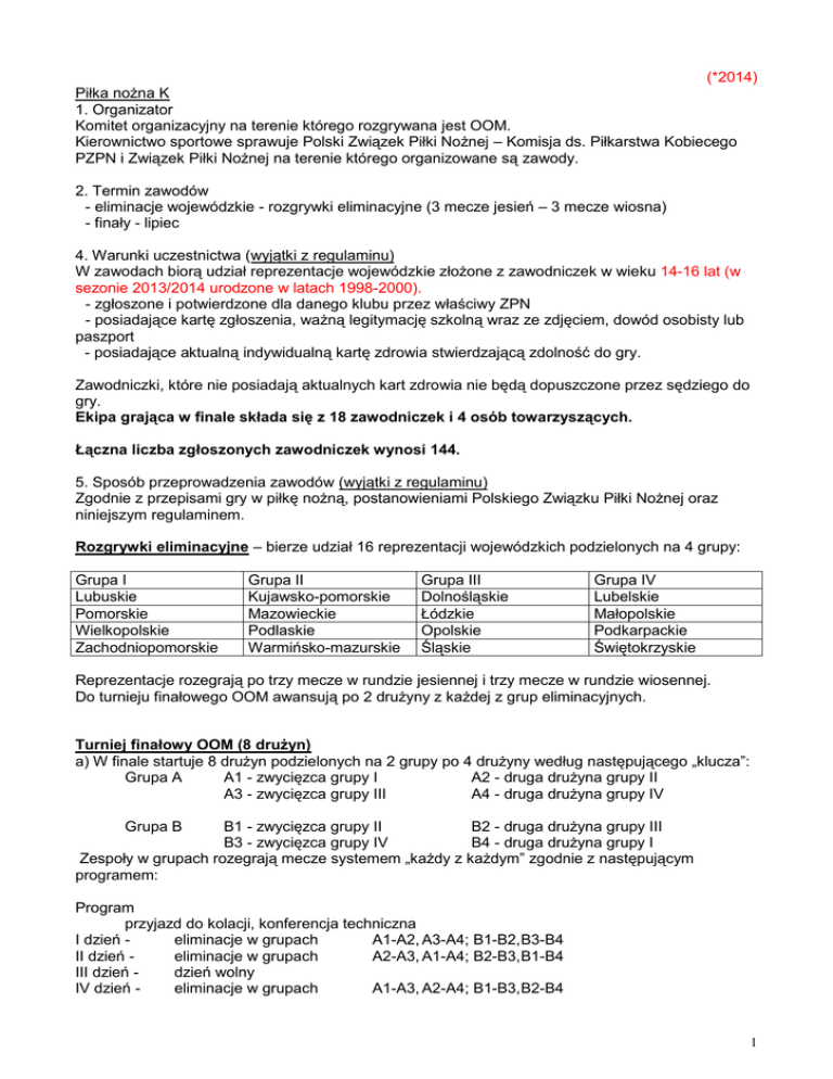 (*2014) Piłka nożna K 1. Organizator Komitet organizacyjny na terenie którego rozgrywana jest OOM. Kierownictwo sportowe sprawuje Polski Związek Piłki Nożnej – Komisja ds. Piłkarstwa Kobiecego PZPN i Związek Piłki Nożnej na terenie którego organizowane są zawody. 2. Termin zawodów - eliminacje wojewódzkie - rozgrywki eliminacyjne (3 mecze jesień – 3 mecze wiosna) - finały - lipiec 4. Warunki uczestnictwa (wyjątki z regulaminu) W zawodach biorą udział reprezentacje wojewódzkie złożone z zawodniczek w wieku 14-16 lat (w sezonie 2013/2014 urodzone w latach 1998-2000). - zgłoszone i potwierdzone dla danego klubu przez właściwy ZPN - posiadające kartę zgłoszenia, ważną legitymację szkolną wraz ze zdjęciem, dowód osobisty lub paszport - posiadające aktualną indywidualną kartę zdrowia stwierdzającą zdolność do gry. Zawodniczki, które nie posiadają aktualnych kart zdrowia nie będą dopuszczone przez sędziego do gry. Ekipa grająca w finale składa się z 18 zawodniczek i 4 osób towarzyszących. Łączna liczba zgłoszonych zawodniczek wynosi 144. 5. Sposób przeprowadzenia zawodów (wyjątki z regulaminu) Zgodnie z przepisami gry w piłkę nożną, postanowieniami Polskiego Związku Piłki Nożnej oraz niniejszym regulaminem. Rozgrywki eliminacyjne – bierze udział 16 reprezentacji wojewódzkich podzielonych na 4 grupy: Grupa I Lubuskie Pomorskie Wielkopolskie Zachodniopomorskie Grupa II Kujawsko-pomorskie Mazowieckie Podlaskie Warmińsko-mazurskie Grupa III Dolnośląskie Łódzkie Opolskie Śląskie Grupa IV Lubelskie Małopolskie Podkarpackie Świętokrzyskie Reprezentacje rozegrają po trzy mecze w rundzie jesiennej i trzy mecze w rundzie wiosennej. Do turnieju finałowego OOM awansują po 2 drużyny z każdej z grup eliminacyjnych. Turniej finałowy OOM (8 drużyn) a) W finale startuje 8 drużyn podzielonych na 2 grupy po 4 drużyny według następującego „klucza”: Grupa A A1 - zwycięzca grupy I A2 - druga drużyna grupy II A3 - zwycięzca grupy III A4 - druga drużyna grupy IV B1 - zwycięzca grupy II B2 - druga drużyna grupy III B3 - zwycięzca grupy IV B4 - druga drużyna grupy I Zespoły w grupach rozegrają mecze systemem „każdy z każdym” zgodnie z następującym programem: Grupa B Program przyjazd do kolacji, konferencja techniczna I dzień eliminacje w grupach A1-A2, A3-A4; B1-B2, B3-B4 II dzień eliminacje w grupach A2-A3, A1-A4; B2-B3, B1-B4 III dzień dzień wolny IV dzień eliminacje w grupach A1-A3, A2-A4; B1-B3, B2-B4 1 (mecze w grupach winny odbywać się o tej samej godzinie) V dzień drużyny, które zajmą miejsca 1 i 2 awansują do meczów półfinałowych, natomiast drużyny z miejscami 3 i 4 będą rywalizowały o miejsca 5-8 według programu: zwycięzca grupy A (C1) – drużyna z II miejsca z grupy B (C2) zwycięzca grupy B (C3) – drużyna z II miejsca z grupy A (C4) drużyna z III miejsca z grupy A (D1) – drużyna z IV miejsca z grupy B (D2) drużyna z III miejsca z grupy B (D3) – drużyna z IV miejsca z grupy A (D4) VI dzień dzień wolny VII dzień mecz o 7 miejsce przegrany z meczu D1-D2 - przegrany z meczu D3-D4 mecz o 5 miejsce zwycięzca meczu D1-D2 - zwycięzca meczu D3-D4 mecz o 3 miejsce przegrany z meczu C1-C2 - przegrany z meczu C3-C4 mecz o 1 miejsce zwycięzca meczu C1-C2 - zwycięzca meczu C3-C4 zakończenie OOM, wyjazd po obiedzie liczba uczestników: zawodników - 144, trenerów - 32, sędziów - 12, pzs - 2 5a. Przepisy gry (wyjątki z regulaminu) - województwo może zgłosić do rozgrywek dowolną liczbę zawodniczek, ale w meczach na poszczególnych ich etapach może występować maksymalnie 18 - zawodniczki mogą występować w całym cyklu rozgrywek tylko w jednej kadrze wojewódzkiej, - zawody rozgrywane są na boiskach pełnowymiarowych, - drużyna na boisku składa się z 11 zawodniczek - obowiązuje przepis o spalonym - mecze rozgrywane są piłką nr 5 - drużyna przyjezdna musi posiadać 2 komplety różniących się kolorami strojów, - zawodniczki rozgrywają mecze w butach z „laną” podszewką, - obowiązują ochraniacze piłkarskie, - czas gry: w turnieju eliminacyjnym 2 x 40 minut, przerwa 15 minut, w turnieju finałowym 2 x 30 minut, przerwa 15 minut - mecze rozgrywane na boiskach trawiastych bądź sztucznych. Organizator obowiązany jest do podania informacji, gdzie rozgrywane będą mecze do Komisji ds. Piłkarstwa Kobiecego PZPN w terminie do 14 dni przed ich planowanym rozpoczęciem, - dozwolona jest zmiana 7 zawodniczek bez prawa powrotu, - w turnieju obowiązują kary wynikające z przepisów gry w piłkę nożną (żółte i czerwone kartki), które pociągają za sobą następujące konsekwencje:. - zawodniczka, która została ukarana drugim napomnieniem (żółta kartka) w turnieju nie może wystąpić w następnym meczu turnieju, - zawodniczka, która została ukarana drugim napomnieniem w meczu (żółta kartka a w konsekwencji czerwona kartka) jest odsunięta od gry w danym meczu, - zawodniczka ukarana napomnieniem w meczu (żółta kartka), a następnie wykluczona z gry (czerwona kartka) zostanie odsunięta od gry w następnym meczu, - zawodniczka wykluczona z gry (czerwona kartka) za faul taktyczny jest odsunięta od gry w danym meczu, - wysokość kary za wykluczenie z innej przyczyny, uzależniona jest od stopnia i rodzaju przewinienia. Karę orzeka Komisja Techniczno-Dyscyplinarna turnieju, w skład której wchodzi sędzia główny oraz przedstawiciel Komisji ds. Piłkarstwa Kobiecego PZPN. Kryteria ustalania kolejności miejsc w turniejach eliminacyjnych oraz wyłaniania zwycięzcy w meczach, które muszą zakończyć się wynikiem rozstrzygniętym. - o kolejności zespołów w rozgrywkach eliminacyjnych decyduje ilość zdobytych punktów w 6 meczach, - przy równej ilości punktów uzyskanych przez 2 drużyny, o zajętym miejscu decyduje kolejno: a) ilość punktów zdobyta w meczach między zainteresowanymi zespołami, b) korzystniejsza 