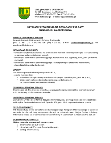 URZĄD GMINY ŁUBNIANY 46-024 Łubniany, ul. Opolska 104 telefon: 077/ 42-70-533 fax: 077/42-15-024 www.lubniany.pl e-mail: [email protected] UZYSKANIE ZEZWOLENIA NA POSIADANIE PSA RASY UZNAWANEJ ZA AGRESYWNĄ MIEJSCE ZAŁATWIENIA SPRAWY Referat Gospodarki Gruntami i Ochrony Środowiska pok. 1, tel. (77) 4 270 591 lub (77) 4 270 592 e-mail: [email protected] lub [email protected] WYMAGANE DOKUMENTY - wniosek o wydanie zezwolenia na prowadzenie hodowli lub utrzymanie psa rasy uznawanej za agresywną (wg ustalonego wzoru), - kserokopia dokumentu potwierdzającego pochodzenie psa, jego rasę, wiek, płeć (rodowód, metryka), - kserokopia dokumentu potwierdzającego zaszczepienie psa przeciwko wściekliźnie, - dowód zapłaty opłaty skarbowej. OPŁATY - w formie opłaty skarbowej w wysokości 82 zł, - opłatę można uiścić: w budynku Urzędu Gminy w Łubnianach przy ul. Opolskiej 104, pok. 16 (Kasa), przelewem na konto Banku Spółdzielczego w Łubnianach nr 28 8897 0004 2001 0000 0257 0002 TERMIN ZAŁATWIENIA SPRAWY Do miesiąca od dnia złożenia wniosku, a w przypadku spraw szczególnie skomplikowanych – do 2 miesięcy od dnia złożenia wniosku. SPOSÓB ZAŁATWIENIA SPRAWY Zezwolenie wydaje się w formie decyzji administracyjnej. Decyzję można odebrać osobiście w Urzędzie Gminy w Łubnianach ul. Opolska 104, pok. 1 lub za pośrednictwem poczty. TRYB ODWOŁAWCZY Od decyzji służy prawo odwołania do Samorządowego Kolegium Odwoławczego w Opolu w terminie 14 dni od daty otrzymania decyzji za pośrednictwem Wójta Gminy Łubniany. Odwołania składa się w sekretariacie Urzędu Gminy w Łubnianach ul. Opolska 104, pok. 18 DODATKOWE INFORMACJE Wykaz ras psów uznawanych za agresywne: 1. amerykański pit bull terier; 2. pies z Majorki (Perro de Presa Mallorquin); 3. buldog amerykański; 4. dog argentyński; 5. pies kanaryjski (Perro de Presa Canario); 6. tosa inu; 7. rottweiler; 8. akbash dog; 9. anatolian karabash; 10. moskiewski stróżujący; 11. owczarek kaukaski. Wniosek o wydanie zezwolenia składa się w urzędzie właściwym ze względu na planowane miejsce prowadzenia hodowli lub utrzymywanie psa, Właściciel psa jest zobowiązany do powiadomienia organu wydającego zezwolenie o zmianie określonego w decyzji miejsca utrzymywania psa oraz o zbyciu lub śmierci zwierzęcia w ciągu 14 dni od daty zaistniałej zmiany, Właściciel psa zobowiązany jest do przedstawienia wydanej decyzji właścicielowi lub zarządcy nieruchomości, w której utrzymywany jest pies w terminie 14 dni od daty jej otrzymania. PODSTAWA PRAWNA 1. Ustawa z dnia 21 sierpnia 1997 r. o ochronie zwierząt (Dz. U. z 2003 r. Nr 106, poz. 1002 ze zmianami). 2. Ustawa 16 listopada 2006 r. o opłacie skarbowej (Dz. U. z 2006 r. Nr 225, poz. 1635 ze zmianami). 3. Ustawa z dnia 14 czerwca 1960 r. Kodeks postępowania administracyjnego (Dz. U. z 2000 r. Nr 98, poz. 1071 ze zmianami). 4. Rozporządzenie Ministra Spraw Wewnętrznych i Administracji z dnia 28 kwietnia 2003 r. w sprawie wykazu ras psów uznawanych za agresywne (Dz. U. z 2003 r. Nr 77, poz. 687)