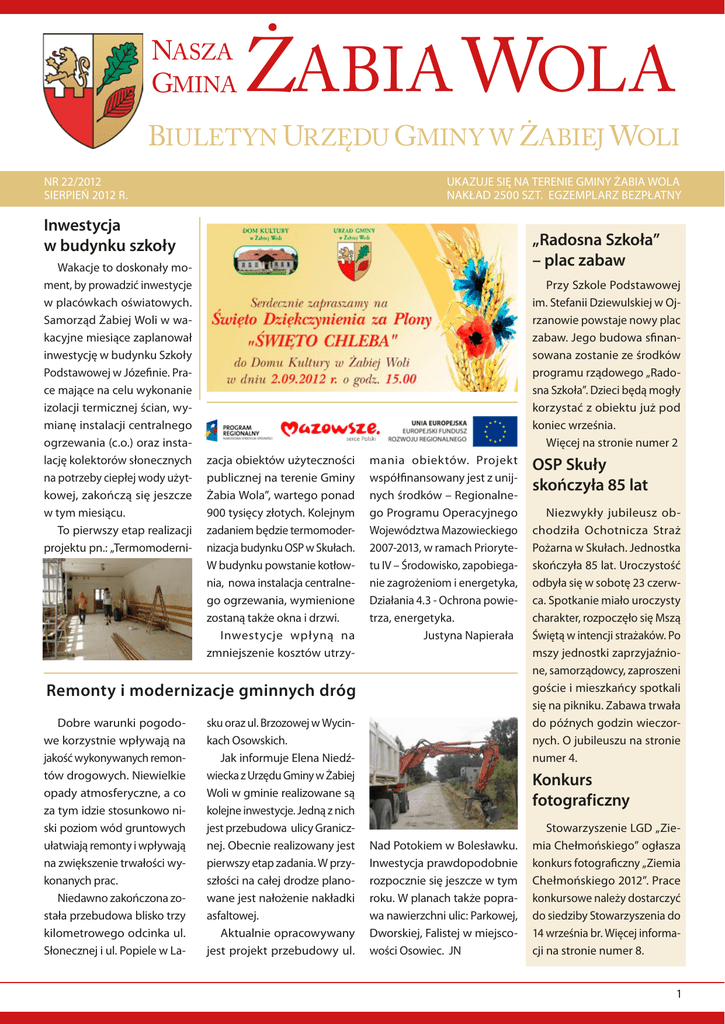 Nasza Gmina Żabia Wola Biuletyn Urzędu Gminy w Żabiej Woli UKAZUJE SIĘ NA TERENIE GMINY ŻABIA WOLA NAKŁAD 2500 SZT. EGZEMPLARZ BEZPŁATNY NR 22/2012 SIERPIEŃ 2012 R. Inwestycja w budynku szkoły Wakacje to doskonały moment, by prowadzić inwestycje w placówkach oświatowych. Samorząd Żabiej Woli w wakacyjne miesiące zaplanował inwestycję w budynku Szkoły Podstawowej w Józefinie. Prace mające na celu wykonanie izolacji termicznej ścian, wymianę instalacji centralnego ogrzewania (c.o.) oraz instalację kolektorów słonecznych na potrzeby ciepłej wody użytkowej, zakończą się jeszcze w tym miesiącu. To pierwszy etap realizacji projektu pn.: „Termomoderni- „Radosna Szkoła” – plac zabaw Przy Szkole Podstawowej im. Stefanii Dziewulskiej w Ojrzanowie powstaje nowy plac zabaw. Jego budowa sfinansowana zostanie ze środków programu rządowego „Radosna Szkoła”. Dzieci będą mogły korzystać z obiektu już pod koniec września. Więcej na stronie numer 2 zacja obiektów użyteczności publicznej na terenie Gminy Żabia Wola”, wartego ponad 900 tysięcy złotych. Kolejnym zadaniem będzie termomodernizacja budynku OSP w Skułach. W budynku powstanie kotłownia, nowa instalacja centralnego ogrzewania, wymienione zostaną także okna i drzwi. Inwestycje wpłyną na zmniejszenie kosztów utrzy- mania obiektów. Projekt współfinansowany jest z unijnych środków – Regionalnego Programu Operacyjnego Województwa Mazowieckiego 2007-2013, w ramach Priorytetu IV – Środowisko, zapobieganie zagrożeniom i energetyka, Działania 4.3 - Ochrona powietrza, energetyka. Justyna Napierała Remonty i modernizacje gminnych dróg Dobre warunki pogodowe korzystnie wpływają na jakość wykonywanych remontów drogowych. Niewielkie opady atmosferyczne, a co za tym idzie stosunkowo niski poziom wód gruntowych ułatwiają remonty i wpływają na zwiększenie trwałości wykonanych prac. Niedawno zakończona została przebudowa blisko trzy kilometrowego odcinka ul. Słonecznej i ul. Popiele w La- sku oraz ul. Brzozowej w Wycinkach Osowskich. Jak informuje Elena Niedźwiecka z Urzędu Gminy w Żabiej Woli w gminie realizowane są kolejne inwestycje. Jedną z nich jest przebudowa ulicy Granicznej. Obecnie realizowany jest pierwszy etap zadania. W przyszłości na całej drodze planowane jest nałożenie nakładki asfaltowej. Aktualnie opracowywany jest projekt przebudowy ul. OSP Skuły skończyła 85 lat Niezwykły jubileusz obchodziła Ochotnicza Straż Pożarna w Skułach. Jednostka skończyła 85 lat. Uroczystość odbyła się w sobotę 23 czerwca. Spotkanie miało uroczysty charakter, rozpoczęło się Mszą Świętą w intencji strażaków. Po mszy jednostki zaprzyjaźnione, samorządowcy, zaproszeni goście i mieszkańcy spotkali się na pikniku. Zabawa trwała do późnych godzin wieczornych. O jubileuszu na stronie numer 4. Konkurs fotograficzny Nad Potokiem w Bolesławku. Inwestycja prawdopodobnie rozpocznie się jeszcze w tym roku. W planach także poprawa nawierzchni ulic: Parkowej, Dworskiej, Falistej w miejscowości Osowiec. JN Stowarzyszenie LGD „Ziemia Chełmońskiego” ogłasza konkurs fotograficzny „Ziemia Chełmońskiego 2012”. Prace konkursowe należy dostarczyć do siedziby Stowarzyszenia do 14 września br. Więcej informacji na stronie numer 8. 1 Witam serdecznie naszych mieszkańców i gości gminy w kolejnym wydaniu biuletynu. Drodzy Czytelnicy mam nadzieję, że czas wakacji daje Wam wypoczynek i radość. Samorząd – mimo pełni lata pracuje na wysokich obrotach. W naszym kwartalniku znajdziecie Państwo aktualności z życia naszej gminy. Mamy interesujące informacje o nowych inwestycjach tj. budowa placu zabaw w Ojrzanowie, remonty dróg. Nie zabraknie również sprawozdania z uroczystych obchodów 85-lecia Ochotniczej Straży Pożarnej w Skułach oraz z imprezy plenerowej zorganizowanej przez Stowarzyszenie „Szansa” W tym wydaniu tradycyjnie już odwiedzimy naszych sołtysów. Na koniec dziękuję wszystkim Państwu: radnym, sołtysom za udzielone absolutorium z tytułu wykonania budżetu za zeszły rok. Taka decyzja Państwa daje wielką satysfakcję. Razem możemy i potrafimy iść do przodu, tworzyć lepsze warunki życia. Serdecznie pozdrawiam i życzę przyjemnej lektury. Plac zabaw w ramach ,,Radosnej Szkoły” Bezpieczne place zabaw, które powstały w ramach programu rządowego ,,Radosna Szkoła” cieszą się ogromnym zainteresowaniem mieszkańców. Nawierzchnia syntetyczna oraz wysokiej jakości wyposażenie obiektów zapewniają bezpieczeństwo i gwarantują maluchom dobrą zabawę na świeżym powietrzu. Na placach zabaw przy Szkole Podstawowej im. Kawalerów Orderu Uśmiechu w Józefinie oraz przy Szkole Podstawowej im. Marii Kownackiej w Skułach zawsze można spotkać bawiące się dzieci. Trwa budowa kolejnego placu zabaw, powstaje on przy Szkole Podstawowej im. Stefanii Dziewulskiej w Ojrzanowie. Planowany termin zakończenia inwestycji to 28 sierpnia br. Koszt realizacji zadania wynosi ponad 123 tysiące złotych. JN Usuwanie azbestu Gmina w dniu 31 lipca br. podpisała umowę z Wojewódzkim Funduszem Ochrony Środowiska i Gospodarki Wodnej w Warszawie na dofinansowanie zadania pn. „Usuwanie wyrobów/odpadów (demontaż, zbiórka, transport i utylizacja) zawierających azbest z terenu Gminy Żabia Wola”. Dotacja w kwocie 61.793,59 zł stanowi 100% przewidywanych całkowitych kosztów brutto zadania, którego realizacja zakończy się w dniu 30 września 2012 r. Ilość odpadów azbestowych przeznaczonych do utylizacji w ramach zadania wynosi 151,36 Mg. Małgorzata Reszka Rusza program ,,Wyprawka szkolna” W gminie Żabia Wola rusza program ,,Wyprawka szkolna” - informuje dyrektor Zespołu Obsługi Placówek Oświatowych w Żabiej Woli Justyna Wodnicka-Żuk. Dofinansowanie do zakupu podręczników wynosi maksymalnie: • 180 zł dla uczniów klas I-III szkoły podstawowej oraz niepełnosprawnych uczniów k