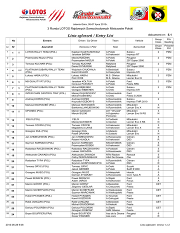 Jelenia Góra, 05-07 lipca 2013r. 3 Runda LOTOS Rajdowych Samochodowych Mistrzostw Polski dokument nr: 5.1 Lista zgłoszeń / Entry List No Entrant Driver / Co-Driver Team Vehicle Group Class FIA Seeding Lp. Nr Zawodnik Kierowca / Pilot Klub Samochód Grupa Klasa Priorytet FIA 1 1 2 LOTOS RALLY TEAM (POL) Kajetan KAJETANOWICZ Jarosław BARAN A.Polski A.Krakowski Subaru Impreza RT 2 PZM 2 Przemysław Mazur (POL) Maciej RZEŹNIK Przemysław MAZUR A.Polski A.Polski Peugeot 207 Super 2000 2 PZM 3 3 Tomasz KUCHAR (POL) Tomasz KUCHAR Daniel DYMURSKI Rallyland Rallyland Peugeot 207 Super 2000 2 PZM 4 4 PLATINUM SUBARU RALLY TEAM (POL) Wojciech CHUCHAŁA Kamil HELLER A.Beskidzki A.Cieszyński Subaru Impreza STI 2 PZM 5 5 Łukasz HABAJ (POL) Łukasz HABAJ Piotr WOŚ M.S. Gliwice M.S. Gliwice Mitsubishi Lancer Evo IX 2 PZM 6 6 S NB QUALITY RT (POL) Jarosław KOŁTUN Ireneusz PLESKOT A.Polski A.Polski Ford Fiesta RRC 2 PZM 7 7 S PLATINUM SUBARU RALLY TEAM (POL) Michał BĘBENEK Grzegorz BĘBENEK A.Orski A.Orski Subaru Impreza STI 2 PZM 8 8 S INTER CARS CASTROL TRW (POL) Maciej OLEKSOWICZ Michał KUŚNIERZ A.Rzemieślnik A.Orski Ford Fiesta S 2000 2 9 9 Andrzej KOPER (POL) Andrzej KOPER Krzysztof GĘBORYS A.Rzemieślnik A.Rzemieślnik Subaru Impreza TMR 2010 2 10 10 Mariusz NOWOCIEŃ (POL) Mariusz NOWOCIEŃ Bartłomiej JAKUBOWSKI A.Rzemieślnik A.Rzemieślnik Mitsubishi Lancer Evo X 3 N 11 11 OPONEO (POL) Marcin GAGACKI Marcin BILSKI LKT "Wyczół" A.KujawskoPomorski Mitsubishi Lancer Evo IX RS 3 N 12 12 FELIX (POL) FELIX Maciej GLEIXNER A.Podlaski A.Opolski Mitsubishi Lancer Evo X RS 3 N 13 14 Tomasz CZOPIK (POL) Tomasz CZOPIK Magdalena LUKAS A.Krakowski A.Krakowski Mitsubishi Lancer Evo X 3 N 14 15 Grzegorz DUL (POL) Grzegorz DUL Paweł DRAHAN A.Mielecki A.Sudecki Mitsubishi Lancer Evo 3 N 15 16 Jan CHMIELEWSKI (POL) Jan CHMIELEWSKI Robert HUNDLA A.Rzeszowski A.Krakowski Citroen DS3 5 R 16 17 Szymon KORNICKI (POL) Szymon KORNICKI Przemysław BOSEK KKCiM SMOK A.Krakowski Citroen DS3 5 R 17 18 Radosław RACZKOWSKI (POL) Radosław RACZKOWSKI Łukasz GWIAZDA A.Podlaski A.Rzeszowski Citroen DS3 5 R 18 19 Aleksander ZAWADA (POL) Aleksander ZAWADA Cathy DEROUSSEAUX RTM Radom ASA De Grasse Renault Clio 5 R 19 20 Radosław TYPA (POL) Radosław TYPA Szymon GOSPODARCZYK A.Rzemieślnik A.Polski Citroen DS3 5 R 20 21 Tomasz GRYC (POL) Tomasz GRYC Jakub GERBER A.Orski A.Polski Suzuki Swift S1600 5 A 21 22 Grzegorz MUSZ (POL) Grzegorz MUSZ Damian ZYGMUNT A.Małopolski A.Rzeszowski Honda Civic Type-R 5 A 22 23 Paweł SERAFIN (POL) Paweł SERAFIN Adam JAROS A.Śląski A.Karkonoski Ford Focus 5 A 23 57 Marcin GÓRNY (POL) Marcin GÓRNY Zbigniew CIEŚLAR A.Beskidzki A.Cieszyński Ford Fiesta CET 24 54 Marcin SCHEFFLER (POL) Marcin SCHEFFLER Szymon MARCINIAK A.Wielkopolski A.Wielkopolski Ford Fiesta CET 25 55 Hubert PTASZEK (POL) Hubert PTASZEK Kamil KOZDROŃ A.Toruński A.Galicyjski Ford Fiesta CET 26 53 Rafał JANCZAK (POL) Rafał JANCZAK Michał GRUDZIŃSKI A.Beskidzki A.Kielecki Ford Fiesta CET 27 56 Dariusz POLOŃSKI (POL) Dariusz POLOŃSKI Grzegorz DOBOSZ A.Śląski AMK Gliwice Ford Fiesta CET 28 24 Bryan BOUFFIER (FRA) Bryan BOUFFIER Xavier PANSERI Asa de la Drome Asa Jura Peugeot 208 S SP S 2013-06-28 9:08 6 R Lista zgłoszeń strona 1 z 2 No Entrant Driver / Co-Driver Team Vehicle Group Class FIA Seeding Lp. Nr Zawodnik Kierowca / Pilot Klub Samochód Grupa Klasa Priorytet FIA 29 25 Tomasz KASPERCZYK (POL) Tomasz KASPERCZYK Damian SYTY ŁZM Motosportklub ŁZM Motosportklub Skoda Fabia 6 R 30 26 Łukasz BYŚKINIEWICZ (POL) Łukasz BYŚKINIEWICZ Maciej WISŁAWSKI A.Polski A.Polski Ford Fiesta 6 R 31 27 Sylwester PŁACHYTKA (POL) Sylwester PŁACHYTKA Maciej MACHELA AZK Kłodzko AZK Kłodzko Citroen C2R2 Max 6 R 32 28 Krzysztof SCHENK (POL) Krzysztof SCHENK Maciej HANDWERKER A.Polski A.Krakowski Peugeot 206 6 A 33 29 Grzegorz PENDYK (POL) Grzegorz PENDYK Marcin BANDURA A.Dolny Śląsk A.Dolny Śląsk Citroen C2 6 A 34 30 HERBI (POL) HERBI Bartosz HOLDENMAYER A.Leszczyński A.Leszczyński Honda Civic Type-R 8 N 35 31 Mirosław WŁODARCZYK (POL) Mirosław WŁODARCZYK Krzysztof GRZENIA A.Galicyjski A.Śląski Renault Clio Ragnotti 8 N 36 32 Łukasz LEWANDOWSKI (POL) Łukasz LEWANDOWSKI Łukasz WŁOCH A.Rzemieślnik A.Karkonoski Honda Civic Type-R 8 N 37 33 Jacek JURECKI (POL) Jacek JURECKI Paweł GACEK A.Beskidzki A.Beskidzki Honda Civic 8 N 38 34 Grzegorz SIKORSKI (POL) Grzegorz SIKORSKI Michał JURGAŁA A.Kielecki A.Krakowski Ford Fiesta 8 N 39 35 Paweł WINCZASZEK (POL) Paweł WINCZASZEK Paweł SKRZYWAN A.Karkonoski A.Polski Opel Astra HR 40 36 Paweł HANKIEWICZ (POL) Paweł HANKIEWICZ Jarosław HRYNIUK A.Rzemieślnik TMSM Sparta Wrocław Renault Clio HR 41 37 Antoni MALINOWSKI (POL) Antoni MALINOWSKI Łukasz BIERNOT A.Polski A.Beskidzki Peugeot 306 HR 42 38 Łukasz RYZNAR (POL) Łukasz RYZNAR Łukasz LACHTERA A.Karkonoski A.Karkonoski Opel Kadett HR 43 39 Arkadiusz URBANOWICZ (POL) Arkadiusz URBANOWICZ Łukasz BUŁAT A.Karkonoski A.Karkonoski BMW M3 HR 44 40 Robert WIŚNIEWSKI (POL) Robert WIŚNIEWSKI Krzysztof ZUBIK A.Sudecki A.Polski BMW M3 HR Dyrektor Rajdu Marek Kisiel 2013-06-28 9:08 Lista zgłoszeń strona 2 z 2