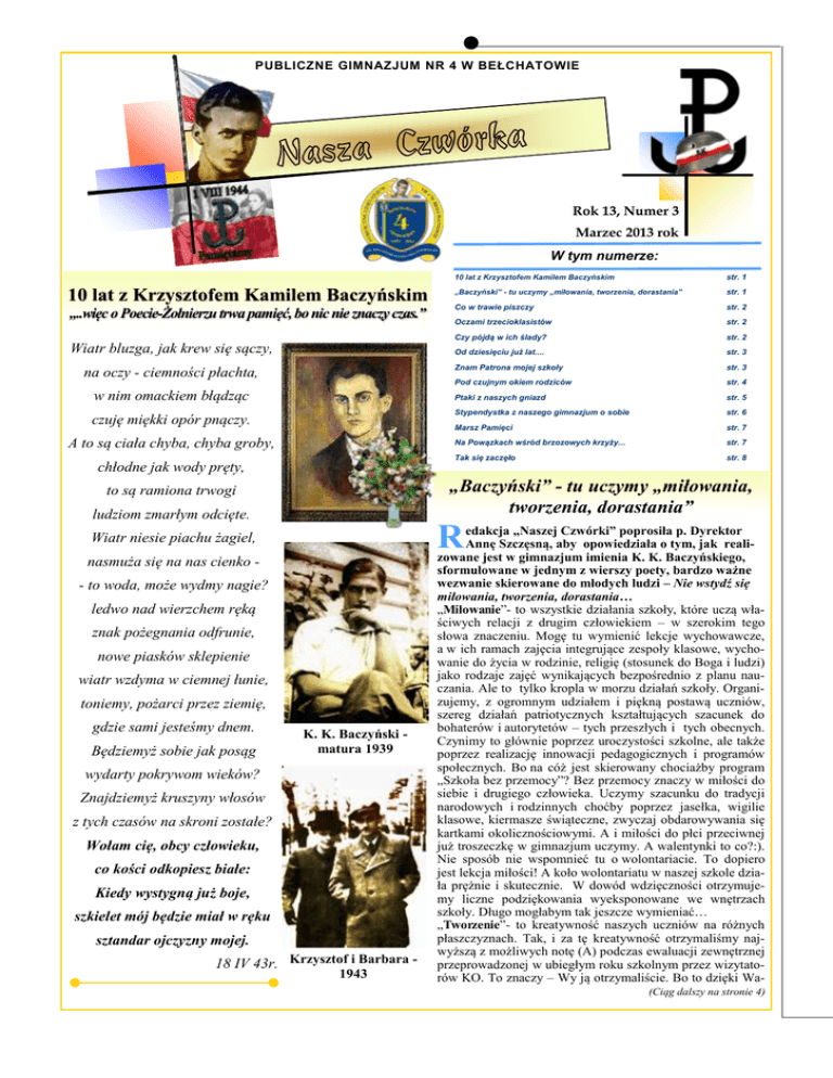 PUBLICZNE GIMNAZJUM NR 4 W BEŁCHATOWIE Rok Numer Marzec 2013 rok W tym numerze: 10 lat z Krzysztofem Kamilem Baczyńskim str. 1 „Baczyński” - tu uczymy „miłowania, tworzenia, dorastania” str. 1 Co w trawie piszczy str. 2 Oczami trzecioklasistów str. 2 Czy pójdą w ich ślady? str. 2 Od dziesięciu już lat.... str. 3 Znam Patrona mojej szkoły str. 3 Pod czujnym okiem rodziców str. 4 Ptaki z naszych gniazd str. 5 czuję miękki opór pnączy. Stypendystka z naszego gimnazjum o sobie str. 6 Marsz Pamięci str. 7 A to są ciała chyba, chyba groby, Na Powązkach wśród brzozowych krzyży... str. 7 Tak się zaczęło str. 8 10 lat z Krzysztofem Kamilem Baczyńskim „..więc o Poecie-Żołnierzu trwa pamięć, bo nic nie znaczy czas.” Wiatr bluzga, jak krew się sączy, na oczy - ciemności płachta, w nim omackiem błądząc chłodne jak wody pręty, „Baczyński” - tu uczymy „miłowania, tworzenia, dorastania” to są ramiona trwogi ludziom zmarłym odcięte. R Wiatr niesie piachu żagiel, nasmuża się na nas cienko - to woda, może wydmy nagie? ledwo nad wierzchem ręką znak pożegnania odfrunie, nowe piasków sklepienie wiatr wzdyma w ciemnej łunie, toniemy, pożarci przez ziemię, gdzie sami jesteśmy dnem. Będziemyż sobie jak posąg K. K. Baczyński matura 1939 wydarty pokrywom wieków? Znajdziemyż kruszyny włosów z tych czasów na skroni zostałe? Wołam cię, obcy człowieku, co kości odkopiesz białe: Kiedy wystygną już boje, szkielet mój będzie miał w ręku sztandar ojczyzny mojej. 18 IV 43r. Krzysztof i Barbara 1943 edakcja „Naszej Czwórki” poprosiła p. Dyrektor Annę Szczęsną, aby opowiedziała o tym, jak realizowane jest w gimnazjum imienia K. K. Baczyńskiego, sformułowane w jednym z wierszy poety, bardzo ważne wezwanie skierowane do młodych ludzi – Nie wstydź się miłowania, tworzenia, dorastania… „Miłowanie”- to wszystkie działania szkoły, które uczą właściwych relacji z drugim człowiekiem – w szerokim tego słowa znaczeniu. Mogę tu wymienić lekcje wychowawcze, a w ich ramach zajęcia integrujące zespoły klasowe, wychowanie do życia w rodzinie, religię (stosunek do Boga i ludzi) jako rodzaje zajęć wynikających bezpośrednio z planu nauczania. Ale to tylko kropla w morzu działań szkoły. Organizujemy, z ogromnym udziałem i piękną postawą uczniów, szereg działań patriotycznych kształtujących szacunek do bohaterów i autorytetów – tych przeszłych i tych obecnych. Czynimy to głównie poprzez uroczystości szkolne, ale także poprzez realizację innowacji pedagogicznych i programów społecznych. Bo na cóż jest skierowany chociażby program „Szkoła bez przemocy”? Bez przemocy znaczy w miłości do siebie i drugiego człowieka. Uczymy szacunku do tradycji narodowych i rodzinnych choćby poprzez jasełka, wigilie klasowe, kiermasze świąteczne, zwyczaj obdarowywania się kartkami okolicznościowymi. A i miłości do płci przeciwnej już troszeczkę w gimnazjum uczymy. A walentynki to co?:). Nie sposób nie wspomnieć tu o wolontariacie. To dopiero jest lekcja miłości! A koło wolontariatu w naszej szkole działa prężnie i skutecznie. W dowód wdzięczności otrzymujemy liczne podziękowania wyeksponowane we wnętrzach szkoły. Długo mogłabym tak jeszcze wymieniać… „Tworzenie”- to kreatywność naszych uczniów na różnych płaszczyznach. Tak, i za tę kreatywność otrzymaliśmy najwyższą z możliwych notę (A) podczas ewaluacji zewnętrznej przeprowadzonej w ubiegłym roku szkolnym przez wizytatorów KO. To znaczy – Wy ją otrzymaliście. Bo to dzięki Wa(Ciąg dalszy na stronie 4) STR. 2 NASZA CZWÓRKA Rorate caeli desuper 1. Nasze sukcesy: Boryna to bohater czterotomowej " W dniu 22 stycznia uczniowie za naszeepopei chłopskiej" pt. „Chłopi”, któgo gimnazjum w skłarą dzie: jej autor – S.W. Reymont w roku Aleksandra Szurgot, Szymon 1924 otrzymał literacką nagrodę No-z Rozmarynowski, Łukasz Radoń III d or az Aleksandra Radoń z bla.kl. Powieść pokazuje realistyczny kl. IIżycia d odnieśli duży sukces zajmuobraz zbiorowości chłopskiej jąc II miejsce w konkursie historyczprzełomu XIX i XX wieku. nym o powstaniu styczniowym. KonWigilijny jadłospis: kurs został zorganizowany przez ZSP Buraczany gotowany na wgrzynr 4 im. kwas, Romualda Traugutta 150 rocznicę wybuchu powstania bach z ziemniakami całymi.styczniowego. w mące obtaczane i smażone Śledzie W Konkursie Muzycznym na Gminnym oleju konopnym. zorganizowanym w dniu 9 stycznia br. Pszenne kluski w SZSO nr 2z makiem. pod nazwą "Kreuj się, Kapusta z grzybami, olejem omaszczokto może" I miejsce w kategorii soliści zajęła nasza koleżanna. ka Aleksandra Szurgot. Racuszki z gryczanej mąki z Naszych miodem reprezentantów nie zabrakło także w zatarte i w makowym oleju uprażo-i XII Regionalnym Festiwalu Kolęd ne. Pastorałek w Bełchatowie, który odbył 20.01.2013r.toI miejsce w kategorii ... się a przegryzali wszystko prostym soliści przypadło Oli Szurchlebem, bo plackarównież ni strucli, że z got, II miejsce w kategorii „chóry” mlekiem i masłem były, nie godziło zajął nasz chór "FERMATA", a się w jeśćkategorii dnia tego... „zespół” I miejsce zajęły: Ola Szurgot i Maria Paz(Reymont, „Chłopi”) dyga. Te dwie utalentowane nasze opr. Klaudia Pol koleżanki mogą pochwalić się jeszcze jednym sukcesem. W VIII Wojewódzkim Festiwalu "Kolęda Pieśnią Zgody", który odbył się w Piotrkowie Tryb. w dniu 20.01.2013r. Ola Szurgot zajęła II miejsce w kategorii „soliści”, a II miejsce w kategorii „zespoły” przypadło obydwu naszym gimnazjalistkom. Ich opiekunem jest Co w trawie piszczy 2. 3. 4. pan Arkadiusz Kruk. GRATULUJEMY! W szkolnym konkursie plastycznym o tematyce zdrowotnej pt. „Sklepik moich marzeń”, którego celem była promowanie zdrowej żywności w naszym sklepiku szkolnym, zwyciężyły: Ania Krzemińska, Monika Małagowska, J