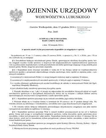 DZIENNIK URZĘDOWY WOJEWÓDZTWA LUBUSKIEGO Gorzów Wielkopolski, dnia 15 grudnia 2016 r. Elektronicznie podpisany przez: Anna Zacharia; LUW Poz. 2645 Data: 2016-12-15 14:17:08 UCHWAŁA NR XVIII/114/2016 RADY GMINY SŁOŃSK z dnia 30 listopada 2016 r. w sprawie zasad i trybu przyznawania stypendiów za osiągnięcia w sporcie Na podstawie art. 31 ust. 1 i 3 ustawy z dnia 25 czerwca 2010r. o sporcie (t. j. Dz. U. z 2016r., poz. 176 ze zm.) uchwala się, co następuje: § 1. Zawodnikom będącym mieszkańcami gminy Słońsk, uprawiającym określoną dyscyplinę sportu, którzy osiągnęli wysokie wyniki sportowe w krajowym lub międzynarodowym współzawodnictwie sportowym i nie są jednocześnie stypendystami z tytułu przynależności do klubu sportowego mającego swoją siedzibę poza terenem gminy Słońsk, mogą być przyznane stypendia. § 2. 1. Stypendium może otrzymać zawodnik w wieku do 21 lat, biorący udział we współzawodnictwie sportowym zgodnie z przepisami odpowiedniego związku sportowego, który spełnił co najmniej jeden z poniższych warunków: 1) uczestniczył w mistrzostwach Polski i w swojej kategorii wiekowej zajął co najmniej 10 miejsce, 2) uczestniczył w międzynarodowych zawodach sportowych, w których zajął co najmniej 15 miejsce, 3) w wyniku eliminacji ogólnokrajowych uzyskał kwalifikacje do udziału w mistrzostwach Polski lub Ogólnopolskiej Olimpiady Młodzieży, 4) jest członkiem kadry narodowej uprawianej dyscypliny sportu. 2. Warunki określone w ust. 1 pkt 1-4 stosuje się odpowiednio do zawodników biorących udział we współzawodnictwie sportowym w dyscyplinach drużynowych, którzy nie są związani z żadnym klubem umową upoważniającą do otrzymywania wynagrodzenia z tytułu uprawiania sportu. § 3. 1. Stypendium sportowe przyznaje się na wniosek zawodnika, jego rodzica lub klubu. 2. Wniosek składa się w Urzędzie Gminy w terminach do 30 czerwca i do 31 grudnia danego roku. We wniosku zawiera się informacje o wnioskodawcy, zawodniku oraz o jego dotychczasowych osiągnięciach. 3. Do wniosku należy dołączyć dokumenty potwierdzające dotychczasowe osiągnięcia oraz plan startów i przygotowań zawodnika na najbliższe 12 miesięcy. § 4. 1. Stypendium sportowe przyznaje Wójt w ramach środków przeznaczonych na ten cel w budżecie gminy, biorąc pod uwagę w szczególności osiągnięcia sportowe, rodzaj dyscypliny sportu uprawianej przez zawodnika, a także tryb przygotowań i plan startów. Stypendium można przyznać na okres 12 miesięcy lub na okres krótszy, jeżeli jest to uzasadnione trybem przygotowań i planem startów zawodnika, a także możliwościami budżetowymi gminy. 2. Wójt przyznaje stypendium sportowe po zasięgnięciu opinii Komisji Zdrowia, Oświaty, Kultury i Spraw Socjalnych Rady Gminy Słońsk. 3. Miesięczna kwota przyznanego stypendium nie może przekroczyć kwoty 500,00zł. Dziennik Urzędowy Województwa Lubuskiego –2– Poz. 2645 4. Wysokość stypendium, sposób i terminy jego wypłaty określa umowa zawierana przez Wójta z zawodnikiem. 5. Umowa określa w szczególności: 1) wysokość, termin i sposób wypłaty stypendium, 2) zobowiązanie stypendysty do systematycznego treningu, uczestnictwa w zawodach i w życiu sportowym gminy oraz promocji Gminy Słońsk przyznającej stypendium, 3) okoliczności pozbawiające stypendium i sposób jego pozbawienia oraz zobowiązanie do zawiadomienia Wójta o powstaniu tych okoliczności, 4) termin i sposób zwrotu stypendium w przypadku niewykonania umowy, 5) zastrzeżenie o możliwości rozwiązania umowy ze skutkiem natychmiastowym w przypadku nienależytego jej wykonania, 6) oznaczenie klubu sportowego, do którego należy zawodnik. § 5. 1. Zawodnika pozbawia się stypendium sportowego, jeżeli wystąpi przynajmniej jedna z niżej wymienionych okoliczności: 1) zawodnik jest trwale niezdolny do startów lub treningów, 2) zawodnik zaprzestał startów lub treningów lub zakończył karierę sportową, 3) zawodnik został zawieszony w prawach zawodnika, pozbawiony praw zawodnika, zdyskwalifikowany, wykluczony z grupy objętej programem szkolenia, 4) zawodnik podpisał kontrakt zawodowy, uprawniający do otrzymywania wynagrodzenia z tytułu uprawiania sportu w okresie otrzymywania stypendium sportowego, 5) zawodnik utracił zdolność do uprawiania sportu przez okres dłuższy niż trzy miesiące, potwierdzoną orzeczeniem lekarza medycyny sportowej, z zastrzeżeniem ust. 3, 6) zawodnik swoim nagannym lub niegodnym zachowaniem, sprzecznym z zasadami współżycia społecznego lub ogólnie przyjętymi obyczajami, naraził na szwank dobre imię gminy lub klubu sportowego, 7) zawodnik przestał być mieszkańcem gminy Słońsk. 2. Pozbawienie stypendium sportowego następuje począwszy od miesiąca następnego po miesiącu wystąpienia okoliczności wymienionych w ust. 1. 3. W przypadku zaprzestania przez zawodnika uprawiania sportu z przyczyn określonych w ust. 1 pkt 5, stypendium wypłaca się przez okres nie dłuższy niż 3 miesiące od momentu zaprzestania uprawiania sportu. Jeżeli po tym okresie zawodnik nie odzyska zdolności do uprawiania sportu, zostaje pozbawiony stypendium sportowego. 4. Zawodnik i klub sportowy zawodnika mają obowiązek niezwłocznie zawiadomić Wójta o wystąpieniu okoliczności uzasadniających pozbawienie stypendium sportowego. § 6. Wzór wniosku o przyznanie stypendium sportowego zawiera załącznik nr 1 do niniejszej uchwały. § 7. Wykonanie uchwały powierza się Wójtowi Gminy Słońsk. § 8. Uchwała wchodzi w życie po upływie 14 dni od dnia ogłoszenia w Dzienniku Urzędowym Województwa Lubuskiego. Przewodnicząca Rady Gminy Lilla Burkiewicz Dziennik Urzędowy Województwa Lubuskiego –3– Poz. 2645 Załącznik Nr 1 do uchwały nr XVIII/114/2016 Rady Gminy Słońsk z dnia 30 listopada 2016 r. Wniosek o przyznanie stypendium sportowego I. Dane wnioskodawcy – imię, nazwisko, aktualny adres zamieszkania, n