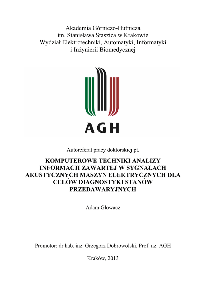 Akademia Górniczo-Hutnicza im. Stanisława Staszica w Krakowie Wydział Elektrotechniki, Automatyki, Informatyki i Inżynierii Biomedycznej Autoreferat pracy doktorskiej pt. KOMPUTEROWE TECHNIKI ANALIZY INFORMACJI ZAWARTEJ W SYGNAŁACH AKUSTYCZNYCH MASZYN ELEKTRYCZNYCH DLA CELÓW DIAGNOSTYKI STANÓW PRZEDAWARYJNYCH Adam Głowacz Promotor: dr hab. inż. Grzegorz Dobrowolski, Prof. nz. AGH Kraków, 2013 1. Cel i zakres pracy Badanie sygnałów akustycznych prowadzone jest aktualnie na świecie w odniesieniu do rozpoznawania: tożsamości mówców, gatunków zwierząt, rodzajów instrumentów muzycznych oraz innych rodzajów sygnałów akustycznych pochodzących ze środowiska naturalnego [1], [2], [3], [4], [6]. Głównym problemem w powoływanych pracach jest dobór metod przetwarzania danych i w konsekwencji metod rozpoznawania, które istotnie zależą od właściwości rozpatrywanego sygnału i celu prowadzonego rozpoznawania. Eksperymenty wykorzystujące sygnały akustyczne do rozpoznawania uszkodzeń urządzeń pojawiły się dość niedawno i tym samym w naturalny sposób nie obejmują szeregu ważnych i interesujących z powodów poznawczych i utylitarnych przypadków technicznych [3], [5], [7]. W sytuacji krótko zarysowanej powyżej pojawia się obiecujący pomysł, aby przeprowadzić badania sygnałów akustycznych również w celu diagnozowania stanów przedawaryjnych maszyn elektrycznych. W przyjętym rozumowaniu powstanie stanu przedawaryjnego interpretowane jest jako zagrożenie istotnym uszkodzeniem maszyny. Często bywa tak, że naprawa maszyny kosztuje mniej, gdy uszkodzenie zostanie wykryte wcześniej i dlatego właśnie badanie stanów przedawaryjnych okazuje się tak ważne. Celem pracy doktorskiej było udowodnienie tezy, że zastosowanie algorytmów rozpoznawania umożliwia użycie metod analizy sygnału akustycznego do efektywnej diagnostyki stanów przedawaryjnych maszyn elektrycznych. Aby osiągnąć ten cel, zrealizowano następujące zadania badawcze: przeanalizowano problemy rozpoznawania stanów przedawaryjnych maszyn elektrycznych, przedyskutowano możliwości zastosowania wybranych metod przetwarzania i analizy sygnału akustycznego, dokonano implementacji poszczególnych metod, opracowano projekt stanowiska diagnostycznego do badania sygnałów akustycznych maszyn elektrycznych, przeprowadzono badania sygnałów akustycznych zmierzające do skonfigurowania metod przetwarzania i analizy w celu uzyskania najlepszej metody rozpoznawania dla wybranych typów maszyn elektrycznych, przeprowadzono weryfikację wyników rozpoznawania sygnałów akustycznych oraz przedstawiono projekt urządzenia monitorującego maszynę elektryczną w trakcie jej eksploatacji. Rozważania prowadzone w pracy doktorskiej dotyczyły dwóch wybranych maszyn elektrycznych. Przeprowadzone badania pokazały, że stany pracy maszyn testowych znajdowały odbicie w sygnałach akustycznych przez nie generowanych w stopniu wystarczającym, aby metody rozpoznające z zadawalającą precyzją wskazywały pojawianie się monitorowanych uszkodzeń. Istotnym czynnikiem wpływającym na uzyskanie wysokiej skuteczności rozpoznawania sygnału akustycznego była długość próbki dźwięku stosowana do rozpoznawania. Wykazano również, iż zmodyfikowany klasyfikator NM z metrykami Manhattan, Euklidesa i Minkowskiego działał najlepiej przy wypracowanych metodach obróbki. Dobre wyniki zostały otrzymane dla przypadku z klasyfikatorem opartym na słowach. Sieć neuronowa z algorytmem wstecznej propagacji błędów miała niższą skuteczność rozpoznawania niż pozostałe klasyfikatory. Spośród algorytmów FFT, LPCC, LPC najlepszą skuteczność rozpoznawania sygnału akustycznego dawały FFT i LPCC. Podsumowując wyniki eksperymentów, można stwierdzić, że teza dysertacji została udowodniona. Oryginalnymi elementami przedstawionej pracy doktorskiej są zdaniem autora: 1) Opracowanie technik analizy informacji zawartej w sygnałach akustycznych maszyn elektrycznych dla stanów przedawaryjnych. Techniki te zostały zrealizowane w następujących etapach obróbki sygnału: rejestracji sygnału akustycznego, filtracji, normalizacji amplitudy, segmentacji, okienkowania, ekstrakcji cech i klasyfikacji. 2) Opracowanie i implementacja metody wyboru amplitud dla częstotliwości, klasyfikatora opartego na słowach, klasyfikatora opartego na sieci neuronowej z algorytmem wstecznej propagacji. 3) Zaprojektowanie i zbudowanie stanowiska diagnostycznego do badania sygnałów akustycznych maszyn elektrycznych. 4) Przeprowadzenie analizy sygnałów akustycznych zmierzającej do skonfigurowania metod przetwarzania i analizy w celu uzyskania jak najlepszej metody rozpoznawania dla danej maszyny elektrycznej. 5) Przedstawienie projektu urządzenia monitorującego maszynę elektryczną w ruchu. Projekt zawierał propozycję powiązania opracowanych algorytmów ze sprzętem właściwym do prowadzenia diagnostyki maszyny w ruchu. Należy jednak zauważyć, że proponowane podejście ma swoje ograniczenia. Istotnym ograniczeniem jest to, że budowanie wzorców do późniejszego rozpoznawania za pomocą zbudowanego środowiska musi być w zasadzie powtarzane dla każdego typu maszyny wyróżniającej się wymiarami, konstrukcją, masą, materiałami z których jest wykonana, czy też parametrami znamionowymi. Nie ma też pewności, nim nie zostanie to potwierdzone eksperymentalnie, że proponowane techniki okażą się skuteczne dla dowolnych typów maszyn generujących podczas pracy sygnał dźwiękowy. Innym problemem, który może mieć wpływ na stosowalność podejścia jest zapewnienie odpowiednich (tych samych dla testów i eksploatacji) warunków rejestracji sygnału akustycznego. W praktyce użytkowania proponowanego stanowiska odbicia, nakładania się fal akustycznych i szumy spowodowane pracą wielu maszyn elektrycznych mogą doprowadzić do znacznego zdeformowania sygnału i w konsekwencji nie dotrzy
