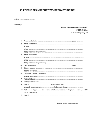 ZLECENIE TRANSPORTOWO-SPEDYCYJNE NR .......... z dnia ................................ dla firmy: Firma Transportowa „Trzciński” 74-101 Gryfino ul. Armii Krajowej 57 1. Termin załadunku ....................................................................... godz. ............. 2. Adres załadunku ................................................................................................. (firma) .................................................................................................................. (ulica) .................................................................................................................. (kod pocztowy, miejscowość) ............................................................................. 3. Adres rozładunku ................................................................................................ (firma) .................................................................................................................. (ulica) .................................................................................................................. (kod pocztowy, miejscowość) ............................................................................. 4. Data rozładunku .......................................................................... godz .............. 5. Odprawa celna eksportowa ................................................................................ (nazwa spedycji) ................................................................................................. 6. Odprawa celna importowa .................................................................................. (nazwa spedycji) ................................................................................................. 7. Rodzaj ładunku ................................................................................................... 8. Rodzaj samochodu ............................................................................................. 9. Fracht ........................................... Dodatkowe opłaty ........................................ (odcinek zagraniczny) ........................... (odcinek krajowy) ................................ 10. Płatność w ciągu ......... dni od dnia załadunku, liczone według kursu średniego NBP z dnia załadunku 11. Uwagi .................................................................................................................. Podpis osoby upoważnionej