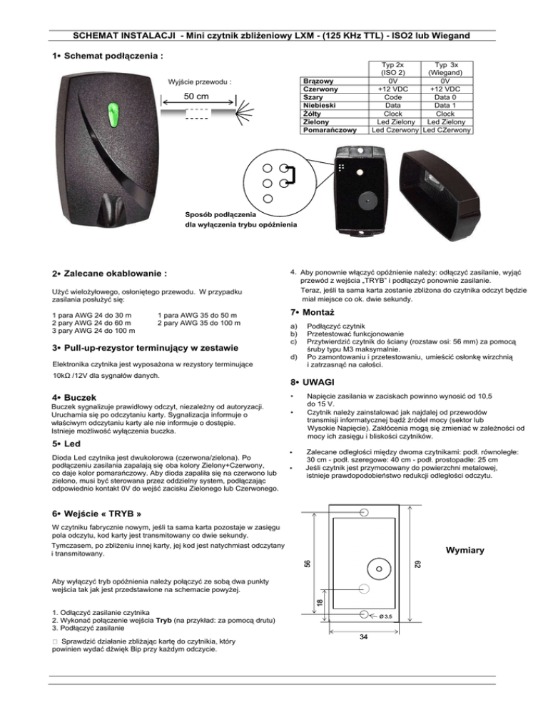 SCHEMAT INSTALACJI - Mini czytnik zbliżeniowy LXM - (125 KHz TTL) - ISO2 lub Wiegand 1• Schemat podłączenia : Typ 2x Typ 3x (ISO 2) (Wiegand) 0V 0V +12 VDC +12 VDC Code Data 0 Data Data 1 Clock Clock Led Zielony Led Zielony Led Czerwony Led CZerwony Brązowy Czerwony Szary Niebieski Żółty Zielony Pomarańczowy Wyjście przewodu : 50 cm Sposób podłączenia dla wyłączenia trybu opóźnienia 2• Zalecane okablowanie : Użyć wielożyłowego, osłoniętego przewodu. W przypadku zasilania posłużyć się: 1 para AWG 24 do 30 m 2 pary AWG 24 do 60 m 3 pary AWG 24 do 100 m 1 para AWG 35 do 50 m 2 pary AWG 35 do 100 m 3• Pull-up-rezystor terminujący w zestawie Elektronika czytnika jest wyposażona w rezystory terminujące 10kΩ /12V dla sygnałów danych. 4• Buczek Buczek sygnalizuje prawidłowy odczyt, niezależny od autoryzacji. Uruchamia się po odczytaniu karty. Sygnalizacja informuje o właściwym odczytaniu karty ale nie informuje o dostępie. Istnieje możliwość wyłączenia buczka. 5• Led Dioda Led czytnika jest dwukolorowa (czerwona/zielona). Po podłączeniu zasilania zapalają się oba kolory Zielony+Czerwony, co daje kolor pomarańczowy. Aby dioda zapaliła się na czerwono lub zielono, musi być sterowana przez oddzielny system, podłączając odpowiednio kontakt 0V do wejść zacisku Zielonego lub Czerwonego. 4. Aby ponownie włączyć opóźnienie należy: odłączyć zasilanie, wyjąć przewód z wejścia „TRYB” i podłączyć ponownie zasilanie. Teraz, jeśli ta sama karta zostanie zbliżona do czytnika odczyt będzie miał miejsce co ok. dwie sekundy. 7• Montaż a) b) c) d) Podłączyć czytnik Przetestować funkcjonowanie Przytwierdzić czytnik do ściany (rozstaw osi: 56 mm) za pomocą śruby typu M3 maksymalnie. Po zamontowaniu i przetestowaniu, umieścić osłonkę wirzchnią i zatrzasnąć na całości. 8• UWAGI • • • • Napięcie zasilania w zaciskach powinno wynosić od 10,5 do 15 V. Czytnik należy zainstalować jak najdalej od przewodów transmisji informatycznej bądź źródeł mocy (sektor lub Wysokie Napięcie). Zakłócenia mogą się zmieniać w zależności od mocy ich zasięgu i bliskości czytników. Zalecane odległości między dwoma czytnikami: podł. równoległe: 30 cm - podł. szeregowe: 40 cm - podł. prostopadłe: 25 cm Jeśli czytnik jest przymocowany do powierzchni metalowej, istnieje prawdopodobieństwo redukcji odległości odczytu. 6• Wejście « TRYB » W czytniku fabrycznie nowym, jeśli ta sama karta pozostaje w zasięgu pola odczytu, kod karty jest transmitowany co dwie sekundy. Tymczasem, po zbliżeniu innej karty, jej kod jest natychmiast odczytany i transmitowany. 62 56 Wymiary 18 Aby wyłączyć tryb opóźnienia należy połączyć ze sobą dwa punkty wejścia tak jak jest przedstawione na schemacie powyżej. 1. Odłączyć zasilanie czytnika 2. Wykonać połączenie wejścia Tryb (na przykład: za pomocą drutu) 3. Podłączyć zasilanie Sprawdzić działanie zbliżając kartę do czytnikia, który powinien wydać dźwięk Bip przy każdym odczycie. Ø 3.5 34 INSTALLATION PROCEDURE - LXM Mini Reader - (125 KHz TTL) - ISO2 or Wiegand 1• Wiring diagram : Brown Red Grey Blue Yellow Green Orange Sortie câble : 50 cm Type 2x (ISO 2) 0V +12 VDC Code Data Clock Green Led Red Led Type 3x (Wiegand) 0V +12 VDC Data 0 Data 1 Clock Green Led Red Led Connection detail to suppress the code filter . 2• Recommended cables : Use a multi-conductor cable, pair shielded. When power is supplied with the same cable we recommend: 1 pair AWG24 for up to 30 m 2 pairs AWG24 for up to 60 m 3 pairs AWG24 for up to 100 m 1 pair AWG35 for up to 50 m 2 pairs AWG35 for up to 100 m 3• Built-in pull-ups resistors Check if the reader is operating properly by presenting a card. The reader should then beep quickly on each reading. 4. To come back to the initial configuration, power off the reader, then unplug the strap. Power the reader on. Now, when a card is left in the reading area, the reader will beep only every two seconds. 7• Installation For data signals, 10kΩ /+12V pull-up resistors are quipped in the reader electronics : 1. 2. 3. 4. 4• Buzzer 8• Precautions for installation The buzzer gives an indication of correct read, not depending on the eventual authorizations or access rights given to a card. It will emit a brief sound as soon as a card or tag is read. It is possible to shut it off by removing the jumper located just nearby the buzzer. 5• Led The led is bicolor (red/green). When the reader is powered on, it is amber (red+green). It can be driven by the remote system to light it either red or green, by bringing a 0V respectively on the red or green inputs of the reader’s connector. • • • • Connect the reader Test the reading and communication. Attach the reader on the wall (M3 screws only) Place the front cover and clip it. Power supply tension at the reader’s connector should be strictly comprised between 10.5V and 15V. Keep the reader away from computer or power cables as much as possible. They can generate an electrical perturbation that is function of their proximity and radiation level. Distance to respect between two readers : parallel plan : 30 cm – Same plan : 40 cm – Perpendicular : 25 cm. If the reader is mounted on a metallic surface it can affect the reading distance. To get the maximum reading distance, the reader should be installed at no less than 7 cm from any metallic surface. 6• « Mode » input. 56 Back side dimensions 62 By default, when this input is not connected, the reader will automatically delay the transmission of the code every 2 seconds when a card is left in the reading field. If a new card is shown to the reader before this time laps, its code will be transmitted immediately. When connected, this input cancels the delay in the transmission rate of a same card left in the reading field. In other word, the reader will transmit the code as fast as it can. 1. 