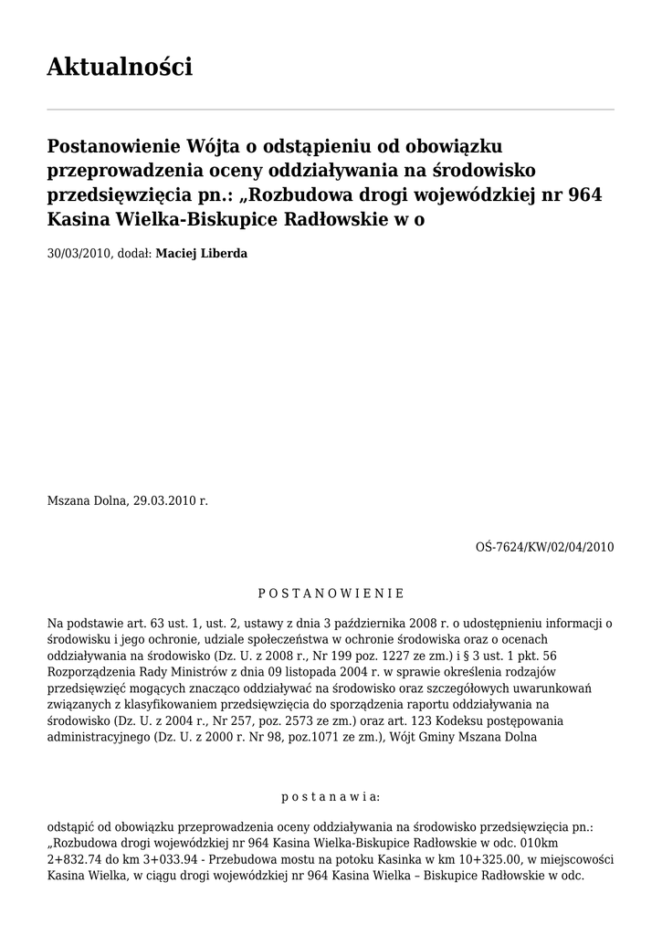Aktualności Postanowienie Wójta o odstąpieniu od obowiązku przeprowadzenia oceny oddziaływania na środowisko przedsięwzięcia pn.: „Rozbudowa drogi wojewódzkiej nr 964 Kasina Wielka-Biskupice Radłowskie w o 30/03/2010, dodał: Maciej Liberda Mszana Dolna, 29.03.2010 r. OŚ-7624/KW/02/04/2010 POSTANOWIENIE Na podstawie art. 63 ust. 1, ust. 2, ustawy z dnia 3 października 2008 r. o udostępnieniu informacji o środowisku i jego ochronie, udziale społeczeństwa w ochronie środowiska oraz o ocenach oddziaływania na środowisko (Dz. U. z 2008 r., Nr 199 poz. 1227 ze zm.) i § 3 ust. 1 pkt. 56 Rozporządzenia Rady Ministrów z dnia 09 listopada 2004 r. w sprawie określenia rodzajów przedsięwzięć mogących znacząco oddziaływać na środowisko oraz szczegółowych uwarunkowań związanych z klasyfikowaniem przedsięwzięcia do sporządzenia raportu oddziaływania na środowisko (Dz. U. z 2004 r., Nr 257, poz. 2573 ze zm.) oraz art. 123 Kodeksu postępowania administracyjnego (Dz. U. z 2000 r. Nr 98, poz.1071 ze zm.), Wójt Gminy Mszana Dolna p o s t a n a w i a: odstąpić od obowiązku przeprowadzenia oceny oddziaływania na środowisko przedsięwzięcia pn.: „Rozbudowa drogi wojewódzkiej nr 964 Kasina Wielka-Biskupice Radłowskie w odc. 010km 2+832.74 do km 3+033.94 - Przebudowa mostu na potoku Kasinka w km 10+325.00, w miejscowości Kasina Wielka, w ciągu drogi wojewódzkiej nr 964 Kasina Wielka – Biskupice Radłowskie w odc. 010km 2+938,00” będącego przedsięwzięciem mogącym potencjalnie znacząco oddziaływać na środowisko. Uzasadnienie Zarząd Dróg Wojewódzkich w Krakowie, ul. Głowackiego 56, 30-085 Kraków zwróciło się z wnioskiem o wydanie decyzji o środowiskowych uwarunkowaniach dla planowanego przedsięwzięcia pn.: „Rozbudowa drogi wojewódzkiej nr 964 Kasina Wielka-Biskupice Radłowskie w odc. 010km 2+832.74 do km 3+033.94 - Przebudowa mostu na potoku Kasinka w km 10+325.00, w miejscowości Kasina Wielka, w ciągu drogi wojewódzkiej nr 964 Kasina Wielka – Biskupice Radłowskie w odc. 010km 2+938,00” Na podstawie art. 73. ust. 1, art. 74 ust. 3 oraz art. 75 ust. 4 ustawy z dnia 3 października 2008 r. o udostępnianiu informacji o środowisku i jego ochronie, udziale społeczeństwa w ochronie środowiska oraz ocenach oddziaływania na środowisko (Dz. U. z 2008 r., Nr 199, poz. 1227 ze zm.) oraz art. 61 § 1 i § 4 ustawy z dna 14 czerwca 1960 r. k.p.a. (Dz. U. z 2000 r., Nr 98, poz. 1071 ze zm.) w dniu 26.01.2010 r. zostało wszczęte postępowanie. Wnioskodawca wraz z wnioskiem złożył przedłożył kartę informacyjną kopię mapy ewidencyjnej oraz wypis z rejestru gruntów. Przedmiotowe przedsięwzięcie zaliczane jest zgodnie z § 3 ust. 1 pkt. 56 Rozporządzenia Rady Ministrów z dnia 09 listopada 2004 r. w sprawie określenia rodzajów przedsięwzięć mogących znacząco oddziaływać na środowisko oraz szczegółowych uwarunkowań związanych z klasyfikowaniem przedsięwzięcia do sporządzenia raportu oddziaływania na środowisko (Dz. U. z 2004 r., Nr 257, poz. 2573 ze zm.) do przedsięwzięć mogących potencjalnie znacząco oddziaływać na środowisko. Tutejszy organ skierował zapytanie o wydanie opinii co do potrzeby przeprowadzenia oceny oddziaływania na środowisko do Regionalnego Dyrektora Ochrony Środowiska w Krakowie oraz Państwowego Powiatowego Inspektora Sanitarnego w Limanowej. Pismem z dnia 15.02.2010 r. znak: NNZ-420-17/10 Państwowy Powiatowy Inspektor Sanitarny w Limanowej wydał opinię, że planowane przedsięwzięcie nie wymaga przeprowadzenia oceny oddziaływania na środowisko. Regionalny Dyrektor Ochrony Środowiska w Krakowie, Oddział Stary Sącz pismem z dnia 17 marca 2010 r. znak: ST.II.PL.6665-14-1/10 zaopiniował brak potrzeby przeprowadzenia oceny oddziaływania na środowisko dla w/w przedsięwzięcia. Z informacji zawartych w Karcie Informacyjnej wynika, że planowane przedsięwzięcie polegać będzie na przebudowie mostu na potoku Kasinka w miejscowości Kasina Wielka w gminie Mszana Dolna. Planowany do przebudowy most leży w ciągu drogi wojewódzkiej nr 964. Przedsięwzięcie obejmować będzie następujący zakres zadań: - rozbiórkę istniejącego mostu, - budowę nowego mostu, - przebudowę dojazdów do mostu, - budowę tymczasowej kładki dla pieszych, - budowę odwodnienia mostu i dojazdów, - budowę umocnień brzegów potoku Po przebudowie most będzie miał klasę obciążenia A, szerokość 12,17 m i długości 18,27 m. Podstawowe dane techniczne projektowanego mostu: Projektuje się obiekt jednoprzęsłowy o konstrukcji nośnej z belek strunobetonowych typu odwrócone T zespolonych z płytą żelbetową. Przyczółki żelbetowe, masywne posadowione bezpośrednio na gruncie. Obiekt zaprojektowano na klasę obciążenia A wg PN 85/S – 10030. Projektowane parametry techniczne drogi: - klasa techniczna drogi G, - kategoria ruchu KR3, - obciążenie nawierzchni 100 kN/oś, - szerokość jezdni 6,50m, - szerokość chodników 2,00 m, Projektowane parametry techniczne mostu: - klasa obciążenia A, - szerokość obiektu 12,17m - długość całkowita obiektu 18,27 m, - szerokość jezdni 7,00m, - szerokość chodników 2,00 m, Dla bezpieczeństwa konstrukcji projektowanego mostu przewiduje się wykonanie umocnień: • brzeg prawy: opaska z narzutu kamiennego km 10+379.00 do km 10+286.00 potoku Kasinka (tj. 50 mb powyżej mostu i 30 mb poniżej mostu) • brzeg lewy: opaska z narzutu kamiennego km 10+342.00 do km 10+305.00 potoku Kasinka (tj. 3.5 mb powyżej mostu i 14.25 mb poniżej mostu) Opaski ubezpieczające zostaną wykonane w formie typowego narzutu kamiennego z brył kamienia łamanego o średnicy pow. 50 cm uformowanych i odpowiednio zaklinowanych bez spoiwa. Sposób wykonania umocnień i forma narzutu kamiennego zapewni naturalny wygląd koryta. W związku z powyższym, na podstawie informacji o planowanym przedsięwzięciu z uwagi na skalę projektowanej inwestycji