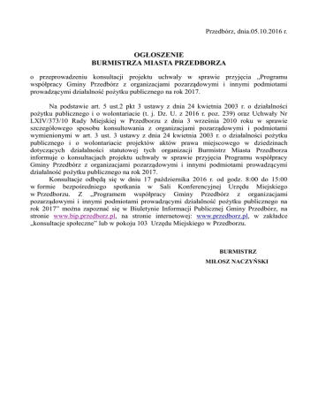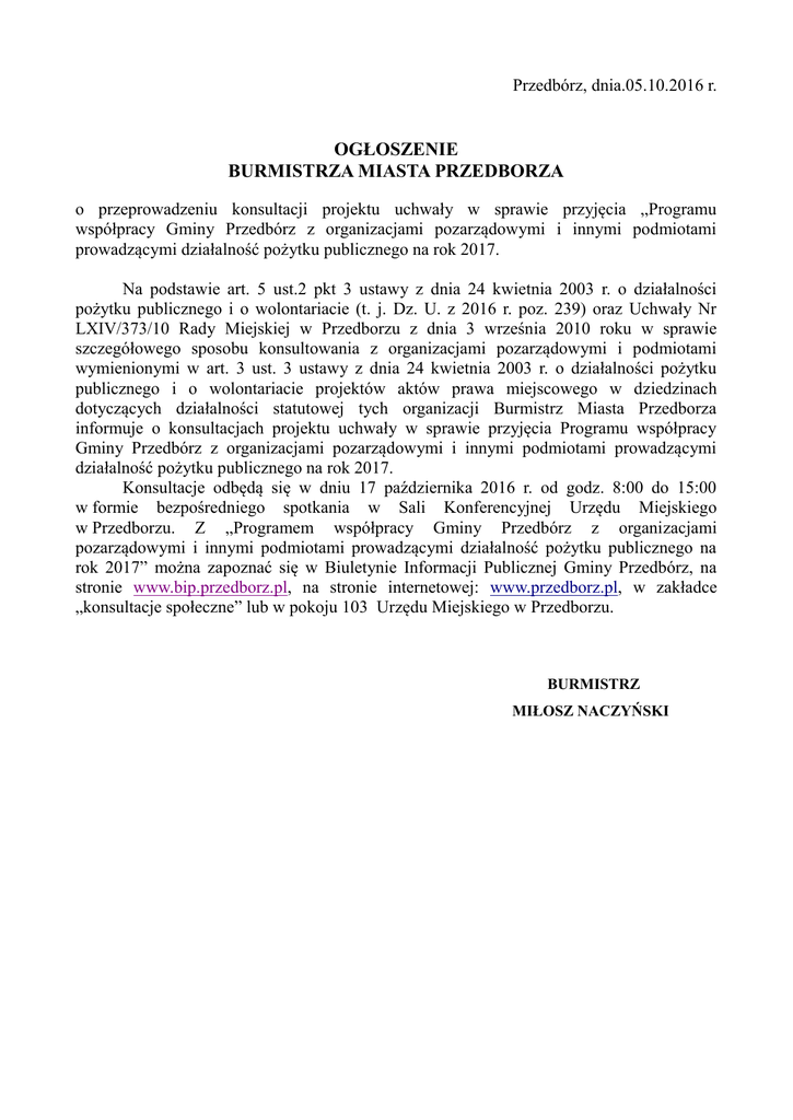 Przedbórz, dnia.05.10.2016 r. OGŁOSZENIE BURMISTRZA MIASTA PRZEDBORZA o przeprowadzeniu konsultacji projektu uchwały w sprawie przyjęcia „Programu współpracy Gminy Przedbórz z organizacjami pozarządowymi i innymi podmiotami prowadzącymi działalność pożytku publicznego na rok 2017. Na podstawie art. 5 ust.2 pkt 3 ustawy z dnia 24 kwietnia 2003 r. o działalności pożytku publicznego i o wolontariacie (t. j. Dz. U. z 2016 r. poz. 239) oraz Uchwały Nr LXIV/373/10 Rady Miejskiej w Przedborzu z dnia 3 września 2010 roku w sprawie szczegółowego sposobu konsultowania z organizacjami pozarządowymi i podmiotami wymienionymi w art. 3 ust. 3 ustawy z dnia 24 kwietnia 2003 r. o działalności pożytku publicznego i o wolontariacie projektów aktów prawa miejscowego w dziedzinach dotyczących działalności statutowej tych organizacji Burmistrz Miasta Przedborza informuje o konsultacjach projektu uchwały w sprawie przyjęcia Programu współpracy Gminy Przedbórz z organizacjami pozarządowymi i innymi podmiotami prowadzącymi działalność pożytku publicznego na rok 2017. Konsultacje odbędą się w dniu 17 października 2016 r. od godz. 8:00 do 15:00 w formie bezpośredniego spotkania w Sali Konferencyjnej Urzędu Miejskiego w Przedborzu. Z „Programem współpracy Gminy Przedbórz z organizacjami pozarządowymi i innymi podmiotami prowadzącymi działalność pożytku publicznego na rok 2017” można zapoznać się w Biuletynie Informacji Publicznej Gminy Przedbórz, na stronie www.bip.przedborz.pl, na stronie internetowej: www.przedborz.pl, w zakładce „konsultacje społeczne” lub w pokoju 103 Urzędu Miejskiego w Przedborzu. BURMISTRZ MIŁOSZ NACZYŃSKI