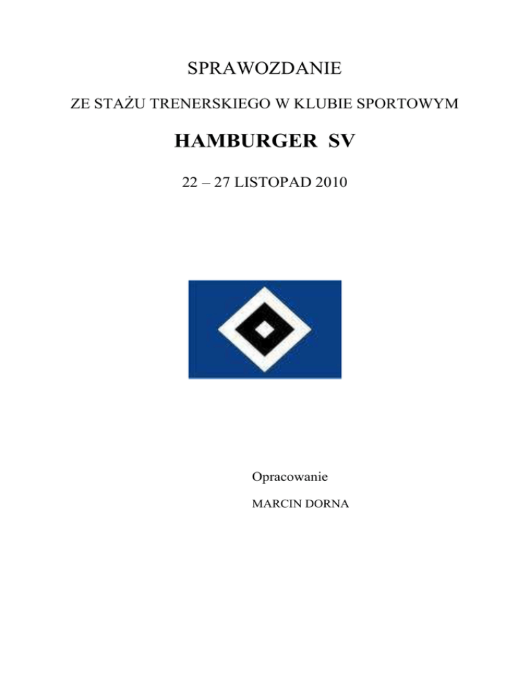 SPRAWOZDANIE ZE STAŻU TRENERSKIEGO W KLUBIE SPORTOWYM HAMBURGER SV 22 – 27 LISTOPAD 2010 Opracowanie MARCIN DORNA SPIS TREŚCI I. OGÓLNE INFORMACJE O KLUBIE. 1. Historia Klubu Sportowego HAMBURGER SV 2. Osiągnięcia Klubu Sportowego HAMBURGER SV II. CHARAKTERYSTYKA DZIAŁALNOŚCI SEKCJI PIŁKI NOŻNEJ. 1. Struktura organizacyjna i szkoleniowa 2. Kadra trenerska 3. Model funkcjonowania Akademii Piłkarskiej 4. Zasady i metodyka selekcji 5. Baza sportowa III. HSV Hamburg – Bundesliga 1. Kadra zawodnicza 2. Kadra trenerska 3. Mikrocykl szkoleniowy 4. Konspekty jednostek szkoleniowych IV. Konspekty jednostek szkoleniowych zespołów młodzieżowych Staż szkoleniowy HSV Hamburg; 22-27.11.2010 Strona 2 I. OGÓLNE INFORMACJE O KLUBIE 1. Historia klubu HAMBURGER SV Hamburger SV (pełna nazwa Hamburger Sport-Verein e. V., w skrócie HSV) – niemiecki klub sportowy z siedzibą w Hamburgu. Za oficjalną datę założenia klubu uznawany jest 29 września 1887 roku. Jest klubem wielosekcyjnym; oprócz najstarszej i najbardziej utytułowanej sekcji piłki nożnej mężczyzn posiada również sekcje: tenisa stołowego (1927), piłki nożnej kobiet (1970), siatkówki seniorów, baseballa (1985), softballa, badmintona i hokeja na lodzie. W latach 1976-2002 istniała również sekcja piłki ręcznej mężczyzn — obecnie w kooperacji z HSV Hamburg. Barwami klubu są kolory: niebieski, biały, oraz czarny. Swoje spotkania jako gospodarz drużyna piłkarska rozgrywa od 1953 roku na stadionie AMTECH Arena, mogącym pomieścić 55 869 widzów. 2. Osiągnięcia klubu HSV Drużyna piłki nożnej mężczyzn nieprzerwanie od 1963 gra w Bundeslidze. Była sześciokrotnym mistrzem Niemiec (1922 — nieoficjalny tytuł, 1923, 1928, 1959/60, 1978/79, 1981/82, 1982/83) oraz ośmiokrotnym wicemistrzem Niemiec (1924, 1956/57, 1957/58, 1975/76, 1979/80, 1980/81, 1983/84, 1986/87). Zdobyła również Puchar Ligi Niemieckiej (2003), trzykrotnie Puchar Niemiec (1962/63, 1975/76, 1986/87), a kolejne trzy razy grała w meczu finałowym tych rozgrywek (1955/56, 1966/67, 1973/74). Drużyna Hamburger SV odnosiła również sukcesy w klubowych rozgrywkach europejskich. Zdobyła Puchar Mistrzów (1982/83) oraz Puchar Zdobywców Pucharów (1976/77). Dodatkowo, brała również udział w meczach finałowych: Pucharu Mistrzów (1979/80), Pucharu Zdobywców Pucharów (1967/68) i Staż szkoleniowy HSV Hamburg; 22-27.11.2010 Strona 3 Pucharu UEFA (1981/82). Najwięcej goli (137) w historii klubu dla drużyny strzelił Uwe Seeler. Najwięcej meczów w zespole HSV rozegrał Manfred Kaltz (581).HSV Hamburg gra nieprzerwanie w najwyższej klasie rozgrywkowej Niemiec od ponad 47 lat. II. Model funkcjonowanie sekcji piłki nożnej 1. Struktura organizacyjna drużyn młodzieżowych Zespoły młodzieżowy w klubie HSV funkcjonują w Akademii Piłkarskiej – jedynej, wymaganej licencją, formie organizacji szkolenia w klubach Bundesligi w Niemczech. Proces szkonienia w klubie HSV Hamburg rozpoczyna się od 8 roku życia. Wcześniej klub współpracuje ze szkołami i przedszkolami, które przygotowują młodych adeptów piłki nożne do dalszego profesjonalnego treningu. Obecnie grupy młodzieżowe obejmują szkoleniem chłopców przede wszystkim z Niemiec, ale również z całej Europy. W hotelu Akademii Piłkarskiej HSV przebywa na co dzień 16 – 18 zawodników z trzech zespołów (U17, U19, U23). Kandydaci trafiają do drużyn poprzez rozbudowany system naboru i selekcji oraz dzięki współpracy z podmiotami w regionie. Staż szkoleniowy HSV Hamburg; 22-27.11.2010 Strona 4 W klubie Hamburger SV poza zespołem profesjonalnym funkcjonują: zespół U23, występujący w na czwartym poziomie rozgrywek w Niemczech oraz 12 zespołów młodzieżowych (w tym dwa juniorskie występujące w rozgrywkach Bundesligi). Nad ich należytym rozwojem zawodników Akademii czuwa dyrektor sportowy Akademii Peter Mayer oraz trener zespołu U23 – Rodolfo Cardoso – były zawodnik Hamburger SV. Staż szkoleniowy HSV Hamburg; 22-27.11.2010 Strona 5 2. Kadra trenerska Dyrektorem sportowym Akademii Piłkarskiej HSV jest od roku Szwajcar Peter Mayer. Wcześniej pracował m.in. nad reformą systemu szkolenia w Szwajcarii, przyczyniając się w późniejszym czasie do sukcesów młodzieżowych reprezentacji narodowych tego kraju (Mistrzostwo Świata U17 w roku 2009). Trenerzy prowadzący w poszczególnych kategoriach wiekowych: L.p. Zespół Trener 1. U23 Rodolfo Cardoso 2. U19 Otto Addo 3. U17 Marcus von Ahlen 4. U16 Thorsten Judt 5. U15 Daniel Petrowsky 6. U14 Sebastian Harms 7. U13 Frank Spitzer 8. U12 Pit Reimers 9. U11 Philipp Henkel 10. U10 Sebastian Schmidt 11. U9 Martin Schmidt 12. U8 Sebastian Schmidt Uwagi Gr. selekcyjna Staż szkoleniowy HSV Hamburg; 22-27.11.2010 Strona 6 3. Model funkcjonowania Akademii Piłkarskiej HSV Akademia Piłkarska HSV Hamburg funkcjonuje pod nazwą HSV YOUNG TALENT TEAM. Już sama nazwa „Zespół Młodych Talentów” wskazuję kierunki działania szkoły piłkarskiej w HSV: chcemy pracować z zawodnikami najbardziej utalentowanymi, którzy jednak wspólnie z trenerami i dyrektorem sportowym stworzyć powinni „Zespół” – zespół ludzi, których nadrzędnym celem jest przygotowanie jak największej liczby młodych zawodników do gry na poziomie profesjonalnym, najlepiej w pierwszym zespole HSV Hamburg. Wszystkie zespoły w Akademii grają w ustawieniu 1-4-4-2 (w defensywie) i 1-2-4-4 (w ofensywie). Podczas cotygodniowych spotkań z trenerami dyrektor sportowy Akademii przekazuje wytyczne do pracy szkoleniowej. Zwraca się szczególną uwagę na świadomość młodych zawodników (jak?, dlaczego?, kiedy?), stąd wiele zajęć szkoleniowych ma charakter zadaniowy. Zawodnicy mają wybrać najlepsze, z nauczonych wcześniej, rozwiązań zadania ruchowego Staż szkoleniowy HSV Hamburg; 22-27.11.2010 Strona 7 Tabela organizacyjna zespołów młodzieżowych Liczba L.p. Zespół zawodników Sztab Poziom Liczba szkole