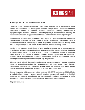 Kolekcja BIG STAR Jesień/Zima 2014 Jesienna część najnowszej kolekcji BIG STAR wpisuje się w styl vintage. Linia męska to nawiązanie do tradycyjnych strojów college’owych. Nasycone odcienie czerwieni i zieleni, w męskich bluzachi t-shirtach, zostały zestawione z typograficznymi printami i haftami. Charakterystycznym elementem są żakardy na koszulach i swetrach, przypominające tarcze z emblematami klubów sportowych. Linia damska to style vintage w denimowym wydaniu. Tym razem projektanci nadali casualowym fasonom bardziej kobiecą formę, proponując taliowane bluzy i dopasowane koszule. Subtelniejszą formę przybierają również nadruki. Kolory, które BIG STAR proponuje na ten sezon w linii damskiej, to musztardowy i fiolet. Męska część zimowej kolekcji BIG STAR, stawia na prosty styl w workwearowym charakterze. Wykorzystana paleta barw przybiera bardziej zgaszone kolory, dominują w niej bordowy, granat i odcienie szarości. Bluzy i longsleeve’y nawiązują do ubrań robotniczych z lat 20-tych i 30-tych, ozdoby zostały ograniczone do minimum. Nadruki, jeżeli się pojawiają, przyjmują industrialną formę i przypominają tablice ostrzegawcze z hangarów samolotowych czy magazynów. Zimową część kolekcji damskiej charakteryzują poetyckie nadruki i barwne fotoprinty niczym z akwarelowych obrazów. Wprowadzono też nowe formy bluz, jak np. dzianinowe bomberjacket. Idealnym rozwiązaniem na chłodne dni, będą ciepłe oversizowe swetry w modnych tej zimy odcieniach bordo i szarości . Jak na ekspertów od jeansów przystało, kolekcja BIG STAR jesień/zima 2014 obfituje w najróżniejsze fasony i wzory spodni. Oprócz klasycznych modeli, w kolekcji pojawiają się spodnie podążające za najnowszymi trendami: postarzane w stylu vintage, mocno przecierane, czy inspirowane spodniami motocyklowymi. bigstarjeans.com
