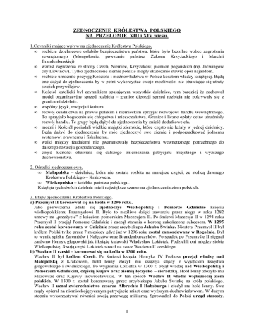 ZEDNOCZENIE KRÓLESTWA POLSKIEGO NA PRZEŁOMIE XIII i XIV wieku. 1.Czynniki mające wpływ na zjednoczenie Królestwa Polskiego. • rozbicie dzielnicowe osłabiło bezpieczeństwa państwa, które było bezsilne wobec zagrożenia zewnętrznego (Mongołowie, powstanie państwa Zakonu Krzyżackiego i Marchii Brandenburskiej) • wzrost zagrożenia ze strony Czech, Niemiec, Krzyżaków, plemion pogańskich (np. Jaćwingów czy Litwinów). Tylko zjednoczone ziemie polskie mogły skutecznie stawić opór najazdom. • rozbicie umocniło pozycję Kościoła i możnowładztwa w Polsce kosztem władzy książęcej. Będą one dążyć do zjednoczenia by w pełni wykorzystać swoje możliwości nie obawiając się utraty swoich przywilejów. • Kościół katolicki był czynnikiem spajającym wszystkie dzielnice, tym bardziej że zachował model organizacyjny sprzed rozbicia – granice diecezji sprzed rozbicia nie pokrywały się z granicami dzielnic. • wspólny język, tradycja i kultura. • rozwój osadnictwa na prawie polskim i niemieckim sprzyjał rozwojowi handlu wewnętrznego. To sprzyjało bogaceniu się chłopstwa i mieszczaństwa. Granice i liczne opłaty celne utrudniały rozwój handlu. Te grupy będą dążyć do zjednoczenia by znieść dodatkowe cła. • możni i Kościół posiadali wielkie majątki ziemskie, które często nie leżały w jednej dzielnicy. Będą dążyć do zjednoczenia by móc zjednoczyć swe ziemie i podporządkować jednemu systemowi prawnemu i fiskalnemu. • walki między feudałami nie gwarantowały bezpieczeństwa wewnętrznego potrzebnego do dalszego rozwoju gospodarczego. • część ludności obawiała się dalszego zniemczania patrycjatu miejskiego i wyższego duchowieństwa. 2. Ośrodki zjednoczeniowe. • Małopolska – dzielnica, która nie została rozbita na mniejsze części, ze stolicą dawnego Królestwa Polskiego – Krakowem. • Wielkopolska – kolebka państwa polskiego. Książęta tych dwóch dzielnic mieli największe szanse na zjednoczenia ziem polskich. 3. Etapy zjednoczenia Królestwa Polskiego. a) Przemysł II koronował się na króla w 1295 roku. Jako pierwszemu udało się zjednoczyć Wielkopolskę i Pomorze Gdańskie księciu wielkopolskiemu Przemysłowi II. Było to możliwe dzięki zawarciu przez niego w roku 1282 umowy na „przeżycie” z księciem pomorskim Mszczujem II. Po śmierci Mszczuja II w 1294 roku Przemysł II przejął Pomorze Gdańskie i zaczął starania o koronę zakończone sukcesem. W 1295 roku został koronowany w Gnieźnie przez arcybiskupa Jakuba Świnkę. Niestety Przemysł II był królem Polski tylko przez 7 miesięcy gdyż już w 1296 roku został zamordowany w Rogoźnie. Był to wynik spisku Zarembów i Nałęczów oraz Brandenburczyków. Po spadek po Przemyśle II sięgnął zarówno Henryk głogowski jak i książę kujawski Władysław Łokietek. Podzielili oni między siebie Wielkopolskę. Swoją część Łokietek stracił na rzecz Wacława II czeskiego. b) Wacław II czeski – koronował się na króla w 1300 roku. Wacław II był królem Czech. Po śmierci księcia Henryka IV Probusa przejął władzę nad Małopolską z Krakowem, hołd lenny złożyli mu książęta śląscy z wyjątkiem księstwa głogowskiego i świdnickiego. Po wygnaniu Łokietka w 1300 r. objął władzę nad Wielkopolską i Pomorzem Gdańskim, częścią Kujaw oraz ziemią łęczycko – sieradzką. Hołd lenny złożyło mu Mazowsze oraz Kujawy inowrocławskie. W ten sposób Wacław II władał większością ziem polskich. W 1300 r. został koronowany przez arcybiskupa Jakuba Świnkę na króla polskiego. Wacław II uznał zwierzchnictwo cesarza Albrechta I Habsburga i złożył mu hołd lenny. Swe rządy opierał na niemieckojęzycznym patrycjacie miast oraz wyższym duchowieństwem. W dużym stopniu wykorzystywał również swoją przewagę militarną. Sprowadził do Polski urząd starosty. 1 Starostowie pełnili funkcje namiestników królewskich. Jego rządy twardej ręki nie podobały się i były mało popularne, tym bardziej że pełnij je przy pomocy ludzi obcych, najczęściej Niemców. Sytuację pogarszał fakt iż Wacław czeski wplątał się w walkę o tron węgierski. By uzyskać poparcie Brandenburgii przyrzekł jej Pomorze Gdańskie czym zraził do siebie bardzo wielu panów polskich. Zmarł w 1305 roku. Po śmierci Wacława II tron czeski przejął jego syn Wacław III w 1305 r. Nie zdążył się jednak koronować na króla polskiego. W 1306 roku został zamordowany w Ołomuńcu. c) Władysław Łokietek – koronował się na króla w 1320 roku. Władysław Łokietek, książę kujawski, wrócił do kraju w 1305 roku przy pomocy węgierskiej, najpierw opanował ziemię sandomierską, później łęczycko-sieradzką i swoją rodzimą dzielnicę – ziemię brzesko-kujawską. Po śmierci Wacława III przejął Pomorze Gdańskie i Małopolskę z Krakowem. Wielkopolską władał Henryk głogowski do 1314 roku. Później Wielkopolskę włączył Łokietek do swego państwa. Niestety w 1308 roku Łokietek utracił Pomorze Gdańskie na rzecz Zakonu Krzyżackiego, który podstępnie zajął Gdańsk i wymordował tamtejszą ludność. W tym czasie Łokietek był zajęty tłumieniem buntu biskupa Jana Muskaty. Władysław Łokietek postanowił odzyskać Pomorze Gdańskie drogą dyplomatyczną. W 1320 roku miał miejsce sąd papieski w Inowrocławiu, który nakazał Zakonowi zwrócić nieprawnie zagarniętą ziemię i zapłacić państwu polskiemu odszkodowanie. Krzyżacy nie poddali się wyrokowi. Związali się z książętami mazowieckimi i w 1326 roku przeprowadzili najazd na Wielkopolskę. Łokietek chcąc ukarać książąt mazowieckich w 1327 roku uderzył na Mazowsze. Doprowadziło to do odwetowych wypraw krzyżackich na Kujawy. Wojna polsko-krzyżacka z lat 1329 – 1332 (lub 1327-1332) nie była dla Polski korzystna. Krzyżacy zajęli ziemie dobrzyńską (1329) i Kujawy (1332) mimo zwycięski