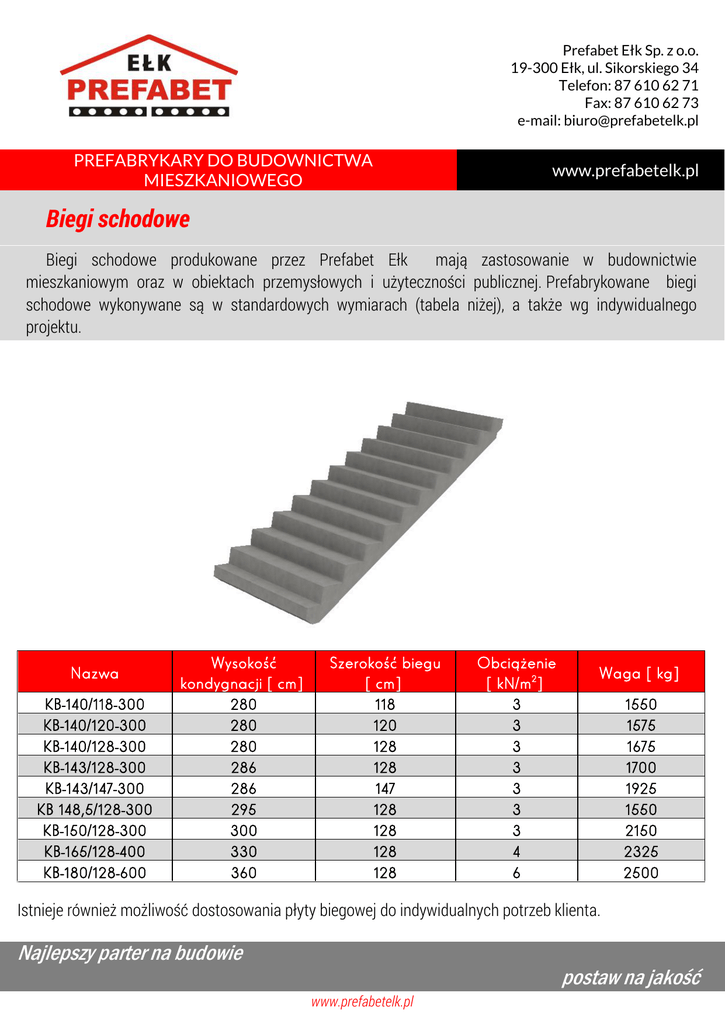Prefabet Ełk Sp. z o.o. 19-300 Ełk, ul. Sikorskiego 34 Telefon: 87 610 62 71 Fax: 87 610 62 73 e-mail: [email protected] PREFABRYKARY DO BUDOWNICTWA MIESZKANIOWEGO www.prefabetelk.pl Biegi schodowe Biegi schodowe produkowane przez Prefabet Ełk mają zastosowanie w budownictwie mieszkaniowym oraz w obiektach przemysłowych i użyteczności publicznej. Prefabrykowane biegi schodowe wykonywane są w standardowych wymiarach (tabela niżej), a także wg indywidualnego projektu. Nazwa KB-140/118-300 KB-140/120-300 KB-140/128-300 KB-143/128-300 KB-143/147-300 KB 148,5/128-300 KB-150/128-300 KB-165/128-400 KB-180/128-600 Wysokość kondygnacji [cm] 280 280 280 286 286 295 300 330 360 Szerokość biegu [cm] 118 120 128 128 147 128 128 128 128 Obciążenie [kN/m2] 3 3 3 3 3 3 3 4 6 Waga [kg] 1550 1575 1675 1700 1925 1550 2150 2325 2500 Istnieje również możliwość dostosowania płyty biegowej do indywidualnych potrzeb klienta. Najlepszy parter na budowie www.prefabetelk.pl postaw na jakość