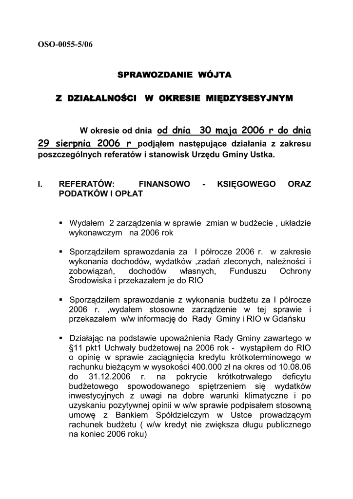 OSO-0055-5/06 SPRAWOZDANIE WÓJTA Z DZIAŁALNOŚCI W OKRESIE MIĘDZYSESYJNYM W okresie od dnia od dnia 30 maja 2006 r do dnia 29 sierpnia 2006 r podjąłem następujące działania z zakresu poszczególnych referatów i stanowisk Urzędu Gminy Ustka. I. REFERATÓW: FINANSOWO PODATKÓW I OPŁAT - KSIĘGOWEGO ORAZ Wydałem 2 zarządzenia w sprawie zmian w budŜecie , układzie wykonawczym na 2006 rok Sporządziłem sprawozdania za I półrocze 2006 r. w zakresie wykonania dochodów, wydatków ,zadań zleconych, naleŜności i zobowiązań, dochodów własnych, Funduszu Ochrony Środowiska i przekazałem je do RIO Sporządziłem sprawozdanie z wykonania budŜetu za I półrocze 2006 r. ,wydałem stosowne zarządzenie w tej sprawie i przekazałem w/w informację do Rady Gminy i RIO w Gdańsku Działając na podstawie upowaŜnienia Rady Gminy zawartego w §11 pkt1 Uchwały budŜetowej na 2006 rok - wystąpiłem do RIO o opinię w sprawie zaciągnięcia kredytu krótkoterminowego w rachunku bieŜącym w wysokości 400.000 zł na okres od 10.08.06 do 31.12.2006 r. na pokrycie krótkotrwałego deficytu budŜetowego spowodowanego spiętrzeniem się wydatków inwestycyjnych z uwagi na dobre warunki klimatyczne i po uzyskaniu pozytywnej opinii w w/w sprawie podpisałem stosowną umowę z Bankiem Spółdzielczym w Ustce prowadzącym rachunek budŜetu ( w/w kredyt nie zwiększa długu publicznego na koniec 2006 roku) -2– Przygotowałem projekty uchwał na sesję w dniu 29.08.2006: - o zmianie uchwały w sprawie uchwalenia budŜetu gminy 2006 rok oraz w sprawie zmian w budŜecie gminy na - w sprawie zmiany uchwały o dochodach własnych jednostek budŜetowych Sporządziłem sprawozdanie o zaległościach przedsiębiorców z tyt. świadczeń na rzecz sektora finansów publicznych II kwartał 2006 r. do RIO w Gdańsku wyrywkowe kontrole w zakresie opłaty Przeprowadziłem miejscowej i sezonowym wynajmie kwater wspólnie ze StraŜą Graniczną. II. REFERATU PLANOWANIA PRZESTRZENNEGO , BUDOWNICTWA I OCHRONY ŚRODOWISKA 1. Przygotowałem do wyłoŜenia do publicznego wglądu projekt: • • • miejscowego planu zagospodarowania przestrzennego dla części terenów połoŜonych w okolicy miejscowości Duninowo, Pęplino w gminie Ustka, miejscowego planu zagospodarowania przestrzennego dla lokalizacji Parku Wiatrowego Nr 2 w miejscowościach MoŜdŜanowo - Starkowo w gminie Ustka, miejscowego planu zagospodarowania przestrzennego dla lokalizacji Parku Wiatrowego Nr 3 w miejscowości Zaleskie w gminie Ustka. 2. Przygotowałem do zaopiniowania przez Powiatową Komisję Architektoniczno – Urbanistyczną niŜej wymienione opracowania planistyczne: • projekt miejscowego planu zagospodarowania przestrzennego dla terenu działki nr 103 połoŜonej w obrębie geodezyjnym Dębina gmina Ustka, -3– • projekt miejscowego planu zagospodarowania przestrzennego dla terenu działki nr 80/4 i części działki nr 80/5 połoŜonych w obrębie geodezyjnym Dębina oraz części działki nr 44/2 i 44/3 połoŜonych w obrębie geodezyjnym Poddąbie w gminie Ustka, • projekt miejscowego planu zagospodarowania przestrzennego dla terenu działek nr: 3/3, 3/2, 1/1, 144, 143, 145/2, 216/7, 216/6, 216/4 i 110/14 oraz działki nr 63/2L i części działek nr 67/2L i 67/3 połoŜonych w obrębie geodezyjnym Machowinko gmina Ustka, • projekt miejscowego planu zagospodarowania przestrzennego dla terenu działek 143/11, 216/3, 165, 18, 17, 228, 300, 31/12, 31/13, 31/14, 31/15, 31/16, 31/17, 31/18, 31/19, 31/20, 31/21, 31/22, 31/23 i 31/24 i fragmentu obszaru zaznaczonego na załączniku nr 2A połoŜonych w obrębie geodezyjnym Wytowno gmina Ustka, • projekt miejscowego planu zagospodarowania przestrzennego dla terenu działki nr 72L oraz części działki nr 37/5L w miejscowości Orzechowo Morskie w obrębie geodezyjnym Wytowno gmina Ustka, • projekt miejscowego planu zagospodarowania przestrzennego dla terenu działki nr 4/1 połoŜonej w obrębie geodezyjnym Machowinko gmina Ustka. 3. Przygotowałem uchwały pod obrady Rady Gminy Ustka w sprawie: • przystąpienia do sporządzenia miejscowego planu zagospodarowania przestrzennego dla działek nr: 120, 119, 118, 117, 116, 7/1, 7/2, 7/3, 7/4, 7/5, 12/15, 47/2 oraz części działek nr: 46/3, 20, 12/21, 130, 47/3 i 127 połoŜonych w miejscowości Poddąbie w gminie Ustka, • uchwalenia miejscowego planu zagospodarowania przestrzennego dla terenu działek nr 146/1, 149, 150/1, 150/2, 218/1, 218/2, 218/3, 218/4, 218/5, 218/6, 218/7, 218/8, 218/9, 218/10, 218/11, 218/12, 218/13, 218/14, 218/15, 218/16, 219, 220/2, 220/3, 220/4, 220/5, 220/6, 220/7, 220/8, 220/9 i 221/1 w obrębie geodezyjnym Grabno w gminie Ustka, -4• uchwalenia zmiany miejscowego planu zagospodarowania przestrzennego terenu przeznaczonego pod zabudowę usługowomieszkaniową „Ustka-Zimowiska” na obszarze działek nr: 449 i 450 połoŜonych w miejscowości Zimowiska obręb geodezyjny Grabno w gminie Ustka, • uchwalenia „Studium uwarunkowań i kierunków zagospodarowania przestrzennego Gminy Ustka” ze zmianą dla części terenu połoŜonego w obrębie geodezyjnym Wytowno w gminie Ustka, • uchwalenia miejscowego planu zagospodarowania przestrzennego dla części terenów obejmujących działki nr 165, 166, 167, 168, 169, 170, 171, 172, 173, 174, 175, 176/1 i 176/2 połoŜone w obrębie geodezyjnym Dębina w gminie Ustka, uchwalenia miejscowego planu zagospodarowania przestrzennego dla lokalizacji Parku Wiatrowego Nr 1 w miejscowościach Duninowo, Wodnica w gminie Ustka. • III . INFRASTRUKTURY KOMUNALNEJ I INWESTYCJI 1. Przygotowałem dokumentacje: na remont pokrycia dachowego budynku socjalnego w Duninowie na remont mieszkania komunalnego w Objeździe 29 remontu świetlicy wiejskiej w Niestkowie 2. Opracowałem dokumentacje: na budowę kanalizacji sanitarnej w Machowinie na budowę kanalizacji sanitarnej w Starkowie pomiary i geologii na wykonanie projektów budowy mostów na rzece Grabown
