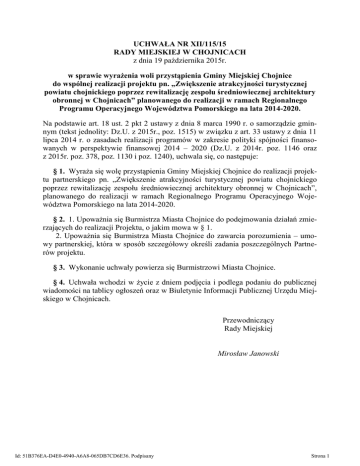 UCHWAŁA NR XII/115/15 RADY MIEJSKIEJ W CHOJNICACH z dnia 19 października 2015r. w sprawie wyrażenia woli przystąpienia Gminy Miejskiej Chojnice do wspólnej realizacji projektu pn. „Zwiększenie atrakcyjności turystycznej powiatu chojnickiego poprzez rewitalizację zespołu średniowiecznej architektury obronnej w Chojnicach” planowanego do realizacji w ramach Regionalnego Programu Operacyjnego Województwa Pomorskiego na lata 2014-2020. Na podstawie art. 18 ust. 2 pkt 2 ustawy z dnia 8 marca 1990 r. o samorządzie gminnym (tekst jednolity: Dz.U. z 2015r., poz. 1515) w związku z art. 33 ustawy z dnia 11 lipca 2014 r. o zasadach realizacji programów w zakresie polityki spójności finansowanych w perspektywie finansowej 2014 – 2020 (Dz.U. z 2014r. poz. 1146 oraz z 2015r. poz. 378, poz. 1130 i poz. 1240), uchwala się, co następuje: § 1. Wyraża się wolę przystąpienia Gminy Miejskiej Chojnice do realizacji projektu partnerskiego pn. „Zwiększenie atrakcyjności turystycznej powiatu chojnickiego poprzez rewitalizację zespołu średniowiecznej architektury obronnej w Chojnicach”, planowanego do realizacji w ramach Regionalnego Programu Operacyjnego Województwa Pomorskiego na lata 2014-2020. § 2. 1. Upoważnia się Burmistrza Miasta Chojnice do podejmowania działań zmierzających do realizacji Projektu, o jakim mowa w § 1. 2. Upoważnia się Burmistrza Miasta Chojnice do zawarcia porozumienia – umowy partnerskiej, która w sposób szczegółowy określi zadania poszczególnych Partnerów projektu. § 3. Wykonanie uchwały powierza się Burmistrzowi Miasta Chojnice. § 4. Uchwała wchodzi w życie z dniem podjęcia i podlega podaniu do publicznej wiadomości na tablicy ogłoszeń oraz w Biuletynie Informacji Publicznej Urzędu Miejskiego w Chojnicach. Przewodniczący Rady Miejskiej Mirosław Janowski Id: 51B376EA-D4E0-4940-A6A8-065DB7CD6E36. Podpisany Strona 1