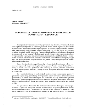 ZESZYTY NAUKOWE WSOWL Nr 2 (144) 2007 Marek PYTEL* Zbigniew GROBELNY PODODDZIAŁY ZMECHANIZOWANE W DZIAŁANIACH POWIETRZNO - LĄDOWYCH Początek XX wieku zaowocował pojawieniem się statków powietrznych, które dość szybko wykorzystano do celów wojskowych. Wraz z nimi pojawił się powietrzny wymiar walki. Zachęcające efekty wykorzystania w czasie I wojny światowej samolotów spowodowały poszukiwania nowych obszarów, w których środki te mogłyby wspierać działania wojsk lądowych. Prawdopodobnie efektem doświadczeń i założeń teoretycznych w tym okresie była koncepcja użycia lotnictwa do transportu żołnierzy w rejon działań bojowych. Idea przerzucenia znacznych sił ponad linią frontu i opanowania ważnych obiektów bez potrzeby zdobywania silnie ufortyfikowanych pozycji była nad wyraz pożądana, na przeszkodzie stał jednak niewystarczający poziom rozwoju konstrukcji samolotu. Przed I wojną światową problematyką wykorzystania lotnictwa do celów wojskowych zajmowali się głównie Anglicy i Amerykanie. Ponadto niemiecki Sztab Generalny w latach 1911-1912 próbował, jako pierwszy w świecie, określić możliwości i zakres wykorzystania lotnictwa, widząc w tym narzędziu skuteczny środek walki w przyszłości. W tym okresie Marszałek M. Tuchaczewski nakreślił koncepcję operacji powietrzno – lądowych z użyciem desantu przenoszonego za pomocą lotnictwa. Jednak przewidywania polityków i wojskowych w zakresie użycia samolotu na polu walki były raczej krótkowzroczne. W rzeczywistości samolot w roli narzędzia wojny zrobił dużą i - - - - - Po I wojnie światowej w wielu krajach kontynuowano poszukiwania sposobów przerzutu wojsk drogą powietrzną. W większości krajów stworzono tylko niewielkie pododdziały do celów doświadczalnych. W Niemczech i Rosji zauważono ogromne możliwości, jakie daje opanowanie ważnych obiektów na tyłach przeciwnika przez żołnierzy transportowanych drogą powietrzną, więc postanowiono rozwijać ten rodzaj wojsk. * mjr dypl. Marek PYTEL, kpt. mgr Zbigniew GROBELNY – Wyższa Szkoła Oficerska Wojsk Lądowych PODODDZIAŁY ZMECHANIZOWANE W DZIAŁANIACH POWIETRZNO - LĄDOWYCH szybką karierę w ciągu ostatniego półwiecza i ze środka rozpoznania i łączności przekształcił się w ważny środek walki o dużej sile ognia i znacznym zasięgu1. Duże możliwości nowego rodzaju wojsk2 w działaniach bojowych zostały potwierdzone w okresie drugiej wojny światowej przez desanty spadochronowe (Kreta, Arnhem). Oprócz niewątpliwych zalet ujawniła się słabość tych wojsk. Był to brak możliwości ewakuacji z obszaru działania w razie niepowodzenia i szybko zmniejszające się możliwości bojowe wynikające z braku wystarczającego wsparcia i zabezpieczenia walczących żołnierzy wojsk desantowych. Jednak zalety tych wojsk przeważyły nad wadami i wojska desantowe znalazły swoje stałe miejsce w każdej armii świata. Wykorzystanie desantów powietrznych w walce, a w tym taktycznych desantów powietrznych ma swoją krótką, ale dobrze udokumentowaną historię. Na ich rozwój wpłynęły znacząco poszukiwania możliwości przeniesienia żołnierzy na tyły lub skrzydła przeciwnika w szybki i niezakłócony sposób, celem wykonania konkretnych, wynikających z potrzeb pola walki zadań. Do czasu pojawienia się śmigłowca powietrzny wymiar operacji sprowadzał się do wysadzania desantów spadochronowych. Jednak dopiero śmigłowiec i jego rosnące możliwości nadały polu walki rzeczywisty powietrzno-lądowy wymiar. Obok wprowadzania na uzbrojenie wojsk coraz większej ilości nowoczesnych systemów walki, modyfikacji struktur organizacyjnych, duży nacisk kładzie się również na „oderwanie sił lądowych od ziemi”3. Wiąże się to z coraz szerszym wykorzystaniem wymiaru powietrznego w prowadzeniu współczesnych działań bojowych. Tendencje zmierzające do rozwoju i użycia śmigłowców w istotny sposób wpływać zapewne będą na kształt przyszłego pola walki, a związana z tym trendem koncepcja mechanizacji powietrznej (airmechanization)4, będzie koncentrować się na połączeniu mobilności powietrznej z możliwościami przemieszczania się sprzętu bojowego po ziemi. Założenie to przedstawił w 1985 r. brytyjski generał Richard Simpkin stwierdzając, że pole walki przyszłości będzie bardzo złożone, a wymiar powietrzny w istotny sposób wpłynie na osiągnięcie powodzenia5. Na podstawie przebiegu konfliktów zbrojnych XX wieku można stwierdzić, że koncepcja użycia śmigłowców do przerzutu żołnierzy ponad linią styczności wojsk sprawdziła się. Charakterystyczne też jest to, że śmigłowce mogą być wykorzystane do transportu pododdziałów piechoty (bez ciężkiego sprzętu), których nie trzeba specjalnie przeszkalać do tego typu zadań. Rodzi to nową jakość w prowadzeniu walki przez pododdziały i oddziały ogólnowojskowe. - 1 2 - 3 5 - - 4 J. Kuropieska, Wojska powietrzno-manewrowe - wojskami dnia dzisiejszego, Myśl Wojskowa nr 10, Warszawa 1971, s. 22. Autorzy mają na myśli wojska powietrznodesantowe. E. Zabłocki, Wykład w AON w dniu 05.12.2000. W. P. Franz, Airmechanization: The Next Generation, Military Review nr luty/marzec, Fort Leavenworth 1992, s. 59-64. R. E. Simpkin, Race to the Swift: Thoughts on Twenty-First Century Warfare, Londyn 1987. - 13 Marek PYTEL, Zbigniew GROBELNY Rys. 1. Wielowymiarowe pole walki przyszłości Analizując przebieg współczesnych konfliktów zbrojnych, wyraźnie widać, że uderzenia z powietrza na obiekty w głębi ugrupowania przeciwnika, które są niejednokrotnie słabiej chronione i bronione, stają się zadaniami pierwszoplanowymi. Taki sposób prowadzenia walki wystąpił podczas konfliktu w Zatoce Perskiej w 1990 r. oraz w byłej Jugosławii w 1999 r. Powietrzny transport wojsk i uzbrojenia, który już w II wojnie światowej odegrał znaczącą rolę na frontach zachodnich, we współczes