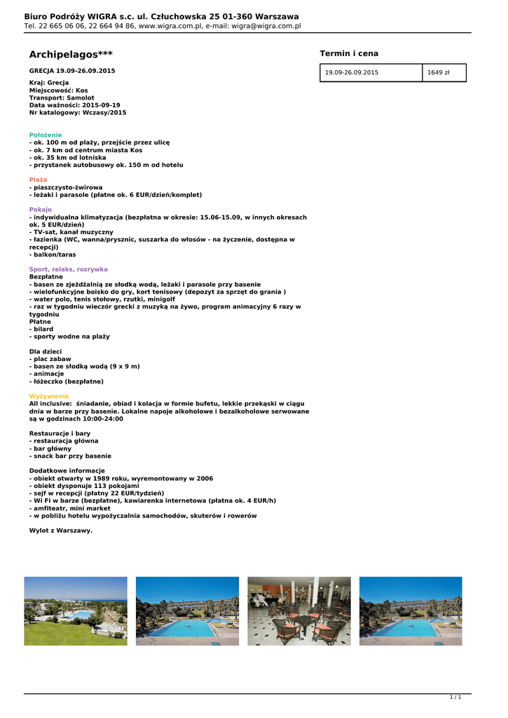 Biuro Podróży WIGRA s.c. ul. Człuchowska 25 01-360 Warszawa Tel. 22 665 06 06, 22 664 94 86, www.wigra.com.pl, e-mail: [email protected] Archipelagos*** GRECJA 19.09-26.09.2015 Termin i cena 19.09-26.09.2015 1649 zł Kraj: Grecja Miejscowość: Kos Transport: Samolot Data ważności: 2015-09-19 Nr katalogowy: Wczasy/2015 Położenie - ok. 100 m od plaży, przejście przez ulicę - ok. 7 km od centrum miasta Kos - ok. 35 km od lotniska - przystanek autobusowy ok. 150 m od hotelu Plaża - piaszczysto-żwirowa - leżaki i parasole (płatne ok. 6 EUR/dzień/komplet) Pokoje - indywidualna klimatyzacja (bezpłatna w okresie: 15.06-15.09, w innych okresach ok. 5 EUR/dzień) - TV-sat, kanał muzyczny - łazienka (WC, wanna/prysznic, suszarka do włosów - na życzenie, dostępna w recepcji) - balkon/taras Sport, relaks, rozrywka Bezpłatne - basen ze zjeżdżalnią ze słodką wodą, leżaki i parasole przy basenie - wielofunkcyjne boisko do gry, kort tenisowy (depozyt za sprzęt do grania ) - water polo, tenis stołowy, rzutki, minigolf - raz w tygodniu wieczór grecki z muzyką na żywo, program animacyjny 6 razy w tygodniu Płatne - bilard - sporty wodne na plaży Dla dzieci - plac zabaw - basen ze słodką wodą (9 x 9 m) - animacje - łóżeczko (bezpłatne) Wyżywienie All inclusive: śniadanie, obiad i kolacja w formie bufetu, lekkie przekąski w ciągu dnia w barze przy basenie. Lokalne napoje alkoholowe i bezalkoholowe serwowane są w godzinach 10:00-24:00 Restauracje i bary - restauracja główna - bar główny - snack bar przy basenie Dodatkowe informacje - obiekt otwarty w 1989 roku, wyremontowany w 2006 - obiekt dysponuje 113 pokojami - sejf w recepcji (płatny 22 EUR/tydzień) - Wi Fi w barze (bezpłatne), kawiarenka internetowa (płatna ok. 4 EUR/h) - amfiteatr, mini market - w pobliżu hotelu wypożyczalnia samochodów, skuterów i rowerów Wylot z Warszawy. 1/1 Powered by TCPDF (www.tcpdf.org)