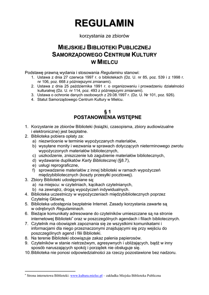 REGULAMIN korzystania ze zbiorów MIEJSKIEJ BIBLIOTEKI PUBLICZNEJ SAMORZĄDOWEGO CENTRUM KULTURY W MIELCU Podstawę prawną wydania i stosowania Regulaminu stanowi: 1. Ustawa z dnia 27 czerwca 1997 r. o bibliotekach (Dz. U. nr 85, poz. 539 i z 1998 r. nr 106, poz. 668 z późniejszymi zmianami). 2. Ustawa z dnia 25 października 1991 r. o organizowaniu i prowadzeniu działalności kulturalnej (Dz. U. nr 114, poz. 493 z późniejszymi zmianami). 3. Ustawa o ochronie danych osobowych z 29.08.1997 r. (Dz. U. Nr 101, poz. 926). 4. Statut Samorządowego Centrum Kultury w Mielcu. §1 POSTANOWIENIA WSTĘPNE 1. Korzystanie ze zbiorów Biblioteki (książki, czasopisma, zbiory audiowizualne i elektroniczne) jest bezpłatne. 2. Biblioteka pobiera opłaty za: a) niezwrócenie w terminie wypożyczanych materiałów, b) wysyłane monity i wezwania w sprawach dotyczących nieterminowego zwrotu wypożyczonych materiałów bibliotecznych, c) uszkodzenie, zniszczenie lub zagubienie materiałów bibliotecznych, d) wydawanie duplikatów Karty Bibliotecznej (§8.7), e) usługi reprograficzne, f) sprowadzenie materiałów z innej biblioteki w ramach wypożyczeń międzybibliotecznych (koszty przesyłki pocztowej). 3. Zbiory Biblioteki udostępniane są: a) na miejscu: w czytelniach, kącikach czytelnianych, b) na zewnątrz, drogą wypożyczeń indywidualnych. 4. Biblioteka uczestniczy w wypożyczeniach międzybibliotecznych poprzez Czytelnię Główną. 5. Biblioteka udostępnia bezpłatnie Internet. Zasady korzystania zawarte są w odrębnych Regulaminach. 6. Bieżące komunikaty adresowane do czytelników umieszczane są na stronie internetowej Biblioteki oraz w poszczególnych agendach i filiach bibliotecznych. 7. Czytelnik ma obowiązek zapoznania się ze wszystkimi komunikatami i informacjami dla niego przeznaczonymi znajdującymi się przy wejściu do poszczególnych agend i filii Biblioteki. 8. Na terenie Biblioteki obowiązuje zakaz palenia papierosów. 9. Czytelników w stanie nietrzeźwym, agresywnych i ubliżających, bądź w inny sposób naruszających spokój i porządek nie obsługuje się. 10. Biblioteka nie ponosi odpowiedzialności za rzeczy pozostawione bez nadzoru. Strona internetowa Biblioteki: www.kultura.mielec.pl – zakładka Miejska Biblioteka Publiczna §2 KORZYSTANIE Z CZYTELNI 1. Z Czytelni mogą korzystać wszystkie osoby, niezależnie od tego, czy są stałymi czytelnikami Biblioteki. 2. Prawo do korzystania z Czytelni uzyskuje się po: a) złożeniu u dyżurującego bibliotekarza aktualnego dokumentu tożsamości z fotografią (dowód osobisty, prawo jazdy, paszport, legitymacja szkolna), b) wpisaniu się do Rejestru odwiedzin. Wpis ten stanowi jednocześnie zobowiązanie czytelnika do przestrzegania Regulaminu korzystania ze zbiorów Czytelni. 3. Użytkowników Czytelni obowiązuje: a) zachowanie ciszy, b) zakaz wynoszenia materiałów bibliotecznych poza Czytelnię bez wiedzy dyżurującego bibliotekarza. 4. Udostępniane w czytelniach materiały biblioteczne, czytelnik winien zwrócić najpóźniej na 10 minut przed zamknięciem czytelni. 5. Czytelnik może jednorazowo korzystać z 3 tytułów gazet lub czasopism bieżących. 6. Pracownik Biblioteki może też dopuścić wypożyczenie książek lub archiwalnych czasopism ze zbiorów Czytelni, na okres weekendów, świąt. Wypożyczenie następuje bezpośrednio przed zamknięciem Biblioteki, a zwrot – w terminie uzgodnionym z bibliotekarzem, bezpośrednio po jej otwarciu. 7. Przyniesione materiały własne (książki, czasopisma) należy zgłosić dyżurującemu bibliotekarzowi. 8. W Czytelni obowiązuje zakaz spożywania posiłków i napojów. §3 KORZYSTANIE Z WYPOŻYCZALNI BIBLIOTEKI 1. Prawo do korzystania z wypożyczalni mają osoby zamieszkałe, pracujące lub uczące się w Mielcu oraz powiecie mieleckim. 2. Osoby nie spełniające warunków w § 3.1 prawo do korzystania z wypożyczalni uzyskują po opłaceniu kaucji zwrotnej w kwocie 30 zł za jedną książkę. 3. Zamiar wycofania kaucji należy zgłaszać co najmniej 3 dni przed jego realizacją. 4. Kaucja, która nie zostanie odebrana w ciągu roku od daty zwrotu wypożyczonej książki przekazywana jest na konto Biblioteki i wykorzystana na jej cele statutowe. 5. Osoba pełnoletnia przy dokonywaniu zapisu do Biblioteki ma obowiązek: a) szczegółowego zapoznania się z Regulaminem Biblioteki, b) wypełnienia karty zapisu, złożenia na niej czytelnego podpisu (którym zobowiązuje się do przestrzegania wszystkich punktów Regulaminu), c) wyrażenia zgody na wykorzystanie danych osobowych do celów statystycznych i związanych ze zwrotem wypożyczonych materiałów bibliotecznych: Dane osobowe, które podaje się przy zapisie do Biblioteki są niezbędne do zawarcia umowy cywilno-prawnej użyczenia materiałów bibliotecznych. Osoby, które nie wyrażą zgody na wykorzystanie swoich danych mają możliwość wypożyczenia książek wpłacając kaucję (§3.2). Czytelnik o tej decyzji winien poinformować Bibliotekę pisemnie. Każdy czytelnik ma prawo wglądu do swoich danych osobowych umieszczonych w ewidencji czytelników oraz ich poprawiania. Administratorem ewidencji czytelników jest MBP SCK w Mielcu. d) okazania bibliotekarzowi aktualnego dokumentu ze zdjęciem, zawierającego numer ewidencyjny (PESEL) oraz adres zamieszkania w celu sprawdzenia zgodności danych w dokumencie z kartą zapisu (dowód osobisty, prawo jazdy), e) osoby nieposiadające zameldowania w powiecie mieleckim, dokument stwierdzający miejsce pracy, nauki. Bibliotekarz corocznie uaktualnia kartę zapisu czytelnika na podstawie danych z ww. dokumentów. 6. Przy zapisie do Biblioteki wymagane są następujące dane: a) nazwisko b) imiona c) PESEL d) imiona rodziców e) zawód wykonywany f) miejsce pracy lub nazwa szkoły g) adres zameldowania stałego / czasowego h) adres do korespondencji (odmienny od adresu zameldowania) i) nr telefonu kontaktowego (za zgodą czytelnika) 7. Za osobę 