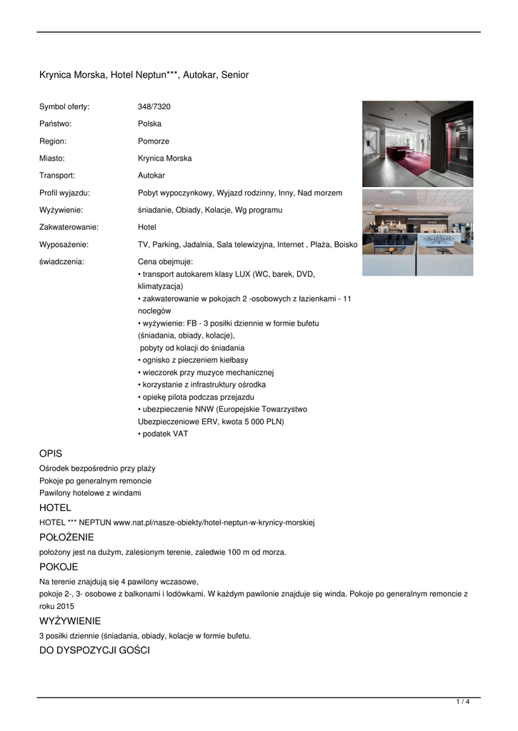 Krynica Morska, Hotel Neptun***, Autokar, Senior Symbol oferty: 348/7320 Państwo: Polska Region: Pomorze Miasto: Krynica Morska Transport: Autokar Profil wyjazdu: Pobyt wypoczynkowy, Wyjazd rodzinny, Inny, Nad morzem Wyżywienie: śniadanie, Obiady, Kolacje, Wg programu Zakwaterowanie: Hotel Wyposażenie: TV, Parking, Jadalnia, Sala telewizyjna, Internet , Plaża, Boisko świadczenia: Cena obejmuje: • transport autokarem klasy LUX (WC, barek, DVD, klimatyzacja) • zakwaterowanie w pokojach 2 -osobowych z łazienkami - 11 noclegów • wyżywienie: FB - 3 posiłki dziennie w formie bufetu (śniadania, obiady, kolacje), pobyty od kolacji do śniadania • ognisko z pieczeniem kiełbasy • wieczorek przy muzyce mechanicznej • korzystanie z infrastruktury ośrodka • opiekę pilota podczas przejazdu • ubezpieczenie NNW (Europejskie Towarzystwo Ubezpieczeniowe ERV, kwota 5 000 PLN) • podatek VAT OPIS Ośrodek bezpośrednio przy plaży Pokoje po generalnym remoncie Pawilony hotelowe z windami HOTEL HOTEL *** NEPTUN www.nat.pl/nasze-obiekty/hotel-neptun-w-krynicy-morskiej POŁOŻENIE położony jest na dużym, zalesionym terenie, zaledwie 100 m od morza. POKOJE Na terenie znajdują się 4 pawilony wczasowe, pokoje 2-, 3- osobowe z balkonami i lodówkami. W każdym pawilonie znajduje się winda. Pokoje po generalnym remoncie z roku 2015 WYŻYWIENIE 3 posiłki dziennie (śniadania, obiady, kolacje w formie bufetu. DO DYSPOZYCJI GOŚCI 1/4 jadalnia, kawiarnia z dyskoteką, świetlica, kompleks boisk sportowych do: siatkówki, koszykówki, piłki ręcznej i nożnej, korty tenisowe, tenis stołowy w oddzielnej hali; wypożyczalnia rowerów, mały plac zabaw dla dzieci, amfiteatr, sala TV, mała biblioteka, miejsce na ognisko, WiFi, salki zabaw dla dzieci i młodzieży, siłownia zewnętrzna DODATKOWO PŁATNE parking ogrodzony, dozorowany, płatny (10zł za dobę, 45zł za tydzień), opłata klimatyczna ok. 2 PLN/os/dzień UWAGI Pobyty turnusu od kolacji w dniu przyjazdu do ośrodka do śniadania w dniu wyjazdu Dojazd własny zniżka 100,- PLN/os. Doba hotelowa od godz. 17.00, kończy się o godz. 10.00 w dniu wyjazdu. Turnus zaczyna się kolacją w dniu przyjazdu, pokoje od ok. godz. 17.00. Turnus kończy się śniadaniem w dniu wyjazdu, wykwaterowanie po śniadaniu. Dodatkowo płatne w ośrodku: opłata klimatyczna. W ośrodku nie przyjmujemy zwierząt domowych. INFORMACJE DOTYCZĄCE PRZEJAZDU AUTOKAREM 1. Prosimy Klientów o zapoznanie sie z ramowym programem imprezy. 2. Miejsca w autokarze docelowym (głównym) są numerowane i przydzielane przez pilota. 3. Dopłata za miejsca dojazdowe (antenki) zawiera opłatę za przejazd w dwie strony. 4. Zbiórka na 15 min. przed planowaną godzina odjazdu. Dojazdy antenowe są ze sobą skomunikowane, co może powodować dłuższe oczekiwanie w miejscach przesiadkowych. 5. Organizator nie ponosi odpowiedzialności za opóźnienia w wyjazdach, powrotach powstałe z przyczyn warunków na drodze (wypadek, nieprzewidziane korki, roboty drogowe, trudnych warunków atmosferycznych, przy powrotach wydłużonych odpraw granicznych. 6. Godziny powrotów są orientacyjne. Godziny wyjazdów mogą ulec zmianie - klient otrzymuje odrębny komunikat z aktualną godziną wyjazdu nie później niż 48 godzin przed wyjazdem. 7. Główne miejsca wyjazdu autokaru docelowego to Katowice lub Cieszyn. W miarę możliwości staramy się uwzględniać prośby dot. miejsc - wpisane w umowie - zgłoszeniu. Organizator zastrzega sobie realizację dojazdów antenowych do głównego miejsca wyjazdu - minibusem, samochodem osobowym, regularnymi połączeniami - liniami autobusowymi, pociągiem bez opieki pilota. Istnieje możliwość ustalenia innego miejsca wyjazdu - po uzgodnieniu z Organizatorem. 8. Postoje w trakcie podróży są organizowane co ok. 3,5,-4,5 godz - zgodnie z czasem pracy kierowców a także w miejscach odpowiednich. 9. Organizator zastrzega sobie prawo odwołania dojazdów antenowych z poszczególnych miast najpóźniej na 48 godz przed rozpoczęciem imprezy (wymagana ilość osób - min 5 na każdej trasie). 10. Uczestnik zobowiązany jest do posiadania aktualnego dokumentu tożsamości. 11. Uczestnikowi przysługuje w ramach wykupionego 1 miejsca - 1 bagaż podręczny - o max wadze 5 kg, 1 bagaż główny o max wadze 20 kg. Atrakcje: KRYNICA MORSKA to znana miejscowość wypoczynkowa, leżąca na Mierzei Wiślanej między Morzem Bałtyckim a Zalewem Wiślanym. Na wczasowiczów czekają szerokie plaże, wydmy i lasy sosnowe. Czyste powietrze oraz odkryte źródła solankowe czynią z Krynicy Morskiej znane uzdrowisko. Dzięki dogodnemu położeniu stanowi doskonałą bazę wypadową do Gdańska, Malborka czy Fromborka. TERMINY: od: 2017-09-12 do: 2017-09-23 (12 dni), miejsca: sprawdź miejsca cena od: 1570 PLN CENNIK: Długość pobytu: 12 dni Grupa cenowa: B1 Transport (obligatoryjny) 2/4 (*) Autokar klasy Lux Miasto wyjazdowe (do wyboru) Pszczyna - obok sklepu ALDI ul. Broniewskiego 1 Ruda Śląska - C.H. Plaza ul. 1go Maja 310 Jastrzębie Zdrój - Dworzec PKS ul. Sybiraków Łódź - Dworzec PKP (Łódź Kaliska) Al. Unii Lubelsk Katowice - Plac Andrzeja (tył dworca PKP) Opole parking za sklepem Biedronka ul. 1go Maja Knurów - Stacja Orlen, ul. 1go Maja 9 Jaworzno - Hala Widowiskowo Sport. ul.Grunwaldzka Wodzisław Stacja Statoil, Wincentego Witosa 24 Andrychów, Zatoczka przy WSW Andronia Wrocław Stacja BP ul. Karkonoska 63 Sosnowiec - Stacja Shell, ul. Kresowa 2 Kraków - za hotelem Cracovia ul. Kałuży Mysłowice, Magnolia Stacja BP, ul. Katowicka Skarżysko Kamienna, parking Dworzec PKP Żywiec, Stacja Statoil ul. Wesoła 124 Zabrze - Hala Widowiskowo Sport. ul. Matejki 6 Radom - Dworzec PKP (parking przy zegarze) Jędrzejów - zatoka przed Rynkiem, ul. Kielecka Katowice Giszowiec ul. Młodzieżowa 10 Dąbrowa Górnicza - CH Real, ul. Katowicka 1 Chrzanów, Stacja Shell ul. Trzebińska Rzeszów - Stacja Shell ul. Lubelska 4a (*) Tarnów - vis 