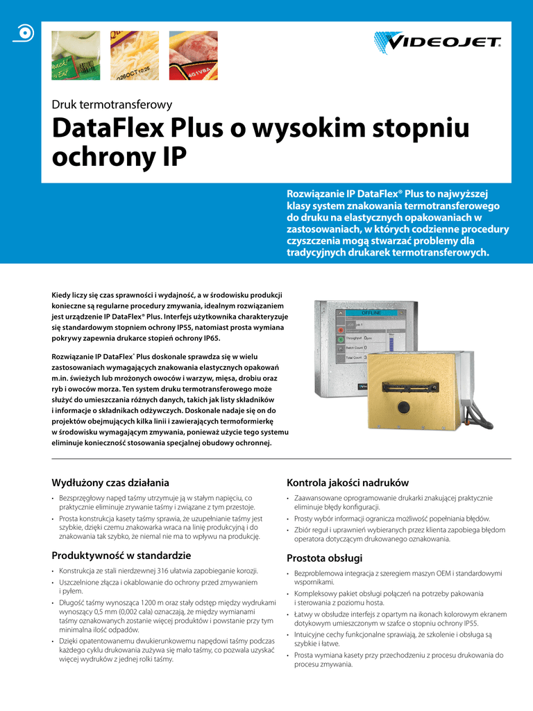 Druk termotransferowy DataFlex Plus o wysokim stopniu ochrony IP Rozwiązanie IP DataFlex® Plus to najwyższej klasy system znakowania termotransferowego do druku na elastycznych opakowaniach w zastosowaniach, w których codzienne procedury czyszczenia mogą stwarzać problemy dla tradycyjnych drukarek termotransferowych. Kiedy liczy się czas sprawności i wydajność, a w środowisku produkcji konieczne są regularne procedury zmywania, idealnym rozwiązaniem jest urządzenie IP DataFlex® Plus. Interfejs użytkownika charakteryzuje się standardowym stopniem ochrony IP55, natomiast prosta wymiana pokrywy zapewnia drukarce stopień ochrony IP65. Rozwiązanie IP DataFlex® Plus doskonale sprawdza się w wielu zastosowaniach wymagających znakowania elastycznych opakowań m.in. świeżych lub mrożonych owoców i warzyw, mięsa, drobiu oraz ryb i owoców morza. Ten system druku termotransferowego może służyć do umieszczania różnych danych, takich jak listy składników i informacje o składnikach odżywczych. Doskonale nadaje się on do projektów obejmujących kilka linii i zawierających termoformierkę w środowisku wymagającym zmywania, ponieważ użycie tego systemu eliminuje konieczność stosowania specjalnej obudowy ochronnej. Wydłużony czas działania Kontrola jakości nadruków • Bezsprzęgłowy napęd taśmy utrzymuje ją w stałym napięciu, co praktycznie eliminuje zrywanie taśmy i związane z tym przestoje. • Zaawansowane oprogramowanie drukarki znakującej praktycznie eliminuje błędy konfiguracji. • Prosta konstrukcja kasety taśmy sprawia, że uzupełnianie taśmy jest szybkie, dzięki czemu znakowarka wraca na linię produkcyjną i do znakowania tak szybko, że niemal nie ma to wpływu na produkcję. • Prosty wybór informacji ogranicza możliwość popełniania błędów. Produktywność w standardzie Prostota obsługi • Konstrukcja ze stali nierdzewnej 316 ułatwia zapobieganie korozji. • Bezproblemowa integracja z szeregiem maszyn OEM i standardowymi wspornikami. • Uszczelnione złącza i okablowanie do ochrony przed zmywaniem i pyłem. • Długość taśmy wynosząca 1200 m oraz stały odstęp między wydrukami wynoszący 0,5 mm (0,002 cala) oznaczają, że między wymianami taśmy oznakowanych zostanie więcej produktów i powstanie przy tym minimalna ilość odpadów. • Dzięki opatentowanemu dwukierunkowemu napędowi taśmy podczas każdego cyklu drukowania zużywa się mało taśmy, co pozwala uzyskać więcej wydruków z jednej rolki taśmy. • Zbiór reguł i uprawnień wybieranych przez klienta zapobiega błędom operatora dotyczącym drukowanego oznakowania. • Kompleksowy pakiet obsługi połączeń na potrzeby pakowania i sterowania z poziomu hosta. • Łatwy w obsłudze interfejs z opartym na ikonach kolorowym ekranem dotykowym umieszczonym w szafce o stopniu ochrony IP55. • Intuicyjne cechy funkcjonalne sprawiają, że szkolenie i obsługa są szybkie i łatwe. • Prosta wymiana kasety przy przechodzeniu z procesu drukowania do procesu zmywania. DataFlex Plus Druk termotransferowy Głowica drukująca Standardowa konfiguracja master/slave opcji instalacji 53 mm, 300 dpi (12 pkt./mm) Maksymalnie cztery drukarki IP DataFlex® Plus sterowane za pomocą jednej jednostki sterującej CLARiTY Obszar wydruku Tryb drukowania przerywany: 53 mm (2,1 cala) (szerokość) x 75 mm (3,0 cala) (długość) (opcja prawostronna), 53 mm (2,1 cala) (szerokość) x 68 mm (2,7 cala) (długość) (opcja lewostronna) Tryb drukowania ciągły: 53 mm (2,1 cala) (szerokość) x 200 mm (7,9 cala) (długość) Prędkość minimalna druku Tryb przerywany: 50 mm/s (1,96 cala/s) Tryb ciągły: 0 mm/s (0 cala/s) Prędkość maksymalna druku Tryb przerywany: 800 mm/s (31,5 cala/s) Tryb ciągły: 1000 mm/s (39,4 cala/s) Możliwości drukowania Pełna obsługa czcionek TrueType® gotowych do pobrania (w tym obsługa wielojęzykowa i Unicode); obsługa pól stałych, zmiennych i scalonych; elastyczne formaty daty/godziny; elastyczne formaty kodu zmiany roboczej; automatyczne obliczanie daty przydatności i zarządzanie dopuszczalnymi zakresami; reguły kalendarza; automatyczne zwiększanie/ zmniejszanie rozmiaru tekstu, liczników i kodów kreskowych; obsługa wielu formatów graficznych (do maksymalnego obszaru druku); pola łączy do bazy danych; skalowalny tekst i bloki tekstowe. Kody kreskowe Tryb przeglądarki internetowej Zdalne sterowanie jednostkami IP DataFlex® Plus z interfejsu modułu sterowania maszyną pakującą na poziomie hosta Połączenia zewnętrzne Obsługa RS232, Ethernet, karty pamięci USB i skanera, protokoły komunikacji binarnej i ASCII, komunikaty CimComms, sterowniki systemu Windows oraz emulacje ZPL Wejścia/wyjścia zewnętrzne 3 wejścia PNP 2 wyjścia przekaźnikowe i 2 wyjścia PNP +24 V Doprowadzenie powietrza 6 barów, 90 psi, niezanieczyszczone Zasilanie elektryczne 90–264 V Temperatura robocza 2–40°C* * Z wybranymi taśmami. Rzeczywista instalacja może wymagać dodatkowego sprzętu stosownie do warunków środowiska pracy. Panel sterowania EAN 8, EAN 13, UPC-A, UPC-E, Code 39, EAN 128, Code 128, ITF, RSS (w tym kody kompozytowe 2D); inne dostępne na zamówienie Szafa kontrolera o stopniu ochrony IP55 i drukarka o stopniu ochrony IP65 z kasetą ochronną Wsporniki Dostępne wykonanie ze stali nierdzewnej; różne konstrukcje do szerokiej gamy urządzeń pakujących 230,00 mm (9,06 cala) Ochrona środowiska 254,50 mm (10,00 cala) Pełnokolorowy ekran dotykowy LCD 800x600 SVGA TFT, podgląd druku WYSIWYG, pełna zintegrowana diagnostyka, 3 poziomy zabezpieczenia hasłem, obsługa wielu języków 92,00 mm (3,62 cala) 244,00 mm (9,61 cala) Interfejs operatora Gama taśm Maks. długość taśmy Jednostka obrazująca (widoczna z założoną osłoną do zmywania) Dostępne długości do 1200 metrów, zależnie od szerokości i koloru taśmy Nominalny odstęp między kolejnymi wydrukami 0,5 mm (0,002 cala) Funkcje oszczęd