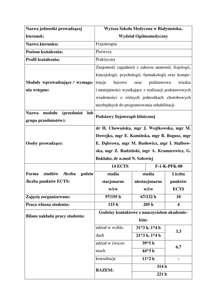 Nazwa jednostki prowadzącej Wyższa Szkoła Medyczna w Białymstoku, kierunek: Wydział Ogólnomedyczny Nazwa kierunku: Fizjoterapia Poziom kształcenia: Pierwszy Profil kształcenia: Praktyczny Znajomość zagadnień z zakresu anatomii, fizjologii, kinezjologii, psychologii, farmakologii oraz kompe- Moduły wprowadzające / wymaga- tencje nia wstępne: bazowe oraz podstawowa wiedza i umiejętności wynikające z realizacji podstawowych wiadomości o różnych jednostkach chorobowych niezbędnych do programowania rehabilitacji. Nazwa modułu (przedmiot lub grupa przedmiotów): Podstawy fizjoterapii klinicznej dr H. Chowańska, mgr J. Wojtkowska, mgr M. Dowejko, mgr E. Kamińska, mgr B. Bogusz, mgr Osoby prowadzące: E. Dąbrowa, mgr M. Busłowicz, mgr I. Stalbowska, mgr Z. Rudziński, mgr A. Kramarewicz, G. Bokłaho, dr n.med N. Sołowiej 14 ECTS Forma studiów /liczba godzin F-1-K-PFK-08 studia studia Liczba stacjonarne niestacjonarne punktów w/ćw w/ćw ECTS Zajęcia zorganizowane: 97/195 h 67/132 h 10 Praca własna studenta: 115 h 205 h 4 /liczba punktów ECTS: Bilans nakładu pracy studenta: Godziny kontaktowe z nauczycielem akademickim: udział w wykła- 31*3 h, 1*4 h dach 21*3 h, 1*4 h udział w ćwicze- 39*5 h niach 44*3 h konsultacje 11*2 h RAZEM: 3,3 6,7 314 h 221 h Samodzielna praca studenta: przygotowanie do 73 h ćwiczeń 152 h przygotowanie do 11*2 h kolokwiów 11*3 h przygotowanie do 20 h egzaminu 20 h RAZEM: 4 115 h 205 h Cele modułu: Celem modułu jest zapoznanie z miejscem fizjoterapii w procesie leczenia, poznanie podstawowych wiadomości o różnych jednostkach chorobowych niezbędnych do programowania fizjoterapii, przedstawienie znaczenia stosowania ruchu i zabiegów fizykalnych jako środka leczniczego, nauczenie wykonywania ćwiczeń leczniczych i stosowania zabiegów fizykoterapeutycznych u osób z chorobami wewnętrznymi, opanowanie podstawowej problematyki klinicznej dotyczącej najczęściej występujących chorób wewnętrznych, nauczenie odpowiedniego doboru wybranych technik fizjoterapeutycznych w zależności od stanu zdrowia chorego i jego wieku, opanowaniem podstawowych metod diagnostycznych stosowanych w badaniu układu sercowo-naczyniowego i oddechowego, przyswojenie przez studentów systematyki i metodyki prowadzenia ćwiczeń usprawniających w chorobach wewnętrznych, zapoznanie ze wskazaniami i przeciwwskazaniami do prowadzenia ćwiczeń ruchowych i zabiegów fizykalnych w różnych jednostkach chorobowych, zapoznanie z podstawami stosowania ćwiczeń i zabiegów z zakresu kinezyterapii i fizykoterapii zalecanych w schorzeniach poszczególnych układów i narządów, nauczenie opracowywania programu usprawniania w zależności od przebiegu choroby pacjenta, opanowanie metodyki ćwiczeń w różnych grupach wiekowych. Efekty kształcenia: Odniesienie do Przedmiotowy efekt kształcenia Efekty kształcenia kierunkowych efektów kształcenia P_W01 Opisuje i interpretuje podstawowe jednostki i zespoły K_W02 chorobowe w stopniu umożliwiającym racjonalne sto- K_W08 sowanie środków fizjoterapii i planowanie procesu rehabilitacji. P_W02 Rozumie specyfikę i różnorodność poszczególnych K_W04 jednostek chorobowych, dobieranie zabiegów fizjotera- K_W06 peutycznych i metod fizjoterapii stosownie do rozpo- K_W07 znania klinicznego, okresu choroby i funkcjonalnego K_W08 stanu rehabilitowanej osoby. P_W03 Wymienia ćwiczenia lecznicze i zabiegi fizykalne K_W04 u osób z dysfunkcjami narządu ruchu jak i w chorobach K_W06 wewnętrznych – stosownie do ich stanu klinicznego K_W07 i funkcjonalnego; wykonywania badań i testów nie- K_W08 zbędnych dla doboru środków fizjoterapii; wykonywania zabiegów i stosowania odpowiednich metod terapeutycznych. P_U01 Umie przeprowadzić badanie diagnostyczne i funkcjo- K_U11 nalne dla potrzeb tworzenia, weryfikacji i modyfikacji K_U12 programu rehabilitacji osób z różnymi dysfunkcjami; K_U13 K_U14 K_U22 K_U23 P_U02 Umie zaprogramować postępowanie związane z rege- K_U01 neracją, kompensacją, adaptacją i rehabilitacją osób K_U02 z dysfunkcjami narządów ruchu i innymi schorzeniami K_U03 dostosowane do stanu klinicznego i celów komplekso- K_U04 wej rehabilitacji. K_U05 K_U07 K_U08 K_U10 K_U17 K_U20 K_U22 K_U23 K_U24 P_K01 Ocena stopnia niepełnosprawności ze szczególnym K_K05 uwzględnieniem dysfunkcji narządu ruchu, ukierunko- K_K09 wanie osoby niepełnosprawnej na pomoc w poszukiwaniu źródeł finansowania dysfunkcji. P_K02 Praktyczne rozpoznanie czynników determinujących K_K05 możliwość podjęcia pracy osoby niepełnosprawnej. P_K03 K_K07 Koncepcja planu aktywizacji kulturalnej i społecznej K_K23 chorego niepełnosprawnego. P_K04 Pomoc w akceptacji osoby niepełnosprawnej w najbliż- K_K04 szym otoczeniu: rodziny, znajomych; zapobieganie K_K05 wykluczeniu. K_K06 K_K07 Wiedza - student: • Opisuje i interpretuje podstawowe jednostki i zespoły chorobowe w stopniu umożliwiającym racjonalne stosowanie środków fizjoterapii i planowanie procesu rehabilitacji. • Rozumie specyfikę i różnorodność poszczególnych jednostek chorobowych, dobieranie zabiegów fizjoterapeutycznych i metod fizjoterapii stosownie do rozpoznania klinicznego, okresu choroby i funkcjonalnego stanu rehabilitowanej osoby. • Wymienia ćwiczenia lecznicze i zabiegi fizykalne u osób z dysfunkcjami narządu ruchu jak i w chorobach wewnętrznych – stosownie do ich stanu klinicznego i funkcjonalnego; wykonywania badań i testów niezbędnych dla doboru środków fizjoterapii; wykonywania zabiegów i stosowania odpowiednich metod terapeutycznych. Umiejętności - student: • Umie przeprowadzić badanie diagnostyczne i funkcjonalne dla potrzeb tworzenia, weryfikacji i modyfikacji programu rehabilitacji osób z różnymi dysfunkcjami; • Umie zaprogramować postępowanie związane z regeneracją, kompensacją, adaptacją i rehabilitacją osób z dysfunkcjami narządów ruchu i innymi schorzeniami dostosowane do stanu