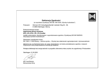 Deklaracja Zgodności (w rozumieniu Dyrektywy WE 89/ 106/ EWG „Wyroby budowlane”) Producent: Hörmann KG Verkaufsgesellschaft, Upheider Weg 94 – 98, D 33803 Steinhagen, Niemcy Rodzaj konstrukcji wyrobu: Segmentowe Bramy Garażowe EPU, LPU, ETE, LTE, LTH, EcoStar zostały opracowane, skonstruowane i wyprodukowane zgodnie z Dyrektywą WE 89/106/EWG dotyczącą wyrobów budowlanych Stosowane i powoływane normy: EN 13241-1: 2003 Bramy – Norma wyrobu – Wyroby bez właściwości ognioodporności i dymoszczelności Zabrania się uruchamiania bramy do czasu stwierdzenia, że bramę zainstalowano zgodnie z naszymi Wytycznymi oraz przeprowadzono kontrolę jej działania. Niniejsza deklaracja traci swoją ważność w przypadku dokonania zmiany wyrobu nie uzgodnionej z Producentem. Steinhagen, 01.05.2005 ppa. Axel Becker, kierownictwo firmy