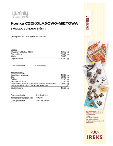 Kostka CZEKOLADOWO-MIĘTOWA z MELLA-SCHOKO-RÜHR (Rezeptura na 1 formę 60 cm x 40 cm) Ciasto: MELLA-SCHOKO-RÜHR Olej roślinny Woda Ciężar ciasta Czas miesienia: 1,250 kg 0,500 kg 0,500 l 2,250 kg 3 – 4 minuty Krem miętowy: Śmietana, kwaśna Jajo Cukier Skrobia pszenna DREIDOPPEL KONDITOREIPASTE CREME DE MENTHE DREIDOPPEL PISTAZIENGRÜN PLUS Ciężar kremu Czas miesienia: Temperatura pieczenia: Czas pieczenia: 2 – 3 minuty 190 °C 30 – 35 minut 1,000 kg 0,200 kg 0,200 kg 0,100 kg 0,050 kg q.s. 1,550 kg Wskazówki przygotowania: Wszystkie składniki ciasta wymieszać na gładko i ok. 1,500 kg wyłożyć na formę z papierem. Następnie na ciasto wyłożyć krem miętowy. Pozostałą część ciasta nanieść na krem miętowy tworząc pasy. Przy pomocy widelca utworzyć marmurkowe kształty i upiec.