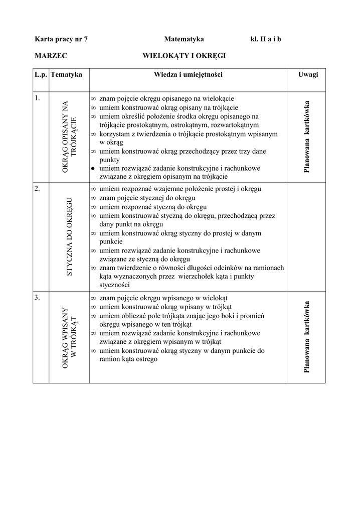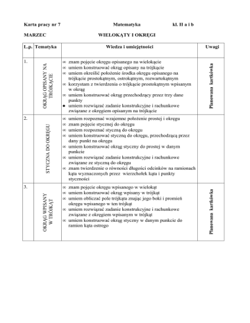 Karta pracy nr 7 Matematyka WIELOKĄTY I OKRĘGI STYCZNA DO OKRĘGU 2. OKRĄG WPISANY W TRÓJKĄT 3. Wiedza i umiejętności • znam pojęcie okręgu opisanego na wielokącie • umiem konstruować okrąg opisany na trójkącie • umiem określić położenie środka okręgu opisanego na trójkącie prostokątnym, ostrokątnym, rozwartokątnym • korzystam z twierdzenia o trójkącie prostokątnym wpisanym w okrąg • umiem konstruować okrąg przechodzący przez trzy dane punkty umiem rozwiązać zadanie konstrukcyjne i rachunkowe związane z okręgiem opisanym na trójkącie Uwagi • • • • umiem rozpoznać wzajemne położenie prostej i okręgu znam pojęcie stycznej do okręgu umiem rozpoznać styczną do okręgu umiem konstruować styczną do okręgu, przechodzącą przez dany punkt na okręgu • umiem konstruować okrąg styczny do prostej w danym punkcie • umiem rozwiązać zadanie konstrukcyjne i rachunkowe związane ze styczną do okręgu • znam twierdzenie o równości długości odcinków na ramionach kąta wyznaczonych przez wierzchołek kąta i punkty styczności • znam pojęcie okręgu wpisanego w wielokąt • umiem konstruować okrąg wpisany w trójkąt • umiem obliczać pole trójkąta znając jego boki i promień okręgu wpisanego w ten trójkąt • umiem rozwiązać zadanie konstrukcyjne i rachunkowe związane z okręgiem wpisanym w trójkąt • umiem konstruować okrąg styczny w danym punkcie do ramion kąta ostrego Planowana kartkówka 1. OKRĄG OPISANY NA TRÓJKĄCIE L.p. Tematyka Planowana kartkówka MARZEC kl. II a i b 5. WIELOKĄTY FOREMNE – OKRĘGI WPISANE I OPISANE WIELOKĄTY FOREMNE 4. • znam pojęcie wielokąta foremnego i jego własności • umiem konstruować sześciokąt i ośmiokąt foremny wpisany w okrąg o danym promieniu • umiem obliczyć miarę kąta wewnętrznego wielokąta foremnego • umiem wskazać wielokąty foremne środkowosymetryczne • umiem podać ilość osi symetrii wielokąta foremnego umiem rozwiązać zadanie tekstowe związane z wielokątami foremnymi • umiem obliczyć długość promienia okręgu wpisanego w kwadrat o danym boku • umiem obliczyć długość promienia okręgu opisanego na kwadracie o danym boku • umiem obliczyć długość promienia, pole lub obwód koła opisanego i wpisanego w trójkąt równoboczny o danym boku • umiem wpisać i opisać okrąg na wielokącie • umiem rozwiązać zadanie tekstowe związane z okręgami wpisanymi i opisanymi na wielokątach foremnych • rozumiem warunek wpisywania i opisywania okręgu na czworokącie Źródło: podręcznik Matematyka 2, wyd. GWO, str. 156 – 177 Zadania treningowe do sprawdzianu: podręcznik Matematyka 2, wyd. GWO, str. 178 – 180 Po zakończeniu tej kart pracy planowany jest sprawdzian z jej zakresu. Przybory potrzebne na każdą lekcję z tej karty pracy: ołówek, gumka, linijka, ekierka, cyrkiel, kątomierz