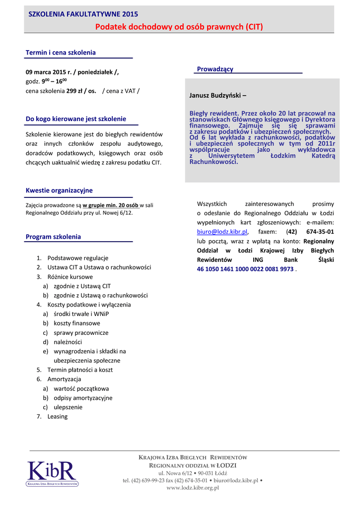 SZKOLENIA FAKULTATYWNE 2015 Podatek dochodowy od osób prawnych (CIT) Termin i cena szkolenia 09 marca 2015 r. / poniedziałek /, godz. 900 – 1600 cena szkolenia 299 zł / os. / cena z VAT / Do kogo kierowane jest szkolenie Szkolenie kierowane jest do biegłych rewidentów oraz innych członków zespołu audytowego, doradców podatkowych, księgowych oraz osób chcących uaktualnić wiedzę z zakresu podatku CIT. Prowadzący Janusz Budzyński – Biegły rewident. Przez około 20 lat pracował na stanowiskach Głównego księgowego i Dyrektora finansowego. Zajmuje się się sprawami z zakresu podatków i ubezpieczeń społecznych. Od 6 lat wykłada z rachunkowości, podatków i ubezpieczeń społecznych w tym od 2011r wspólpracuje jako wykładowca z Uniwersytetem Łodzkim Katedrą Rachunkowości. Kwestie organizacyjne Zajęcia prowadzone są w grupie min. 20 osób w sali Regionalnego Oddziału przy ul. Nowej 6/12. Program szkolenia 1. Podstawowe regulacje 2. Ustawa CIT a Ustawa o rachunkowości 3. Różnice kursowe a) zgodnie z Ustawą CIT b) zgodnie z Ustawą o rachunkowości 4. Koszty podatkowe i wyłączenia a) środki trwałe i WNiP b) koszty finansowe c) sprawy pracownicze d) należności e) wynagrodzenia i składki na ubezpieczenia społeczne 5. Termin płatności a koszt 6. Amortyzacja a) wartość początkowa b) odpisy amortyzacyjne c) ulepszenie 7. Leasing Wszystkich zainteresowanych prosimy o odesłanie do Regionalnego Oddziału w Łodzi wypełnionych kart zgłoszeniowych: e-mailem: [email protected], faxem: (42) 674-35-01 lub pocztą, wraz z wpłatą na konto: Regionalny Oddział w Łodzi Krajowej Izby Biegłych Rewidentów ING Bank Śląski 46 1050 1461 1000 0022 0081 9973 . KRAJOWA IZBA BIEGŁYCH REWIDENTÓW REGIONALNY ODDZIAŁ W ŁODZI ul. Nowa 6/12 • 90-031 Łódź tel. (42) 639-99-23 fax (42) 674-35-01 • [email protected] • www.lodz.kibr.org.pl