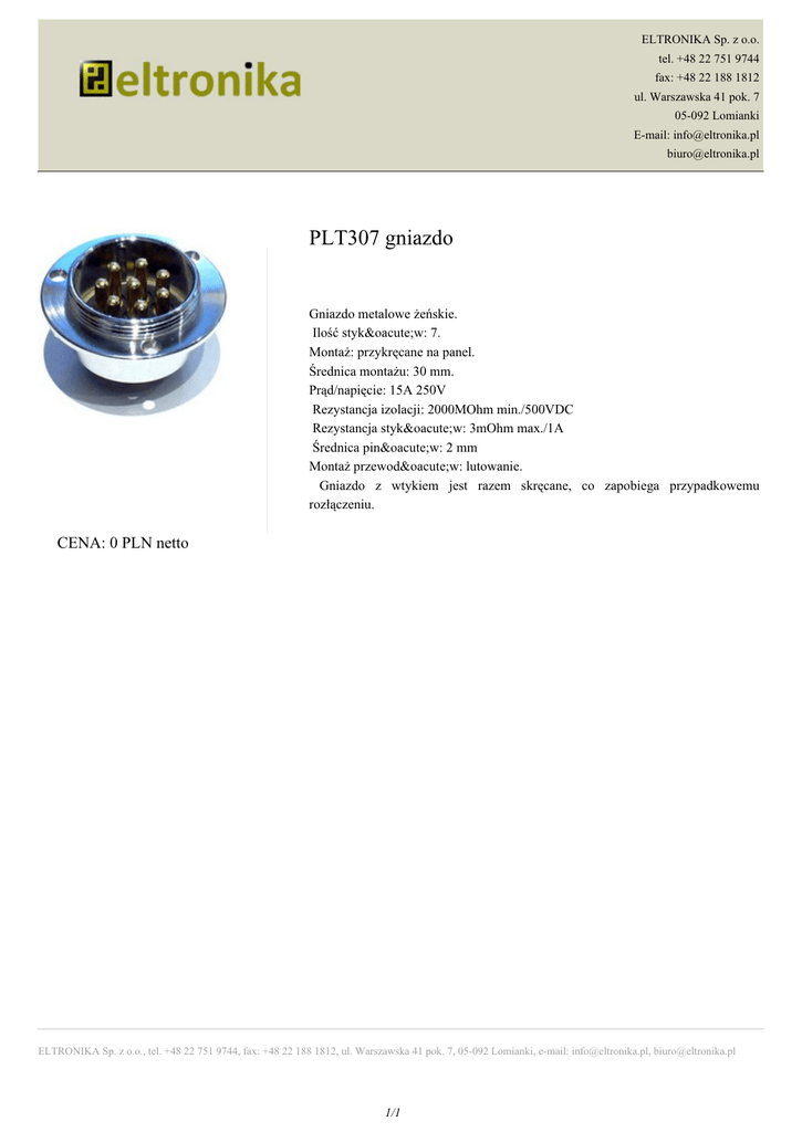 ELTRONIKA Sp. z o.o. tel. +48 22 751 9744 fax: +48 22 188 1812 ul. Warszawska 41 pok. 7 05-092 Lomianki E-mail: [email protected] [email protected] PLT307 gniazdo Gniazdo metalowe żeńskie. Ilość styków: 7. Montaż: przykręcane na panel. Średnica montażu: 30 mm. Prąd/napięcie: 15A 250V Rezystancja izolacji: 2000MOhm min./500VDC Rezystancja styków: 3mOhm max./1A Średnica pinów: 2 mm Montaż przewodów: lutowanie. Gniazdo z wtykiem jest razem skręcane, co zapobiega przypadkowemu rozłączeniu. CENA: 0 PLN netto ELTRONIKA Sp. z o.o., tel. +48 22 751 9744, fax: +48 22 188 1812, ul. Warszawska 41 pok. 7, 05-092 Lomianki, e-mail: [email protected], [email protected] 1/1