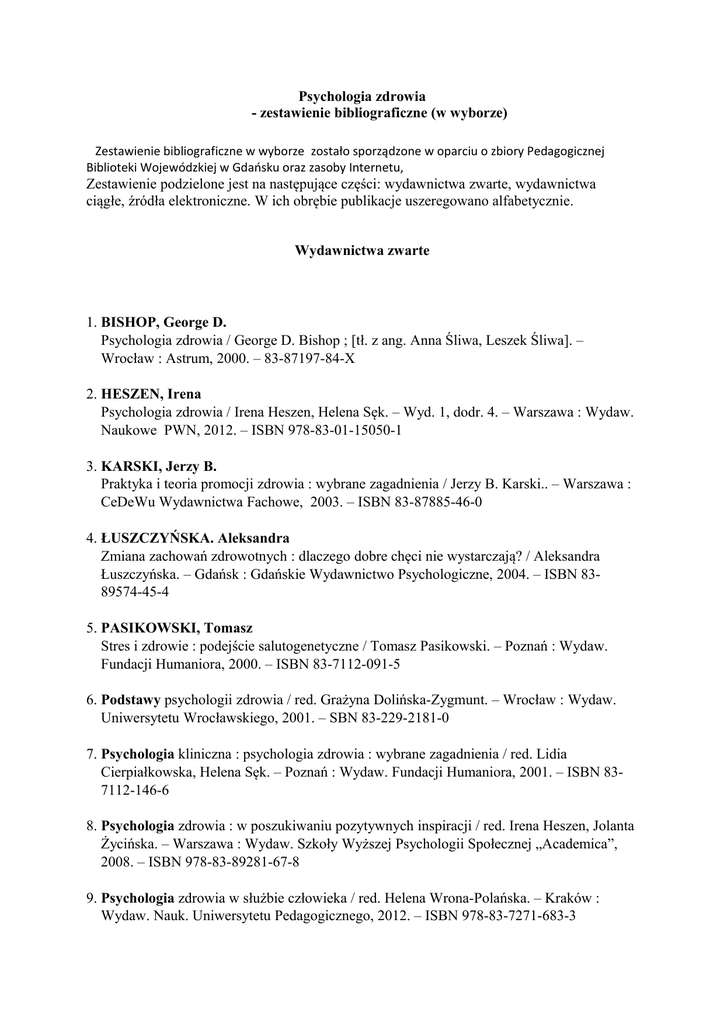 Psychologia zdrowia - zestawienie bibliograficzne (w wyborze) Zestawienie bibliograficzne w wyborze zostało sporządzone w oparciu o zbiory Pedagogicznej Biblioteki Wojewódzkiej w Gdańsku oraz zasoby Internetu, Zestawienie podzielone jest na następujące części: wydawnictwa zwarte, wydawnictwa ciągłe, źródła elektroniczne. W ich obrębie publikacje uszeregowano alfabetycznie. Wydawnictwa zwarte 1. BISHOP, George D. Psychologia zdrowia / George D. Bishop ; [tł. z ang. Anna Śliwa, Leszek Śliwa]. – Wrocław : Astrum, 2000. – 83-87197-84-X 2. HESZEN, Irena Psychologia zdrowia / Irena Heszen, Helena Sęk. – Wyd. 1, dodr. 4. – Warszawa : Wydaw. Naukowe PWN, 2012. – ISBN 978-83-01-15050-1 3. KARSKI, Jerzy B. Praktyka i teoria promocji zdrowia : wybrane zagadnienia / Jerzy B. Karski.. – Warszawa : CeDeWu Wydawnictwa Fachowe, 2003. – ISBN 83-87885-46-0 4. ŁUSZCZYŃSKA. Aleksandra Zmiana zachowań zdrowotnych : dlaczego dobre chęci nie wystarczają? / Aleksandra Łuszczyńska. – Gdańsk : Gdańskie Wydawnictwo Psychologiczne, 2004. – ISBN 8389574-45-4 5. PASIKOWSKI, Tomasz Stres i zdrowie : podejście salutogenetyczne / Tomasz Pasikowski. – Poznań : Wydaw. Fundacji Humaniora, 2000. – ISBN 83-7112-091-5 6. Podstawy psychologii zdrowia / red. Grażyna Dolińska-Zygmunt. – Wrocław : Wydaw. Uniwersytetu Wrocławskiego, 2001. – SBN 83-229-2181-0 7. Psychologia kliniczna : psychologia zdrowia : wybrane zagadnienia / red. Lidia Cierpiałkowska, Helena Sęk. – Poznań : Wydaw. Fundacji Humaniora, 2001. – ISBN 837112-146-6 8. Psychologia zdrowia : w poszukiwaniu pozytywnych inspiracji / red. Irena Heszen, Jolanta Życińska. – Warszawa : Wydaw. Szkoły Wyższej Psychologii Społecznej „Academica”, 2008. – ISBN 978-83-89281-67-8 9. Psychologia zdrowia w służbie człowieka / red. Helena Wrona-Polańska. – Kraków : Wydaw. Nauk. Uniwersytetu Pedagogicznego, 2012. – ISBN 978-83-7271-683-3 10. Zdrowie – stres – choroba w wymiarze psychologicznym / red. Helena Wrona-Polańska. – Kraków : Impuls, 2008. – ISBN 978-83-7308-927-3 11. Zdrowie i choroba : problemy teorii, diagnozy i praktyki / red. nauk. Jerzy M. Brzeziński, Lidia Cierpiałkowska. – Gdańsk : Gdańskie Wydawnictwo Psychologiczne, 2008. – ISBN 978-83-7489-169-1 Wydawnictwa ciągłe 1. BIG diabeł tkwi w regułach / Jacek Santorski //Charaktery . – 2001, nr 7, s. 26 - 27 2. CO czwarty z nas / Katherina C. Nordal // Charaktery . – 2013, nr 9, s. 42 – 45 3. CZŁOWIEK jako psychofizyczna jedność odporna na stres / Magda Mastalerz // Remedium . – 2009, nr 6, s. 22 - 23 4. DUSZE drugiego obiegu / Elżbieta Isakiewicz // Tygodnik Powszechny . – 2010, nr 50, s. 3 – 5 5. JAK powalczyć o zdrową duszę / Agnieszka Szamowska – Bartnicka // Gazeta Wyborcza . – 2013, nr 259, s. 21 6. KARTA Zdrowia Psychicznego / Polskie Towarzystwo Higieny Psychicznej // Lider . – 2000, nr 1, s. 29 - 30 7. LECZENIE zaburzeń odżywiania - ,, naprawa’’ systemu rodzinnego / Marta Sławińska // Remedium . – 2009, nr 7 – 8, s. 46 - 48 8. PROBLEM używania środków psychoaktywnych przez młodzież / Jan Chodkiewicz, Zygfryd Juczyński // Alkoholizm i Narkomania . – 2002, nr 4, s. 409 – 420 9. ROZWIJANIE zdolności i talentów uczniów elementem promocji zdrowia psychicznego / Jadwiga Kalinowska, Małgorzata Janik // Edukacja Zdrowotna i Promocja Zdrowia w Szkole . – 2005, nr 9, s.52 – 55 10. POKONAĆ stres / Małgorzata Kuśpit // Remedium . – 2006, nr 7 – 8, s. 44 - 45 11. PORADNIK dla każdego / Ewa Woydyłło – Osetyńska, Tomasz Ponikło // Tygodnik Powszechny . - 2010, nr 50, s 6 – 7 12. PROFILAKTYKA a różnorodność ryzyka / Halina Sęk // Remedium . – 2003, nr 5, s. 16 – 18 13. PROFILAKTYKA logopedyczna w aspekcie zdrowia psychicznego i potrzeb społecznych człowieka / Elżbieta M. Minczakiewicz // Lider . – 2001, nr 5, s. 3 - 6 14. PROMOCJA zdrowia fizycznego, psychicznego i społecznego w systemie edukacji / Krystyna Ostrowska // Problemy Opiekuńczo – Wychowawcze . – 1995, nr 8, s. 32 – 36 15. PROMOCJA zdrowia jako ideologia / Marcin J. Sochacki // Remedium . – 2007, nr 1, s. 22 - 23 16. PRZEGLĄD globalnych problemów pracy socjalnej / Zofia Szweda – Lewandowska // Praca Socjalna . – 2010, nr 6, s. 100 – 112 17. PSYCHOLOGIA zdrowia – wprowadzenie w problematykę / Leszek Mellibruda // Remedium . – 1999, nr 3, s. 10-12 18. PSYCHOLOGIA zdrowia a ból głowy / Leszek Mellibruda // Remedium . – 2003, nr 5, s. 13 - 15 19. ,,PRZYJACIEL Zippiego’’ / Katarzyna Stępniak // Remedium . – 2008, nr 6, s. 8 - 9 20. SŁOWA mówią o nas / James W. Pennebaker // Charaktery . – 2002, nr 6, s. 40 – 41 21. SCENARIUSZ zajęć zintegrowanych dla klas III / Alicja Boroń // Nauczanie Początkowe . - 2013/ 2014, nr 2, s. 70 – 80 22. SKUTKI depresji poporodowej / Beata Banasiak – Perzych // Remedium . – 2009, nr 5, s. 22 - 23 23. SYSTEM oceny i rekomendacji programów profilaktyki i promocji zdrowia psychicznego / Robert Frączek // Świat Problemów . – 2010, nr1, s. 14 – 15 24. WSPIERANIE zdrowia psychicznego dziecka / Iwona Sikorska., Agnieszka Milewska // Wychowanie w Przedszkolu . – 2010, nr 5, s. 8 – 14 25. WSPOMAGANIE zdrowia w okresie późnego dzieciństwa przez ekspresję plastyczną / Anna Stawecka // Nauczanie Początkowe . – 2010 / 2011, nr 1, s. 49 -58 26. WYBRANE problemy higieny zdrowia psychicznego uczniów średnich szkół technicznych / Maria Gacek // Wychowanie Fizyczne i Zdrowotne . – 2005, nr 11, s. 13 – 15 27. WYPALENIE zawodowe – równia pochyła / Magda Mastalerz // Remedium . – 2009, nr 11, s. 22 - 23 28. ZDROWIE psychiczne / Krzysztof Ostaszewski // Remedium . – 2010, nr 50, s. 3 – 5 Źródła elektroniczne – portale internetowe 1. Polskie Towarzystwo Psychologiczne [przeglądany 10 marca 2014] Dostępny w: http://www.ptp.org.pl/modules.php?name=News&file=article&sid=321 Instytutu P