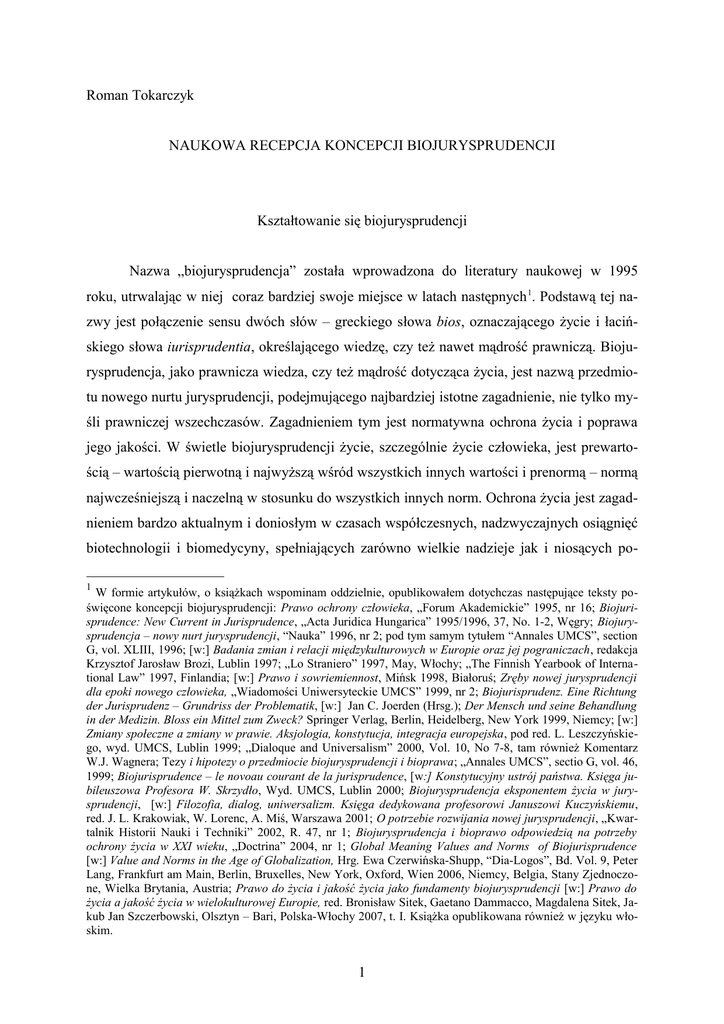 Roman Tokarczyk NAUKOWA RECEPCJA KONCEPCJI BIOJURYSPRUDENCJI Kształtowanie się biojurysprudencji Nazwa „biojurysprudencja” została wprowadzona do literatury naukowej w 1995 roku, utrwalając w niej coraz bardziej swoje miejsce w latach następnych 1. Podstawą tej nazwy jest połączenie sensu dwóch słów – greckiego słowa bios, oznaczającego życie i łacińskiego słowa iurisprudentia, określającego wiedzę, czy też nawet mądrość prawniczą. Biojurysprudencja, jako prawnicza wiedza, czy też mądrość dotycząca życia, jest nazwą przedmiotu nowego nurtu jurysprudencji, podejmującego najbardziej istotne zagadnienie, nie tylko myśli prawniczej wszechczasów. Zagadnieniem tym jest normatywna ochrona życia i poprawa jego jakości. W świetle biojurysprudencji życie, szczególnie życie człowieka, jest prewartością – wartością pierwotną i najwyższą wśród wszystkich innych wartości i prenormą – normą najwcześniejszą i naczelną w stosunku do wszystkich innych norm. Ochrona życia jest zagadnieniem bardzo aktualnym i doniosłym w czasach współczesnych, nadzwyczajnych osiągnięć biotechnologii i biomedycyny, spełniających zarówno wielkie nadzieje jak i niosących po1 W formie artykułów, o książkach wspominam oddzielnie, opublikowałem dotychczas następujące teksty poświęcone koncepcji biojurysprudencji: Prawo ochrony człowieka, „Forum Akademickie” 1995, nr 16; Biojurisprudence: New Current in Jurisprudence, „Acta Juridica Hungarica” 1995/1996, 37, No. 1-2, Węgry; Biojurysprudencja – nowy nurt jurysprudencji, “Nauka” 1996, nr 2; pod tym samym tytułem “Annales UMCS”, section G, vol. XLIII, 1996; [w:] Badania zmian i relacji międzykulturowych w Europie oraz jej pograniczach, redakcja Krzysztof Jarosław Brozi, Lublin 1997; „Lo Straniero” 1997, May, Włochy; „The Finnish Yearbook of International Law” 1997, Finlandia; [w:] Prawo i sowriemiennost, Mińsk 1998, Białoruś; Zręby nowej jurysprudencji dla epoki nowego człowieka, „Wiadomości Uniwersyteckie UMCS” 1999, nr 2; Biojurisprudenz. Eine Richtung der Jurisprudenz – Grundriss der Problematik, [w:] Jan C. Joerden (Hrsg.); Der Mensch und seine Behandlung in der Medizin. Bloss ein Mittel zum Zweck? Springer Verlag, Berlin, Heidelberg, New York 1999, Niemcy; [w:] Zmiany społeczne a zmiany w prawie. Aksjologia, konstytucja, integracja europejska, pod red. L. Leszczyńskiego, wyd. UMCS, Lublin 1999; „Dialoque and Universalism” 2000, Vol. 10, No 7-8, tam również Komentarz W.J. Wagnera; Tezy i hipotezy o przedmiocie biojurysprudencji i bioprawa; „Annales UMCS”, sectio G, vol. 46, 1999; Biojurisprudence – le novoau courant de la jurisprudence, [w:] Konstytucyjny ustrój państwa. Księga jubileuszowa Profesora W. Skrzydło, Wyd. UMCS, Lublin 2000; Biojurysprudencja eksponentem życia w jurysprudencji, [w:] Filozofia, dialog, uniwersalizm. Księga dedykowana profesorowi Januszowi Kuczyńskiemu, red. J. L. Krakowiak, W. Lorenc, A. Miś, Warszawa 2001; O potrzebie rozwijania nowej jurysprudencji, „Kwartalnik Historii Nauki i Techniki” 2002, R. 47, nr 1; Biojurysprudencja i bioprawo odpowiedzią na potrzeby ochrony życia w XXI wieku, „Doctrina” 2004, nr 1; Global Meaning Values and Norms of Biojurisprudence [w:] Value and Norms in the Age of Globalization, Hrg. Ewa Czerwińska-Shupp, “Dia-Logos”, Bd. Vol. 9, Peter Lang, Frankfurt am Main, Berlin, Bruxelles, New York, Oxford, Wien 2006, Niemcy, Belgia, Stany Zjednoczone, Wielka Brytania, Austria; Prawo do życia i jakość życia jako fundamenty biojurysprudencji [w:] Prawo do życia a jakość życia w wielokulturowej Europie, red. Bronisław Sitek, Gaetano Dammacco, Magdalena Sitek, Jakub Jan Szczerbowski, Olsztyn – Bari, Polska-Włochy 2007, t. I. Książka opublikowana również w języku włoskim. 1 ważne dla niego zagrożenia. Biojurysprudencja nie poprzestaje na samej tylko ochronie życia lecz wskazuje na sposoby poprawy jego jakości dzięki różnym czynnikom2. Jak trafnie zauważył profesor filozofii Stefan Symotiuk – rozważając sens biojurysprudencji – „Nowe dyscypliny badawcze rozwijają się przez dłuższy czas w postaci spontanicznej i przypadkowej, aż osiągną stan, gdy zdolne są ogłosić swoją »deklarację niepodległości«… mającą już rację bytu wśród uznanych dyscyplin i nurtów myślenia prawniczego” 3. Podobny pogląd, odnośnie do publikacji na temat biojurysprudencji, wyraził ks. profesor etyki i teologii Tadeusz Ślipko pisząc: „Prace naukowe to jednak mają do siebie, że są cierpliwe i na nie nadejdzie czas, kiedy staną się przedmiotem bliższego zainteresowania”4. Natomiast profesor prawa Jerzy Jaskiernia sformułował postulat, że już „Przydałaby się też refleksja, jak koncepcja biojurysprudencji wpłynęła na funkcjonowanie systemów prawnych i jaka jest jej percepcja w nauce. Skoro pojęcie to jest eksponowane od kilkunastu lat, to powstają już warunki, by dokonać takiej oceny”5. Odpowiadając na ten postulat, podejmuję próbę przeglądu percepcji koncepcji biojurysprudencji w nauce, opierając się na bogatej korespondencji6, znanych mi poświęconych jej 2 Szerzej por. R. Tokarczyk, Prawa narodzin, życia i śmierci, wyd. 9. rozszerzone, Oficyna Wolters Kluwer, Warszawa 2009, szczególnie rozdział pierwszy Przedmiot biojurysprudencji; R. A. Tokarczyk, Biojurysprudencja. Podstawy prawa dla XXI wieku, Wydawnictwo Marii Curie-Skłodowskiej, Lublin 2008; R. A. Tokarczyk, Biojurisprudence. Foundations of Law for the Twenty-First Century, Maria Curie-Skłodowska University Press, Lublin 2008. 3 S. Symotiuk, Wprowadzenie, [w:] R. A. Tokarczyk, Prawa narodzin, życia i śmierci, wyd. IV, Kantor Wydawniczy Zakamycze, Kraków 1997, s. 9 i w wydaniach następnych tej książki. 4 Ks. T. Ślipko, http:// rtokarcz.nazwa.pl/opinia 23.htm. Wydruk w posiadaniu autora. Podobnie w innych tego rodzaju przypisach. 5 J. J