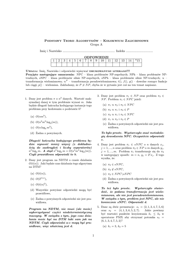 lub ciągi; p() – wielomian. Zakładamy, że P 6= N P , chyba że w pytaniu jest coś na ten temat napisane.