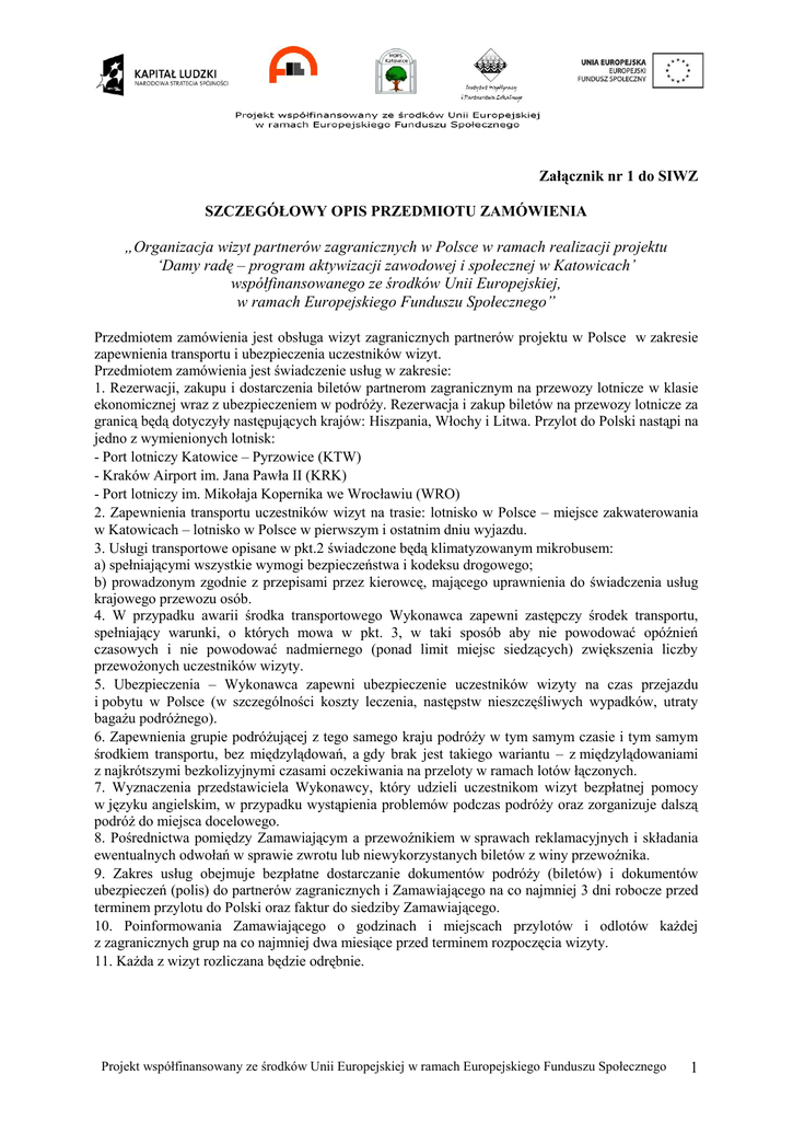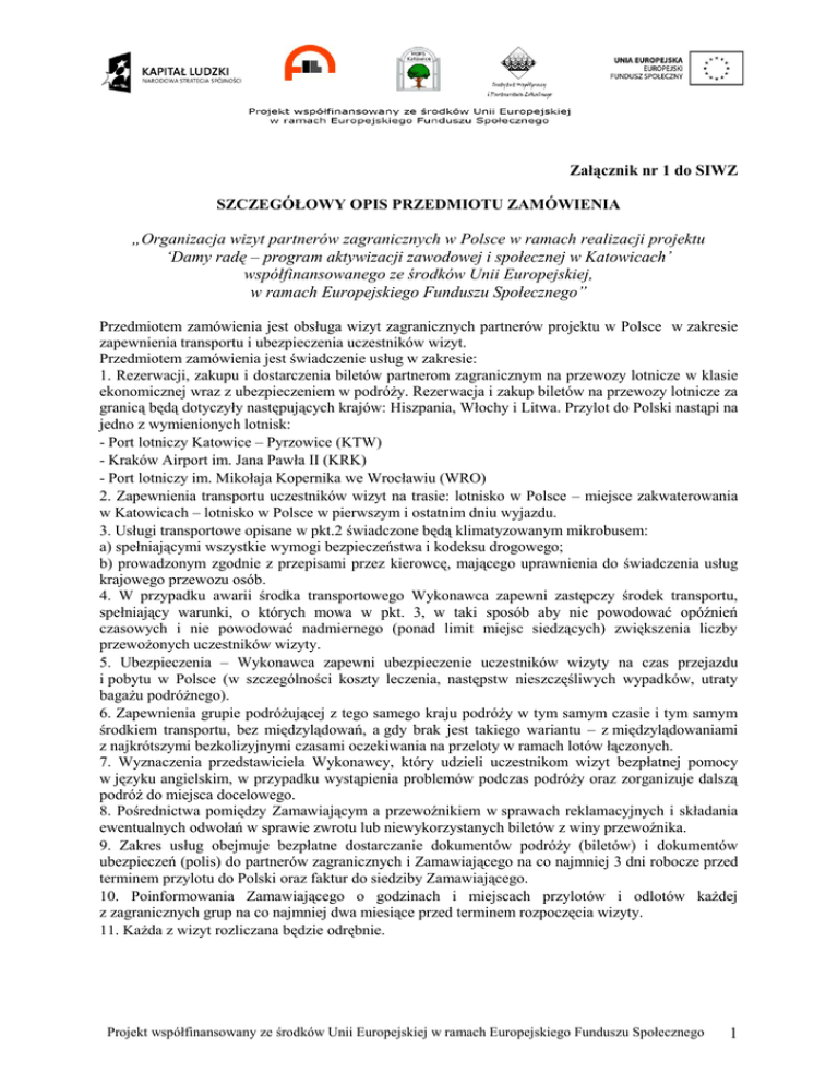 Załącznik nr 1 do SIWZ SZCZEGÓŁOWY OPIS PRZEDMIOTU ZAMÓWIENIA „Organizacja wizyt partnerów zagranicznych w Polsce w ramach realizacji projektu ‘Damy radę – program aktywizacji zawodowej i społecznej w Katowicach’ współfinansowanego ze środków Unii Europejskiej, w ramach Europejskiego Funduszu Społecznego” Przedmiotem zamówienia jest obsługa wizyt zagranicznych partnerów projektu w Polsce w zakresie zapewnienia transportu i ubezpieczenia uczestników wizyt. Przedmiotem zamówienia jest świadczenie usług w zakresie: 1. Rezerwacji, zakupu i dostarczenia biletów partnerom zagranicznym na przewozy lotnicze w klasie ekonomicznej wraz z ubezpieczeniem w podróży. Rezerwacja i zakup biletów na przewozy lotnicze za granicą będą dotyczyły następujących krajów: Hiszpania, Włochy i Litwa. Przylot do Polski nastąpi na jedno z wymienionych lotnisk: - Port lotniczy Katowice – Pyrzowice (KTW) - Kraków Airport im. Jana Pawła II (KRK) - Port lotniczy im. Mikołaja Kopernika we Wrocławiu (WRO) 2. Zapewnienia transportu uczestników wizyt na trasie: lotnisko w Polsce – miejsce zakwaterowania w Katowicach – lotnisko w Polsce w pierwszym i ostatnim dniu wyjazdu. 3. Usługi transportowe opisane w pkt.2 świadczone będą klimatyzowanym mikrobusem: a) spełniającymi wszystkie wymogi bezpieczeństwa i kodeksu drogowego; b) prowadzonym zgodnie z przepisami przez kierowcę, mającego uprawnienia do świadczenia usług krajowego przewozu osób. 4. W przypadku awarii środka transportowego Wykonawca zapewni zastępczy środek transportu, spełniający warunki, o których mowa w pkt. 3, w taki sposób aby nie powodować opóźnień czasowych i nie powodować nadmiernego (ponad limit miejsc siedzących) zwiększenia liczby przewożonych uczestników wizyty. 5. Ubezpieczenia – Wykonawca zapewni ubezpieczenie uczestników wizyty na czas przejazdu i pobytu w Polsce (w szczególności koszty leczenia, następstw nieszczęśliwych wypadków, utraty bagażu podróżnego). 6. Zapewnienia grupie podróżującej z tego samego kraju podróży w tym samym czasie i tym samym środkiem transportu, bez międzylądowań, a gdy brak jest takiego wariantu – z międzylądowaniami z najkrótszymi bezkolizyjnymi czasami oczekiwania na przeloty w ramach lotów łączonych. 7. Wyznaczenia przedstawiciela Wykonawcy, który udzieli uczestnikom wizyt bezpłatnej pomocy w języku angielskim, w przypadku wystąpienia problemów podczas podróży oraz zorganizuje dalszą podróż do miejsca docelowego. 8. Pośrednictwa pomiędzy Zamawiającym a przewoźnikiem w sprawach reklamacyjnych i składania ewentualnych odwołań w sprawie zwrotu lub niewykorzystanych biletów z winy przewoźnika. 9. Zakres usług obejmuje bezpłatne dostarczanie dokumentów podróży (biletów) i dokumentów ubezpieczeń (polis) do partnerów zagranicznych i Zamawiającego na co najmniej 3 dni robocze przed terminem przylotu do Polski oraz faktur do siedziby Zamawiającego. 10. Poinformowania Zamawiającego o godzinach i miejscach przylotów i odlotów każdej z zagranicznych grup na co najmniej dwa miesiące przed terminem rozpoczęcia wizyty. 11. Każda z wizyt rozliczana będzie odrębnie. Projekt współfinansowany ze środków Unii Europejskiej w ramach Europejskiego Funduszu Społecznego 1 Struktura zamówienia: 1. Przewidywana liczba wizyt: 4 2. Przewidywane terminy wizyt, trasa podróży oraz liczba uczestników: Dzień przylotu do Polski Termin wizyty w Polsce Dzień wylotu z Polski 16.07.2013 16.07.2013 16.07.2013 18.08.2013 18.08.2013 18.08.2013 15.10.2013 15.10.2013 15.10.2013 25.11.2013 25.11.2013 25.11.2013 17-19.07.2013 17-19.07.2013 17-19.07.2013 18-24.08.2013 18-24.08.2013 18-24.08.2013 16-18.10.2013 16-18.10.2013 16-18.10.2013 26.11.2013 26.11.2013 26.11.2013 19.07.2013 19.07.2013 19.07.2013 24.08.2013 24.08.2013 24.08.2013 18.10.2013 18.10.2013 18.10.2013 27.11.2013 27.11.2013 27.11.2013 Ilość osób 6 6 6 8 8 8 6 6 6 3 3 3 Trasa podróży Santiago de Compostela - Katowice - Santiago de Compostela Wenecja - Katowice - Wenecja Wilno - Katowice - Wilno Santiago de Compostela - Katowice - Santiago de Compostela Wenecja - Katowice - Wenecja Wilno - Katowice - Wilno Santiago de Compostela - Katowice - Santiago de Compostela Wenecja - Katowice - Wenecja Wilno - Katowice - Wilno Santiago de Compostela - Katowice - Santiago de Compostela Wenecja - Katowice - Wenecja Wilno - Katowice - Wilno 3. Partnerami zagranicznymi projektu są: 1) Associazione di Promozione Sociale Onlus “IL PORTICO” Via Brentabassa, 49 30031 Dolo (VE) Włochy 2) National Institute for Social Integration Gedimino pr. 21, 01103 Wilno. Litwa 3) Fundacion Paideia Plaza de María Pita, 17 15001 A Coruńa Hiszpania Projekt współfinansowany ze środków Unii Europejskiej w ramach Europejskiego Funduszu Społecznego 2