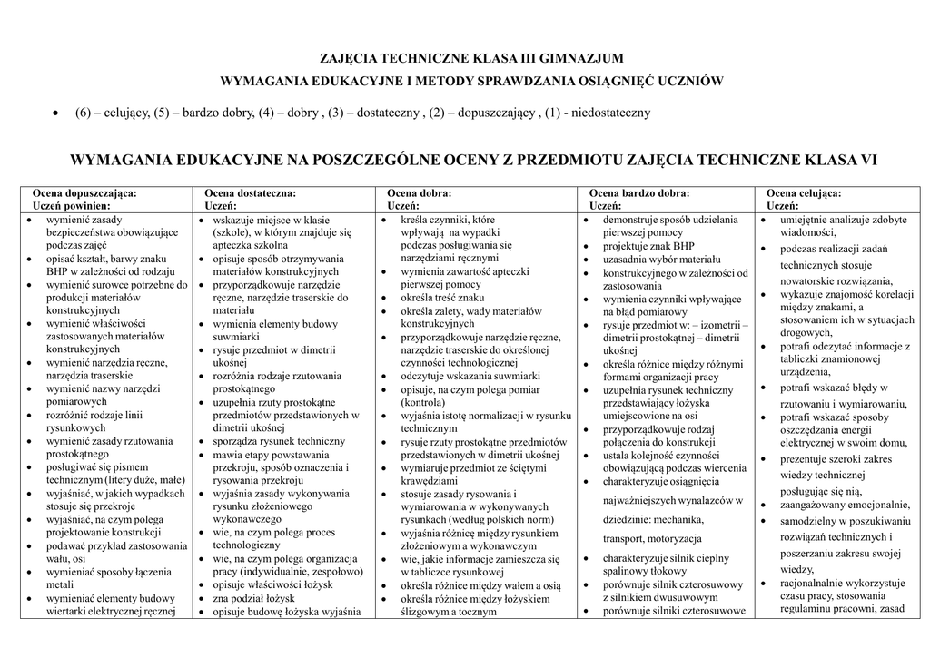 ZAJĘCIA TECHNICZNE KLASA III GIMNAZJUM WYMAGANIA EDUKACYJNE I METODY SPRAWDZANIA OSIĄGNIĘĆ UCZNIÓW (6) – celujący, (5) – bardzo dobry, (4) – dobry , (3) – dostateczny , (2) – dopuszczający , (1) - niedostateczny WYMAGANIA EDUKACYJNE NA POSZCZEGÓLNE OCENY Z PRZEDMIOTU ZAJĘCIA TECHNICZNE KLASA VI Ocena dopuszczająca: Uczeń powinien: wymienić zasady bezpieczeństwa obowiązujące podczas zajęć opisać kształt, barwy znaku BHP w zależności od rodzaju wymienić surowce potrzebne do produkcji materiałów konstrukcyjnych wymienić właściwości zastosowanych materiałów konstrukcyjnych wymienić narzędzia ręczne, narzędzia traserskie wymienić nazwy narzędzi pomiarowych rozróżnić rodzaje linii rysunkowych wymienić zasady rzutowania prostokątnego posługiwać się pismem technicznym (litery duże, małe) wyjaśniać, w jakich wypadkach stosuje się przekroje wyjaśniać, na czym polega projektowanie konstrukcji podawać przykład zastosowania wału, osi wymieniać sposoby łączenia metali wymieniać elementy budowy wiertarki elektrycznej ręcznej Ocena dostateczna: Uczeń: wskazuje miejsce w klasie (szkole), w którym znajduje się apteczka szkolna opisuje sposób otrzymywania materiałów konstrukcyjnych przyporządkowuje narzędzie ręczne, narzędzie traserskie do materiału wymienia elementy budowy suwmiarki rysuje przedmiot w dimetrii ukośnej rozróżnia rodzaje rzutowania prostokątnego uzupełnia rzuty prostokątne przedmiotów przedstawionych w dimetrii ukośnej sporządza rysunek techniczny mawia etapy powstawania przekroju, sposób oznaczenia i rysowania przekroju wyjaśnia zasady wykonywania rysunku złożeniowego wykonawczego wie, na czym polega proces technologiczny wie, na czym polega organizacja pracy (indywidualnie, zespołowo) opisuje właściwości łożysk zna podział łożysk opisuje budowę łożyska wyjaśnia Ocena dobra: Uczeń: kreśla czynniki, które wpływają na wypadki podczas posługiwania się narzędziami ręcznymi wymienia zawartość apteczki pierwszej pomocy określa treść znaku określa zalety, wady materiałów konstrukcyjnych przyporządkowuje narzędzie ręczne, narzędzie traserskie do określonej czynności technologicznej odczytuje wskazania suwmiarki opisuje, na czym polega pomiar (kontrola) wyjaśnia istotę normalizacji w rysunku technicznym rysuje rzuty prostokątne przedmiotów przedstawionych w dimetrii ukośnej wymiaruje przedmiot ze ściętymi krawędziami stosuje zasady rysowania i wymiarowania w wykonywanych rysunkach (według polskich norm) wyjaśnia różnicę między rysunkiem złożeniowym a wykonawczym wie, jakie informacje zamieszcza się w tabliczce rysunkowej określa różnice między wałem a osią określa różnice między łożyskiem ślizgowym a tocznym Ocena bardzo dobra: Uczeń: demonstruje sposób udzielania pierwszej pomocy projektuje znak BHP uzasadnia wybór materiału konstrukcyjnego w zależności od zastosowania wymienia czynniki wpływające na błąd pomiarowy rysuje przedmiot w: – izometrii – dimetrii prostokątnej – dimetrii ukośnej określa różnice między różnymi formami organizacji pracy uzupełnia rysunek techniczny przedstawiający łożyska umiejscowione na osi przyporządkowuje rodzaj połączenia do konstrukcji ustala kolejność czynności obowiązującą podczas wiercenia charakteryzuje osiągnięcia najważniejszych wynalazców w dziedzinie: mechanika, transport, motoryzacja charakteryzuje silnik cieplny spalinowy tłokowy porównuje silnik czterosuwowy z silnikiem dwusuwowym porównuje silniki czterosuwowe Ocena celująca: Uczeń: umiejętnie analizuje zdobyte wiadomości, podczas realizacji zadań technicznych stosuje nowatorskie rozwiązania, wykazuje znajomość korelacji między znakami, a stosowaniem ich w sytuacjach drogowych, potrafi odczytać informacje z tabliczki znamionowej urządzenia, potrafi wskazać błędy w rzutowaniu i wymiarowaniu, potrafi wskazać sposoby oszczędzania energii elektrycznej w swoim domu, prezentuje szeroki zakres wiedzy technicznej posługując się nią, zaangażowany emocjonalnie, samodzielny w poszukiwaniu rozwiązań technicznych i poszerzaniu zakresu swojej wiedzy, racjonalnalnie wykorzystuje czasu pracy, stosowania regulaminu pracowni, zasad wymieniać elementy motoroweru wymienia układy motoroweru wymienia podstawowe elementy samochodu wymienia rodzaje dróg wymienia różnice między znakami drogowymi zadania połączeń zna podział połączeń wyjaśnia związek między średnicą wiertła a jego prędkością obrotową określa zasady BHP obowiązujące podczas posługiwania się wiertarką elektryczną wymienia inżynierów starożytności, średniowiecza wymienia najważniejszych wynalazców w dziedzinie motoryzacji wymienia maszyny proste opisane przez Herona wymienia silniki podaje przykłady zastosowania silników wymienia rodzaje silników spalinowych, tłokowych wymienia środki transportu opisuje budowę silnika czterosuwowego, dwusuwowego zna parametry silnika czterosuwowego, Dwusuwowego omawia warunki techniczne motoroweru – wymienia układy motoroweru, które mają wpływ na bezpieczeństwo wymienia pojazdy samochodowe, które powodują największe zanieczyszczenie środowiska wyjaśnia pojęcie: smog wymienia zawody związane z motoryzacją wymienia samochody alternatywne wymienia elementy drogi w mieście i poza miastem odczytuje treści znaków drogowych poziomych, pionowych związanych z oznaczeniem dróg opisuje sposoby połączeń metali wymienia czynniki, które wpłynęły na rozwój mechaniki, transportu, motoryzacji wyjaśnia, na czym polega wynalazek, ochrona patentowa opisuje różnego typu maszyny zna podział środków transportu zna podział silników opisuje cykle pracy silnika czterosuwowego, dwusuwowego wymienia dane techniczne motoroweru porównuje dane techniczne dwóch motorowerów wymienia rozwiązania konstrukcyjne wpływające na bezpieczeństwo pojazdu porównuje dane