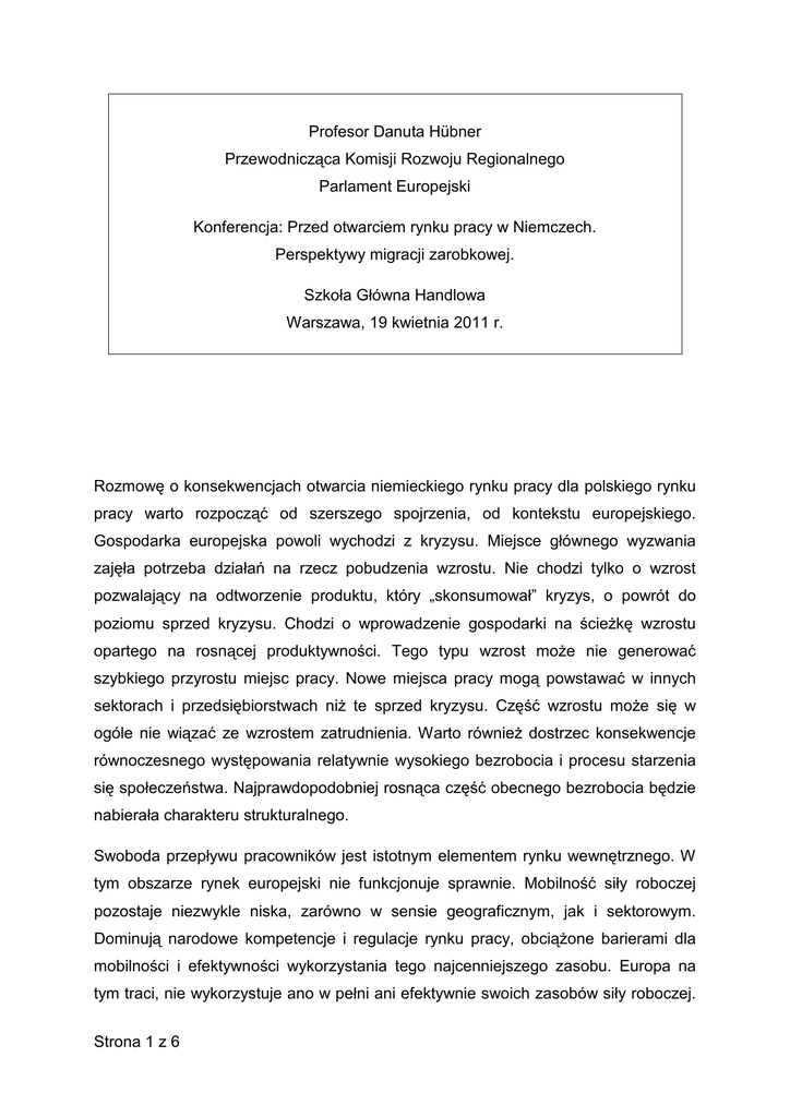 Strona 1 z 6 Profesor Danuta Hübner Przewodnicząca Komisji