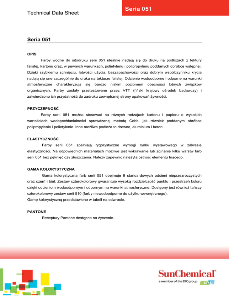 Seria 051 Technical Data Sheet Seria 051 OPIS Farby wodne do sitodruku serii 051 idealnie nadają się do druku na podłożach z tektury falistej, kartonu oraz, w pewnych warunkach, polietylenu i polipropylenu poddanych obróbce wstępnej. Dzięki szybkiemu schnięciu, łatwości użycia, bezzapachowości oraz dobrym współczynniku krycia nadają się one szczególnie do druku na tekturze falistej. Odcienie wodoodporne i odporne na warunki atmosferyczne charakteryzują się bardzo niskim poziomem obecności lotnych związków organicznych. Farby zostały przetestowane przez VTT (fiński krajowy ośrodek badawczy) i zatwierdzono ich przydatność do zadruku zewnętrznej strony opakowań żywności. PRZYCZEPNOŚĆ Farby serii 051 można stosować na różnych rodzajach kartonu i papieru o wysokich wartościach wodopochłanialności sprawdzanej metodą Cobb, jak również poddanym obróbce polipropylenie i polietylenie. Inne możliwe podłoża to drewno, aluminium i beton. ELASTYCZNOŚĆ Farby serii 051 spełniają rygorystyczne wymogi rynku wystawowego w zakresie elastyczności. Na odpowiednich materiałach możliwe jest wykrawanie lub zginanie kilku warstw farb serii 051 bez pęknięć czy złuszczania. Należy zapewnić należytą ostrość elementu tnącego. GAMA KOLORYSTYCZNA Gama kolorystyczna farb serii 051 obejmuje 9 standardowych odcieni nieprzezroczystych oraz czerń i biel. Zestaw czterokolorowy gwarantuje wysoką rozdzielczość punktu i przestrzeń koloru dzięki odcieniom wodoodpornym i odpornym na warunki atmosferyczne. Dostępny jest również tańszy czterokolorowy zestaw serii 510 (farby niewodoodporne do użytku wewnętrznego). Gamę kolorystyczną przedstawiono w tabeli na odwrocie. PANTONE Receptury Pantone dostępne na życzenie. Technical Data Sheet Seria 051 SZYBKOŚĆ UTRWALANIA Farby serii 051 schną szybko a temperaturę pieca można ustawić na 30°C. W szybkich maszynach cylindrycznych i przy więcej niż jednej warstwie farby, jak również wydrukach dwustronnych, zaleca się temperaturę do 50°C. Szybkość utrwalania zależy od wielu czynników, w tym grubości warstwy farby, materiału poddawanego zadrukowi oraz warunków w miejscu drukowania. UTWARDZACZ Farby serii 051 można utwardzać w przypadku konieczności zapewnienia lepszej odporności chemicznej i przyczepności. STABILNOŚĆ NA SICIE Jak na farby wodne farby serii 051 są bardzo stabilne. Po czasowych przerwach w druku należy wypełnić sito farbą i pozwolić jej chwilę postać. W przypadku dłuższych przerw na siatkę należy nanieść mydło sosnowe (1:5). PODŁOŻE Farby serii 051 są przeznaczone do druku na różnych podłożach. Na ich własności drukowe lub przyczepność może wpływać wiele przypadkowych czynników, np. obróbka powierzchniowa lub odchylenia klasy. Przed rozpoczęciem zadruku seryjnego zawsze przydatne jest sprawdzenie obróbki koronowej podłoża. MATERIAŁY DRUKARSKIE Wysokiej jakości materiały do szablonów, takie jak RLX czy Proclaim produkcji ULANO, polepszą jakoś druku, jakiej oczekuje się zazwyczaj od farb serii 051. Należy pamiętać, by zawsze stosować emulsję wodoodporną. Należy stosować drobną siatkę syntetyczną. Gęstość 120-140 włókien/cm pomoże zapewnić prawidłowe naniesienie i odcień farby. Stosowana gęstość siatki ma istotny wpływ na odporność farb na warunki atmosferyczne. Dalszych informacji udziela lokalny oddział Sun Chemical. Seria 051 Technical Data Sheet ROZCIEŃCZANIE Farby serii 051 dostarczane są jako gotowe do użycia i nie zaleca się ich rozcieńczania. W przypadku uznania go za konieczne, należy użyć wody. ZMYWANIE Sito należy zmyć jak najszybciej po przeprowadzeniu zadruku, w szczególności w przypadku stosowania utwardzacza. Wydajna jest mieszanka 50% mydła i 50% wody, można też stosować zmywacz 503-00817 lub 503-01338. WSPÓŁCZYNNIK KRYCIA Farby serii 051 mogą pokryć do 50m2/kg z siatką 120, jednak rezultaty będą różne w zależności od klasy siatki, grubości szablonu, stopnia rozcieńczenia, rodzaju maszyny itd. OKRES PRZYDATNOŚCI Farby serii 051 należy przechowywać w szczelnie zamkniętych opakowaniach polietylenowych w temperaturze 5-30°C (40-90 F). Minimalny okres trwałości wynosi 12 miesięcy, lecz w zależności od warunków przechowywania ich przydatność może być dłuższa. OBSŁUGA Niezależne laboratorium przeprowadziło próby na farbach serii 051 w zakresie zastosowań opakowaniowych (pośredni kontakt z żywnością). W sektorze opakowań farby stosowane są od dawna. DODATKI Zmywacz 503-00817 lub 503-01338 Utwardzacz 059-00869 Lakier 051-00722 ROZCIEŃCZALNIKI: Woda SERIA CZTEROKOLOROWA: Żółć 051-22700 Magenta 051-33700 Cyjan 051-44700 Czerń 051-77700 Seria 051 Technical Data Sheet KOLORY Żółć 051-20000 Ciepła czerwień 051-30000 Czerwień rubinowa 051-30100 Czerwień 051-30600 SPOTOWE: rodaminowa Niebieski z refleksami 051-40000 Zielony 051-50000 Purpurowy 051-80000 Biały 051-90000 051-40100 Niebieski procesowy 051-70000 Czarny 051-80100 Fioletowy 051-99103 Srebrny Złoty SERIA 510: 051-99102 Żółć 510-25000C Magenta 510-35000C Cyjan 510-45000C Czerń 510-77101C OPAKOWANIE Plastikowy kubeł o wadze 5 kg i 10 kg ZASTRZENIA PRAWNE Informacje znajdujące się w niniejszym dokumencie przekazuje się w dobrej wierze i w oparciu o doświadczenie w stosowaniu farb. Tym samym stanowią one jedynie wskazówkę i nie mogą być uznawane za prawnie wiążące. Po dalsze szczegółowe porady dotyczące stosowania prosimy skontaktować się z naszym działem technicznym. Na życzenie udostępniamy karty charakterystyki produktu.