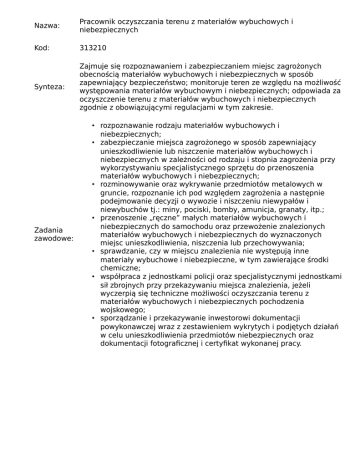 Nazwa: Pracownik oczyszczania terenu z materiałów wybuchowych i niebezpiecznych Kod: 313210 Synteza: Zajmuje się rozpoznawaniem i zabezpieczaniem miejsc zagrożonych obecnością materiałów wybuchowych i niebezpiecznych w sposób zapewniający bezpieczeństwo; monitoruje teren ze względu na możliwość występowania materiałów wybuchowym i niebezpiecznych; odpowiada za oczyszczenie terenu z materiałów wybuchowych i niebezpiecznych zgodnie z obowiązującymi regulacjami w tym zakresie. Zadania zawodowe: • rozpoznawanie rodzaju materiałów wybuchowych i niebezpiecznych; • zabezpieczanie miejsca zagrożonego w sposób zapewniający unieszkodliwienie lub niszczenie materiałów wybuchowych i niebezpiecznych w zależności od rodzaju i stopnia zagrożenia przy wykorzystywaniu specjalistycznego sprzętu do przenoszenia materiałów wybuchowych i niebezpiecznych; • rozminowywanie oraz wykrywanie przedmiotów metalowych w gruncie, rozpoznanie ich pod względem zagrożenia a następnie podejmowanie decyzji o wywozie i niszczeniu niewypałów i niewybuchów tj.: miny, pociski, bomby, amunicja, granaty, itp.; • przenoszenie „ręczne” małych materiałów wybuchowych i niebezpiecznych do samochodu oraz przewożenie znalezionych materiałów wybuchowych i niebezpiecznych do wyznaczonych miejsc unieszkodliwienia, niszczenia lub przechowywania; • sprawdzanie, czy w miejscu znalezienia nie występują inne materiały wybuchowe i niebezpieczne, w tym zawierające środki chemiczne; • współpraca z jednostkami policji oraz specjalistycznymi jednostkami sił zbrojnych przy przekazywaniu miejsca znalezienia, jeżeli wyczerpią się techniczne możliwości oczyszczania terenu z materiałów wybuchowych i niebezpiecznych pochodzenia wojskowego; • sporządzanie i przekazywanie inwestorowi dokumentacji powykonawczej wraz z zestawieniem wykrytych i podjętych działań w celu unieszkodliwienia przedmiotów niebezpiecznych oraz dokumentacji fotograficznej i certyfikat wykonanej pracy.