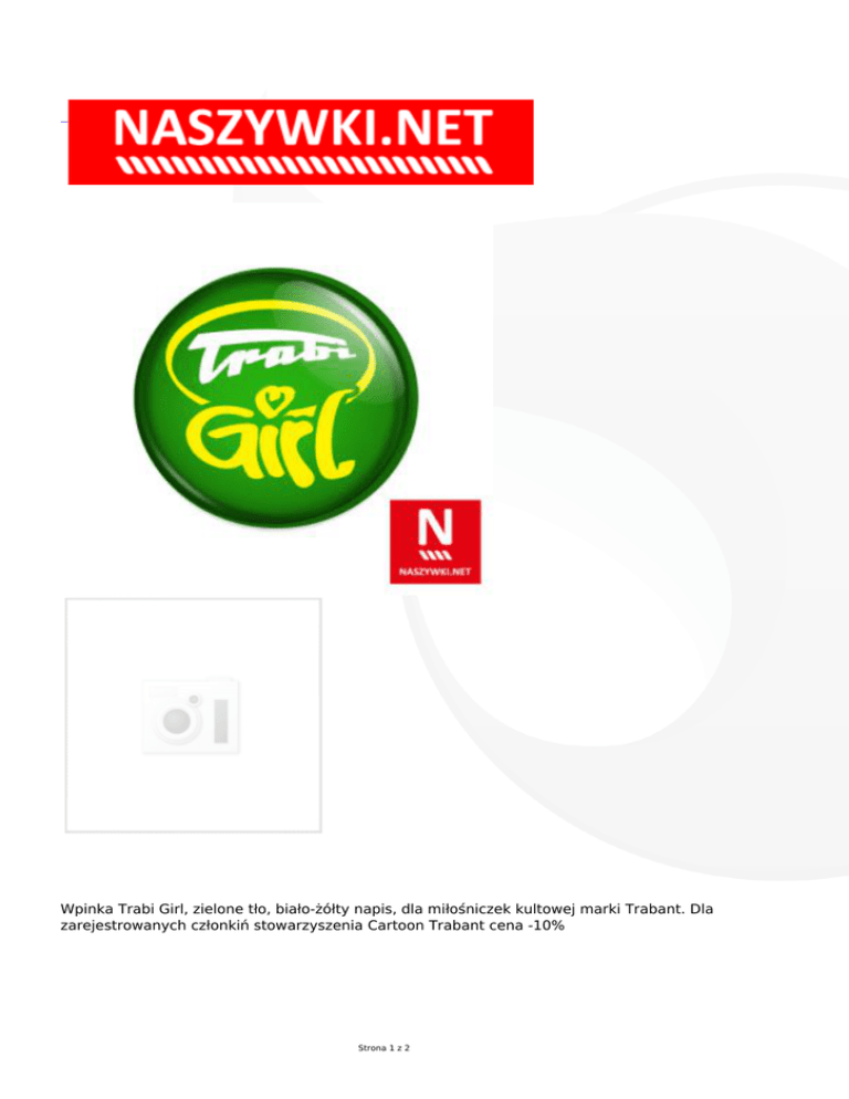 Wpinka Trabi Girl, zielone tło, biało-żółty napis, dla miłośniczek kultowej marki Trabant. Dla zarejestrowanych członkiń stowarzyszenia Cartoon Trabant cena -10% Strona 1 z 2 Strona 2 z 2