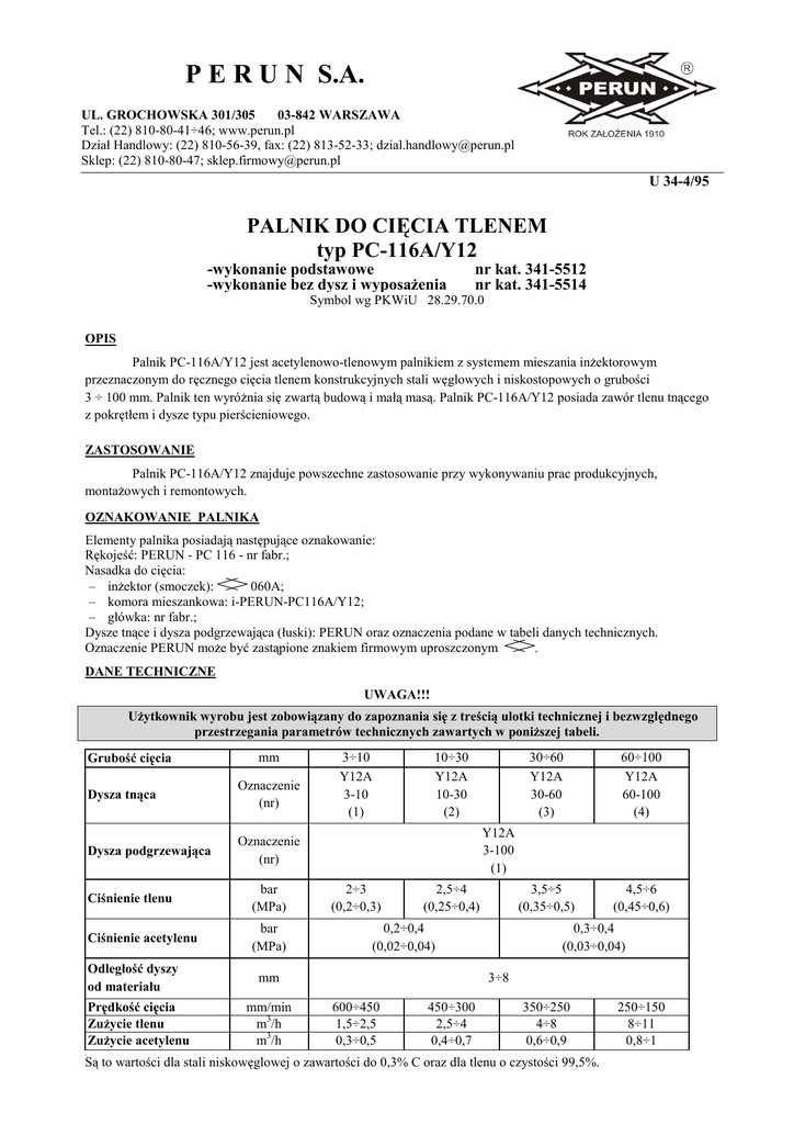 P E R U N S.A. UL. GROCHOWSKA 301/305 03-842 WARSZAWA Tel.: (22) 810-80-41÷46; www.perun.pl Dział Handlowy: (22) 810-56-39, fax: (22) 813-52-33; [email protected] Sklep: (22) 810-80-47; [email protected] U 34-4/95 PALNIK DO CIĘCIA TLENEM typ PC-116A/Y12 -wykonanie podstawowe -wykonanie bez dysz i wyposażenia nr kat. 341-5512 nr kat. 341-5514 Symbol wg PKWiU 28.29.70.0 OPIS Palnik PC-116A/Y12 jest acetylenowo-tlenowym palnikiem z systemem mieszania inżektorowym przeznaczonym do ręcznego cięcia tlenem konstrukcyjnych stali węglowych i niskostopowych o grubości 3 ÷ 100 mm. Palnik ten wyróżnia się zwartą budową i małą masą. Palnik PC-116A/Y12 posiada zawór tlenu tnącego z pokrętłem i dysze typu pierścieniowego. ZASTOSOWANIE Palnik PC-116A/Y12 znajduje powszechne zastosowanie przy wykonywaniu prac produkcyjnych, montażowych i remontowych. OZNAKOWANIE PALNIKA Elementy palnika posiadają następujące oznakowanie: Rękojeść: PERUN - PC 116 - nr fabr.; Nasadka do cięcia: – inżektor (smoczek): 060A; – komora mieszankowa: i-PERUN-PC116A/Y12; – główka: nr fabr.; Dysze tnące i dysza podgrzewająca (łuski): PERUN oraz oznaczenia podane w tabeli danych technicznych. Oznaczenie PERUN może być zastąpione znakiem firmowym uproszczonym . DANE TECHNICZNE UWAGA!!! Użytkownik wyrobu jest zobowiązany do zapoznania się z treścią ulotki technicznej i bezwzględnego przestrzegania parametrów technicznych zawartych w poniższej tabeli. Grubość cięcia mm Dysza tnąca Oznaczenie (nr) Dysza podgrzewająca Oznaczenie (nr) Ciśnienie tlenu bar (MPa) Ciśnienie acetylenu bar (MPa) Odległość dyszy od materiału Prędkość cięcia Zużycie tlenu Zużycie acetylenu 3÷10 Y12A 3-10 (1) 10÷30 Y12A 10-30 (2) 60÷100 Y12A 60-100 (4) 3,5÷5 (0,35÷0,5) 4,5÷6 (0,45÷0,6) Y12A 3-100 (1) 2÷3 (0,2÷0,3) 2,5÷4 (0,25÷0,4) 0,2÷0,4 (0,02÷0,04) mm mm/min m3/h m3/h 30÷60 Y12A 30-60 (3) 0,3÷0,4 (0,03÷0,04) 3÷8 600÷450 1,5÷2,5 0,3÷0,5 450÷300 2,5÷4 0,4÷0,7 350÷250 4÷8 0,6÷0,9 Są to wartości dla stali niskowęglowej o zawartości do 0,3% C oraz dla tlenu o czystości 99,5%. 250÷150 8÷11 0,8÷1 2 U 34-4/95 SKŁAD KOMPLETU W skład kompletu palnika PC-116A/Y12 wchodzi (wg nr kat.): - Palnik bez dysz i wyposażenia - Dysze tnące typ Y12A - Dysze podgrzewające typ Y12A - Przystawka do cięcia - Klucz - Wałeczki do czyszczenia otworów - Uszczelki zapasowe - Opakowanie: pudełko tekturowe Poz. 1. 2. 3. 4. 5. 6. Elementy palnika Palnik bez dysz Dysza nr 1 Y12A 3-10 Dysza nr 2 Y12A 10-30 Dysza nr 3 Y12A 30-60 Dysza nr 4 Y12A 60-100 Dysza podgrzewająca nr 1 Y12A 3-100 341-5512 1 szt. 4 szt. 1 szt. 1 szt. 1 szt. 1 kpl. 1 kpl. 1 szt. 341-5514 1 szt. 1 kpl. 1 szt. Nr kat. 341-5514 153-3510 153-3520 153-3530 153-3540 153-3600 INFORMACJE DODATKOWE 1. 2. Do kompletu palnika załączane są "Przepisy obsługi palników z systemem mieszania inżektorowym (smoczkowym)" wg nr 3D-1/98. Dla każdego kompletu palnika udzielana jest gwarancja na okres 12 miesięcy od daty sprzedaży (z wyjątkiem dysz tnących i dysz podgrzewajacych), jednak nie dłużej niż 18 miesięcy od daty produkcji.