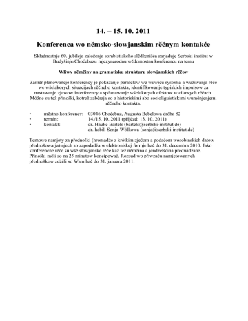 14. € 15. 10. 2011 Konferenca wo n•msko-s‚owjanskim r•ƒnym kontak„e Sk€adnostnje 60. jubileja za€o•enja sorabistiskeho sl‚dƒeni„…a zarjaduje Serbski institut w Budy„inje/Cho…ebuzu mjezynarodnu w‚domostnu konferencu na temu Wliwy n•mƒiny na gramatisku strukturu s‚owjanskich r•ƒow Zam‚r planowaneje konferency je pokazanje paralelow we wuwi…u systema a wu•iwanja r‚†e we w„elakorych situacijach r‚†neho kontakta, identifikowanje typiskich impulsow za nastawanje zjawow interferency a sp‡znawanje w„elakorych efektow w cilowych r‚†ach. M‡•ne su te• pˆino„ki, kotre• zab‚raja so z historiskimi abo socioliguistiskimi wum‚njenjemi r‚†neho kontakta. ‰ ‰ ‰ m‚stno konferency: 03046 Cho…ebuz, Augusta Bebelowa dr‡ha 82 termin: 14./15. 10. 2011 (pˆij‚zd: 13. 10. 2011) kontakt: dr. Hauke Bartels ([email protected]) dr. habil. Sonja WŠlkowa ([email protected]) Temowe namjety za pˆedno„ki (hromadƒe z kr‡tkim zje…om a poda…om wosobinskich datow pˆedno„owarja) njech so zapodadƒa w elektroniskej formje ha† do 31. decembra 2010. Jako konferencne r‚†e su w„‚ s€owjanske r‚†e ka• te• n‚m†ina a jendƒel„…ina pˆedwidƒane. Pˆino„ki m‚li so na 25 minutow koncipowa…. Rozsud wo pˆiwza…u namjetowanych pˆedno„kow zdƒ‚li so Wam ha† do 31. januara 2011. 14. € 15. 10. 2011 Konferenz zum deutsch-slawischen Sprachkontakt Anl‹sslich des 60. Jubil‹ums der GrŒndung des sorabistischen Forschungsinstituts veranstaltet das Sorbische Institut in Bautzen/Cottbus eine internationale sprachwissenschaftliche Konferenz zum Thema Einfl…sse des Deutschen auf die grammatische Struktur slawischer Sprachen. Ziel der geplanten Konferenz ist es, Entwicklungsparallelen in System und Sprachgebrauch in verschiedenen Sprachkontaktsituationen zu verdeutlichen, typische Impulse fŒr Interferenz•erscheinungen zu identifizieren und unterschiedliche Effekte in den Zielsprachen zu erkennen. MŠglich sind auch Beitr‹ge, die historische oder soziolinguistische Bedingungen des Sprachkontakts thematisieren. ‰ ‰ ‰ Tagungsort: Termin: Kontakt: 03046 Cottbus, August-Bebel-Str. 82 14./15. 10. 2011 (Anreise 13. 10. 2011) Dr. Hauke Bartels ([email protected]) Dr. habil. Sonja WŠlke ([email protected]) Themenvorschl‹ge (mit kurzer Zusammenfassung und Angaben zur Person) sollten bis zum 31. Dezember 2010 in elektronischer Form eingereicht werden. Als Konferenzsprachen sind alle slawischen Sprachen sowie Englisch und Deutsch vorgesehen. Die Beitr‹ge sollten fŒr 25 Minuten Redezeit konzipiert sein. Die Entscheidung Œber die Annahme der Themenvorschl‹ge wird bis 31. 1. 2011 mitgeteilt. 14. € 15. 10. 2011 Konferenca w† nimsko-s‚owja‡skem r•cnem kontakˆe PŽi g‡ƒbje 60. jubileuma za€o•enja sorabistiskego sl‚ƒe•skego instituta organiz‚rujo Serbski institut w Budy„ynje/Ch‡Žebuzu mjazynarodnu r‚cyw‚dnu konferencu k temje Wliwy nim‰„iny na gramatisku strukturu s‚owja‡skich r•cow. Planowana konferenca co wujasniŽ paralelne wuwiŽa w systemje a r‚cnem uzusu we w„akich situacijach r‚cnego kontakta, identific‚rowaŽ typiske impulse za interferencne zjawy a sp‡znaŽ rozdƒ‚lne efekty w cilowych r‚cach. M‡•ne su teke pŽinoski, ako tematiz‚ruju historiske abo sociolinguistiske wum‚njenja r‚cnego kontakta. ‰ ‰ ‰ m‚stno zejƒenja: termin: kontakt: 03046 Ch‡Žebuz, droga Augusta Bebela 82 14./15. 10. 2011 (pŽij‚zd 13. 10. 2011) dr. Hauke Bartels ([email protected]) dr. habil. Sonja WŠlkowa (sonja@serbski-institut) Naraƒenja za temy (z krotkim zespominanim a p‡daŽami k w‡sobje) dejali se a• do 31. decembra 2010 w elektroniskej formje zap‡daŽ. Ako konferencne r‚cy su pŽedwiƒone w„ykne s€owja•ske r‚cy ka• teke engel„…ina a nim„…ina. PŽinoski dejali byŽ koncip‚rowane na 25 minutow pow‚da•skego casa. Rozsuƒenje, l‚c naraƒenje jo se pŽiwze€o abo nic, dajo se a• do 31. 1. 2011 k w‚s…i.