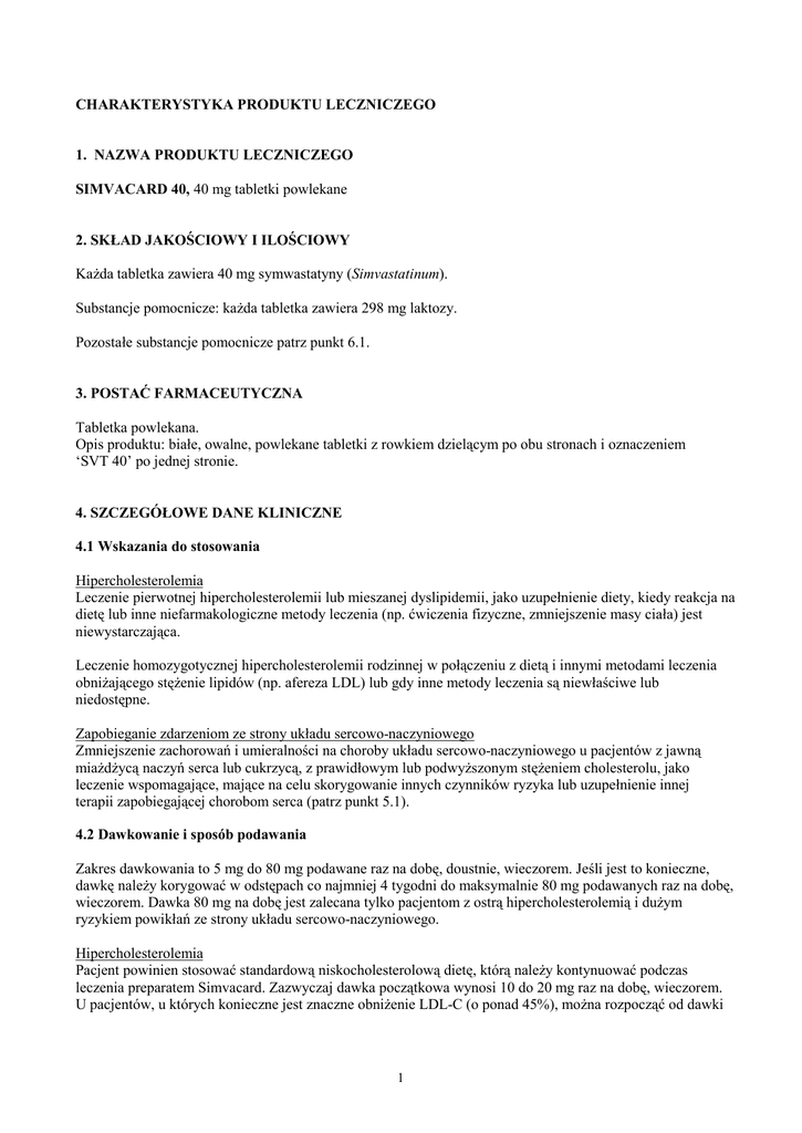 CHARAKTERYSTYKA PRODUKTU LECZNICZEGO 1. NAZWA PRODUKTU LECZNICZEGO SIMVACARD 40, 40 mg tabletki powlekane 2. SKŁAD JAKOŚCIOWY I ILOŚCIOWY Każda tabletka zawiera 40 mg symwastatyny (Simvastatinum). Substancje pomocnicze: każda tabletka zawiera 298 mg laktozy. Pozostałe substancje pomocnicze patrz punkt 6.1. 3. POSTAĆ FARMACEUTYCZNA Tabletka powlekana. Opis produktu: białe, owalne, powlekane tabletki z rowkiem dzielącym po obu stronach i oznaczeniem ‘SVT 40’ po jednej stronie. 4. SZCZEGÓŁOWE DANE KLINICZNE 4.1 Wskazania do stosowania Hipercholesterolemia Leczenie pierwotnej hipercholesterolemii lub mieszanej dyslipidemii, jako uzupełnienie diety, kiedy reakcja na dietę lub inne niefarmakologiczne metody leczenia (np. ćwiczenia fizyczne, zmniejszenie masy ciała) jest niewystarczająca. Leczenie homozygotycznej hipercholesterolemii rodzinnej w połączeniu z dietą i innymi metodami leczenia obniżającego stężenie lipidów (np. afereza LDL) lub gdy inne metody leczenia są niewłaściwe lub niedostępne. Zapobieganie zdarzeniom ze strony układu sercowo-naczyniowego Zmniejszenie zachorowań i umieralności na choroby układu sercowo-naczyniowego u pacjentów z jawną miażdżycą naczyń serca lub cukrzycą, z prawidłowym lub podwyższonym stężeniem cholesterolu, jako leczenie wspomagające, mające na celu skorygowanie innych czynników ryzyka lub uzupełnienie innej terapii zapobiegającej chorobom serca (patrz punkt 5.1). 4.2 Dawkowanie i sposób podawania Zakres dawkowania to 5 mg do 80 mg podawane raz na dobę, doustnie, wieczorem. Jeśli jest to konieczne, dawkę należy korygować w odstępach co najmniej 4 tygodni do maksymalnie 80 mg podawanych raz na dobę, wieczorem. Dawka 80 mg na dobę jest zalecana tylko pacjentom z ostrą hipercholesterolemią i dużym ryzykiem powikłań ze strony układu sercowo-naczyniowego. Hipercholesterolemia Pacjent powinien stosować standardową niskocholesterolową dietę, którą należy kontynuować podczas leczenia preparatem Simvacard. Zazwyczaj dawka początkowa wynosi 10 do 20 mg raz na dobę, wieczorem. U pacjentów, u których konieczne jest znaczne obniżenie LDL-C (o ponad 45%), można rozpocząć od dawki 1 20 mg do 40 mg raz na dobę, podawanej wieczorem. Jeśli konieczna jest korekta dawki, należy ją przeprowadzić tak, jak opisano powyżej. Homozygotyczna hipercholesterolemia rodzinna W oparciu o wyniki kontrolowanych badań klinicznych, zalecane dawkowanie preparatu Simvacard to 40 mg raz na dobę, wieczorem lub 80 mg na dobę w trzech dawkach: rano i w południe po 20 mg, a wieczorem 40 mg. W tej grupie pacjentów, preparat Simvacard należy stosować jako lek uzupełniający inne metody leczenia zmniejszające stężenie lipidów (np. afereza LDL) lub jeśli takie leczenie jest niedostępne lub niewłaściwe. Zapobieganie zdarzeniom ze strony układu sercowo-naczyniowego Zalecana dawka preparatu Simvacard u pacjentów z dużym ryzykiem wystąpienia zdarzeń wieńcowych (choroba wieńcowa, z hiperlipidemią lub bez) wynosi 20 do 40 mg raz na dobę, wieczorem. Leczenie może być rozpoczęte jednocześnie ze stosowaniem diety i ćwiczeniami fizycznymi. Jeśli konieczna jest korekta dawkowania, należy ją przeprowadzić tak, jak opisano powyżej. Jednoczesne stosowanie z innymi lekami zmniejszającymi stężenie lipidów. Preparat Simvacard jest skuteczny w monoterapii lub w skojarzeniu z preparatami wiążącymi kwasy żółciowe. Symwastatynę należy podawać albo nie później niż 2 godziny przed lub nie wcześniej niż 4 godziny po podaniu preparatów wiążących kwasy żółciowe. Pacjenci przyjmujący jednocześnie z preparatem Simvacard cyklosporynę, danazol, gemfibrozyl, inne fibraty (z wyjątkiem fenofibratu) lub niacynę w dawce zmniejszającej stężenie lipidów ( ≥ 1g na dobę) nie mogą stosować dobowej dawki preparatu Simvacard większej niż 10 mg na dobę. Pacjenci przyjmujący jednocześnie z preparatem Simvacard amiodaron lub werapamil, nie mogą stosować dobowej dawki preparatu Simvacard większej niż 20 mg na dobę (patrz punkt 4.4 i 4.5). Dawkowanie u pacjentów z niewydolnością nerek Nie ma konieczności zmiany dawkowania u pacjentów z łagodną lub umiarkowaną niewydolnością nerek. U pacjentów z ciężką niewydolnością nerek (klirens kreatyniny < 30 ml/min), należy bardzo starannie rozważyć podawanie dawki większej niż 10 mg na dobę i jeśli jest to niezbędne, bardzo ostrożnie rozpocząć leczenie. Stosowanie u pacjentów w podeszłym wieku Nie ma potrzeby dostosowania dawkowania. Stosowanie u dzieci i młodzieży Nie ustalono skuteczności i bezpieczeństwa stosowania u dzieci. Preparatu nie należy stosować u dzieci i młodzieży. 4.3 Przeciwwskazania Nadwrażliwość na symwastatynę lub jakikolwiek inny składnik preparatu. Czynna choroba wątroby lub utrzymujące się, niewyjaśnione zwiększenie aktywności aminotransferaz w surowicy. Ciąża i okres karmienia piersią (patrz punkt 4.6). Jednoczesne podawanie silnych inhibitorów CYP3A4 (np. itrakonazol, ketokonazol, inhibitory proteazy wirusa HIV, erytromycyna, klarytromycyna, telitromycyna i nefazodon) (patrz punkt 4.5). 4.4 Specjalne ostrzeżenia i środki ostrożności dotyczące stosowania Miopatia/rabdomioliza (rozpad mięśni poprzecznie prążkowanych) Symwastatyna, podobnie jak inne inhibitory reduktazy HMG-CoA, wywołuje niekiedy miopatię objawiającą się bólami mięśni, tkliwością lub osłabieniem, z towarzyszącym zwiększeniem aktywności kinazy kreatynowej (CK) do ponad 10 razy powyżej górnej granicy wartości uznanej za prawidłową. Miopatia czasem przekształca się w rabdomiolizę z ostrą niewydolnością nerek spowodowaną mioglobinurią lub bez. Odnotowano bardzo 2 rzadko przypadki zgonów. Duża aktywność inhibitorów reduktazy HMG-CoA w osoczu zwiększa ryzyko wystąpienia miopatii. Ryzyko wystąpienia miopatii i (lub) rabdomiolizy zależy od dawki. W badaniach klinicz