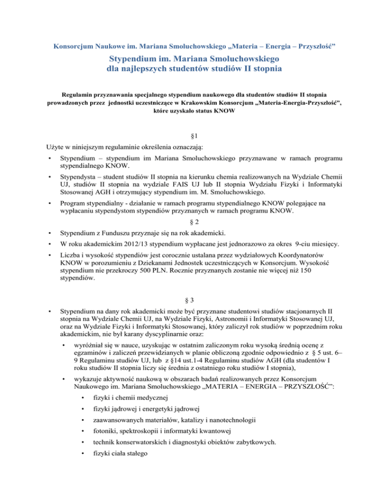 Konsorcjum Naukowe im. Mariana Smoluchowskiego „Materia – Energia – Przyszłość” Stypendium im. Mariana Smoluchowskiego dla najlepszych studentów studiów II stopnia Regulamin przyznawania specjalnego stypendium naukowego dla studentów studiów II stopnia prowadzonych przez jednostki uczestniczące w Krakowskim Konsorcjum „Materia-Energia-Przyszłość”, które uzyskało status KNOW §1 Użyte w niniejszym regulaminie określenia oznaczają: • Stypendium – stypendium im Mariana Smoluchowskiego przyznawane w ramach programu stypendialnego KNOW. • Stypendysta – student studiów II stopnia na kierunku chemia realizowanych na Wydziale Chemii UJ, studiów II stopnia na wydziale FAIS UJ lub II stopnia Wydziału Fizyki i Informatyki Stosowanej AGH i otrzymujący stypendium im. M. Smoluchowskiego. • Program stypendialny - działanie w ramach programu stypendialnego KNOW polegające na wypłacaniu stypendystom stypendiów przyznanych w ramach programu KNOW. §2 • Stypendium z Funduszu przyznaje się na rok akademicki. • W roku akademickim 2012/13 stypendium wypłacane jest jednorazowo za okres 9-ciu miesięcy. • Liczba i wysokość stypendiów jest corocznie ustalana przez wydziałowych Koordynatorów KNOW w porozumieniu z Dziekanami Jednostek uczestniczących w Konsorcjum. Wysokość stypendium nie przekroczy 500 PLN. Rocznie przyznanych zostanie nie więcej niż 150 stypendiów. §3 • Stypendium na dany rok akademicki może być przyznane studentowi studiów stacjonarnych II stopnia na Wydziale Chemii UJ, na Wydziale Fizyki, Astronomii i Informatyki Stosowanej UJ, oraz na Wydziale Fizyki i Informatyki Stosowanej, który zaliczył rok studiów w poprzednim roku akademickim, nie był karany dyscyplinarnie oraz: • wyróżniał się w nauce, uzyskując w ostatnim zaliczonym roku wysoką średnią ocenę z egzaminów i zaliczeń przewidzianych w planie obliczoną zgodnie odpowiednio z § 5 ust. 6– 9 Regulaminu studiów UJ, lub z §14 ust.1-4 Regulaminu studiów AGH (dla studentów I roku studiów II stopnia liczy się średnia z ostatniego roku studiów I stopnia), • wykazuje aktywność naukową w obszarach badań realizowanych przez Konsorcjum Naukowego im. Mariana Smoluchowskiego „MATERIA – ENERGIA – PRZYSZŁOŚĆ”: • fizyki i chemii medycznej • fizyki jądrowej i energetyki jądrowej • zaawansowanych materiałów, katalizy i nanotechnologii • fotoniki, spektroskopii i informatyki kwantowej • technik konserwatorskich i diagnostyki obiektów zabytkowych. • fizyki ciała stałego • fizyki cząstek elementarnych • biofizyki • informatyki • Dopuszcza się odstąpienie od warunku zaliczenia roku studiów w poprzednim roku akademickim, o którym mowa w ust. 1, w przypadku studenta posiadającego wybitne osiągnięcia naukowe, jeżeli niezaliczenie roku studiów było spowodowane narodzinami dziecka lub przyczynami zdrowotnymi. • Za aktywność naukową, o których mowa w ust. 1 pkt 2, uważa się w szczególności: • publikacje naukowe; • udział w projektach badawczych; • autorstwo lub współautorstwo patentu lub wzoru użytkowego; • wystąpienia na konferencjach naukowych; • udział w praktykach, stażach, szkołach, warsztatach naukowych; §4 Procedura rekrutacyjna i odwoławcza opisana jest w aneksie do niniejszego regulaminu. §5 • Stypendysta do końca zimowej sesji poprawkowej zobowiązany jest udokumentować uzyskanie zaliczenia wszystkich przedmiotów objętych swoim programem studiów w semestrze zimowym pod rygorem utraty stypendium. W przypadku niewypełnienia tego obowiązku wypłata stypendium ustaje poczynając od następnego miesiąca po utracie prawa do stypendium. • Student urlopowany nie może ubiegać się o stypendium. W przypadku, gdy student otrzymujący stypendium motywacyjne otrzymuje urlop w trakcie roku akademickiego traci on prawo do stypendium, poczynając od następnego miesiąca po uzyskaniu urlopu. • Student traci prawo do otrzymywania stypendium: • po ukończeniu studiów, • po skreśleniu z listy studentów, • jeżeli został zawieszony w prawach studenta prawomocnym orzeczeniem komisji dyscyplinarnej. • W przypadkach określonych w ust. 1–3 wypłata stypendium ustaje poczynając od następnego miesiąca po utracie prawa do stypendium. Decyzję o cofnięciu stypendium podejmuje właściwy prodziekan do spraw studenckich. • W przypadku gdy jeden ze stypendystów traci prawo do wypłaty stypendium, może ono być przyznane pierwszej osobie z listy rezerwowej. §6 • Stypendysta zobowiązuje się do przestrzegania postanowień niniejszego Regulaminu pod rygorem utraty uprawnień do udziału w programie stypendialnym. Aneks. Rekrutacja stypendystów 1. Przyjmowaniem zgłoszeń kandydatów do stypendium zajmują się osoby wyznaczone przez Prodziekanów ds. dydaktyki Wydziałów Chemii i FAIS UJ oraz Wydziału Fizyki i Informatyki Stosowanej AGH. Zakres ich obowiązków określają Prodziekani ds. dydaktyki tych Wydziałów. 2. Rekrutację do programu stypendialnego przeprowadzają Komisje Rekrutacyjne powołane przez Prodziekanów ds. dydaktyki. Komisje Rekrutacyjne liczą po 3 osoby: dwóch pracowników naukowodydaktycznych oraz przedstawiciela studentów (zaproponowanego przez Samorząd Studencki). 3. Komisje Rekrutacyjne ogłaszają terminy naboru i wzór wniosku do programu stypendialnego. Terminy i wzór wniosku zostaną podane do publicznej wiadomości przez opublikowanie na stronach internetowych Wydziałów Chemii, FAIS UJ oraz Wydziału Fizyki i Informatyki Stosowanej AGH przez wywieszenie na tablicach ogłoszeń studenckich w budynkach tych Wydziałów. 4. Od postanowień Komisji Rekrutacyjnych przysługuje odwołanie do Komisji Odwoławczych w terminie 7 dni od daty ogłoszenia list stypendystów. Komisje Odwoławcze liczą po 3 osoby i w jej skład wchodzą: Prodziekani ds. dydaktyki oraz przedstawiciele studentów (2 osoby zaproponowane przez Samorząd Studencki