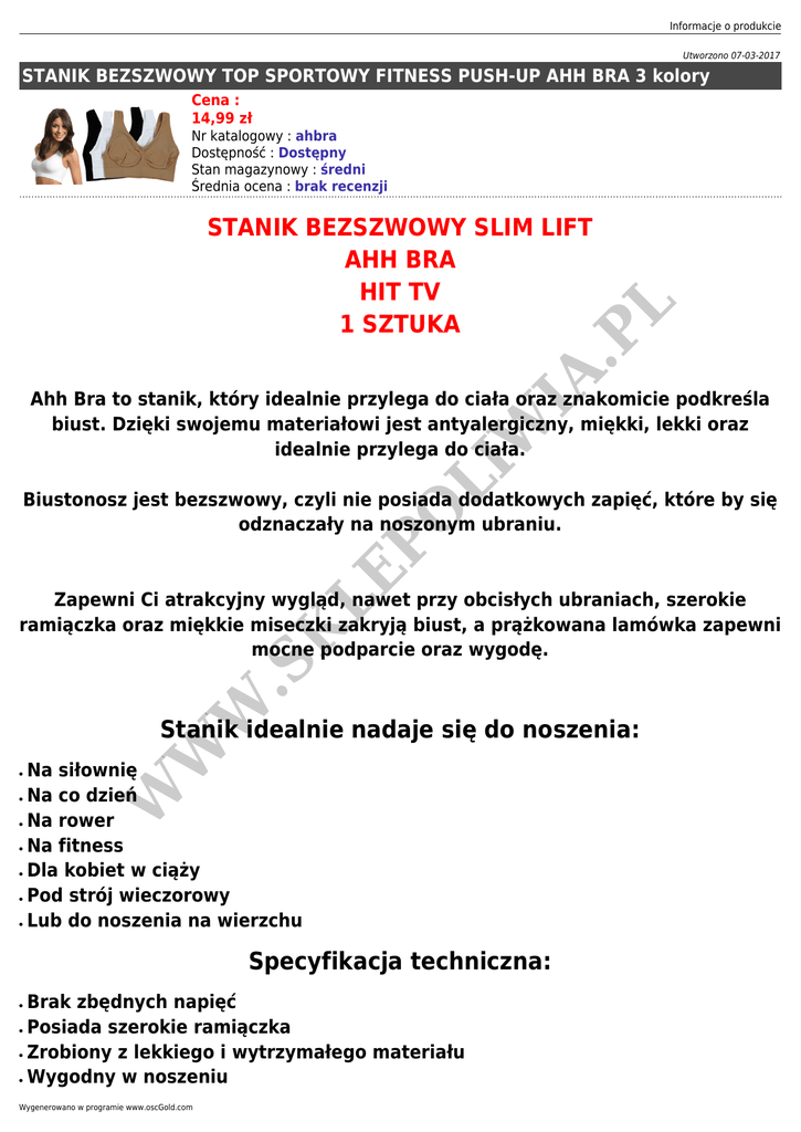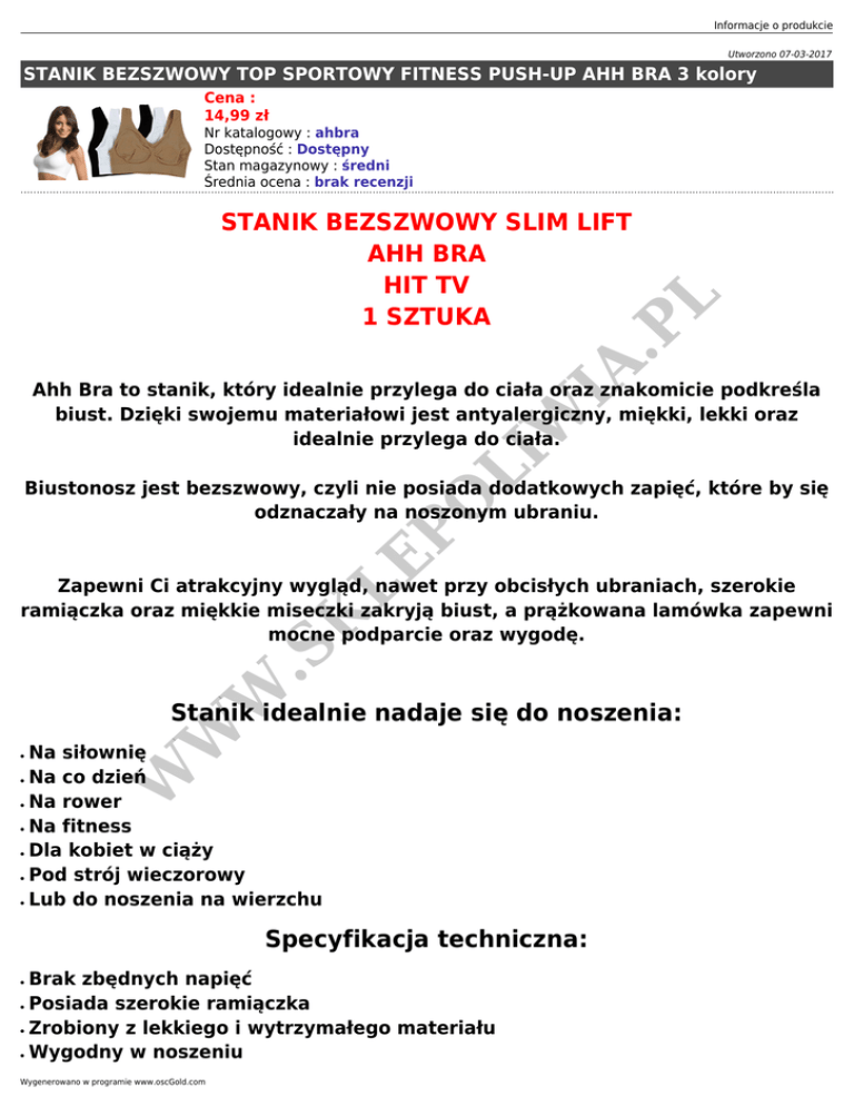 Informacje o produkcie Utworzono 07-03-2017 STANIK BEZSZWOWY TOP SPORTOWY FITNESS PUSH-UP AHH BRA 3 kolory Cena : 14,99 zł IA .P STANIK BEZSZWOWY SLIM LIFT AHH BRA HIT TV 1 SZTUKA L Nr katalogowy : ahbra Dostępność : Dostępny Stan magazynowy : średni Średnia ocena : brak recenzji O LI W Ahh Bra to stanik, który idealnie przylega do ciała oraz znakomicie podkreśla biust. Dzięki swojemu materiałowi jest antyalergiczny, miękki, lekki oraz idealnie przylega do ciała. LE P Biustonosz jest bezszwowy, czyli nie posiada dodatkowych zapięć, które by się odznaczały na noszonym ubraniu. W .S K Zapewni Ci atrakcyjny wygląd, nawet przy obcisłych ubraniach, szerokie ramiączka oraz miękkie miseczki zakryją biust, a prążkowana lamówka zapewni mocne podparcie oraz wygodę. ● ● ● ● ● ● ● W W Stanik idealnie nadaje się do noszenia: Na siłownię Na co dzień Na rower Na fitness Dla kobiet w ciąży Pod strój wieczorowy Lub do noszenia na wierzchu Specyfikacja techniczna: ● ● ● ● Brak zbędnych napięć Posiada szerokie ramiączka Zrobiony z lekkiego i wytrzymałego materiału Wygodny w noszeniu Wygenerowano w programie www.oscGold.com ● ● ● ● Elastyczny Posiada szeroką gumę pod biustem Można prać tylko ręcznie Skład: 80% Nylon, 20% Elastane Obwód biustu IA .P L Rozmiar M (38) - 86-92cm Rozmiar L (40) -90-100cm O LI W Rozmiar XL (42) -100-108cm Rozmiar XXL (43) -105- 110cm ● ● W .S ● M: 52 cm - kolor czarny L: 54 cm - kolor biały ,czarny ,beż XL: 58 cm - kolor biały czarny,beż XXL: 60 cm - kolor czarny,beż K ● LE P Dostępne rozmiary i kolory: ● ● ● W W Zestaw zawiera: Fabrycznie nowy stanik bezszwowy Ahh Bra 1 sztukę Oryginalne opakowanie Paragon/FV