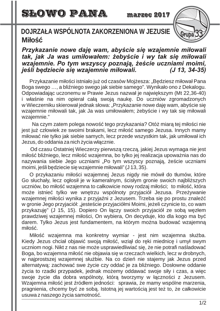 SŁOWO PANA marzec 2017 DOJRZAŁA WSPÓLNOTA ZAKORZENIONA W JEZUSIE Miłość Przykazanie nowe daję wam, abyście się wzajemnie miłowali tak, jak Ja was umiłowałem: żebyście i wy tak się miłowali wzajemnie. Po tym wszyscy poznają, żeście uczniami moimi, jeśli będziecie się wzajemnie miłowali. (J 13, 34-35) Przykazanie miłości istniało już od czasów Mojżesza: „Będziesz miłował Pana Boga swego …, a bliźniego swego jak siebie samego”. Wynikało ono z Dekalogu. Odpowiadając uczonemu w Prawie Jezus nazwał je największym (Mt 22,36-40) i właśnie na nim opierał całą swoją naukę. Do uczniów zgromadzonych w Wieczerniku skierował jednak słowa: „Przykazanie nowe daję wam, abyście się wzajemnie miłowali tak, jak Ja was umiłowałem; żebyście i wy tak się miłowali wzajemnie.” Na czym zatem polega nowość tego przykazania? Otóż miarą tej miłości nie jest już człowiek ze swoimi brakami, lecz miłość samego Jezusa. Innych mamy miłować nie tylko jak siebie samych, lecz przede wszystkim tak, jak umiłował ich Jezus, do oddania za nich życia włącznie. Od czasu Ostatniej Wieczerzy pierwszą rzeczą, jakiej Jezus wymaga nie jest miłość bliźniego, lecz miłość wzajemna, bo tylko jej realizacja upoważnia nas do nazywania siebie Jego uczniami „Po tym wszyscy poznają, żeście uczniami moimi, jeśli będziecie się wzajemnie miłowali” (J 13, 35). O przykazaniu miłości wzajemnej Jezus nigdy nie mówił do tłumów, które Go słuchały, lecz ogłosił je w kameralnym, ścisłym gronie swoich najbliższych uczniów, bo miłość wzajemna to całkowicie nowy rodzaj miłości; to miłość, która może istnieć tylko we wnętrzu wspólnoty przyjaciół Jezusa. Przeżywanie wzajemnej miłości wynika z przyjaźni z Jezusem. Trzeba się po prostu znaleźć w gronie Jego przyjaciół: „jesteście przyjaciółmi Moimi, jeżeli czynicie to, co wam przykazuję” (J 15, 15). Dopiero On łączy swoich przyjaciół ze sobą węzłem prawdziwej wzajemnej miłości, On wybiera, On decyduje, kto dla kogo ma być darem. Tylko Jezus jest fundamentem, na którym można budować wzajemną miłość. Miłość wzajemna ma konkretny wymiar - jest nim wzajemna służba. Kiedy Jezus chciał objawić swoją miłość, wziął do ręki miednicę i umył swym uczniom nogi. Nikt z nas nie może usprawiedliwiać się, że nie potrafi naśladować Boga, bo wzajemna miłość nie objawia się w rzeczach wielkich, lecz w drobnych, w najprostszej wzajemnej służbie. Na co dzień nie stajemy jak Jezus przed alternatywą: zachować swe życie czy oddać je za bliźniego. Dosłowne oddanie życia to rzadki przypadek, jednak możemy oddawać swoje siły i czas, a więc swoje życie dla dobra wspólnoty, którą tworzymy w łączności z Jezusem. Wzajemna miłość jest źródłem jedności: sprawia, że mamy wspólne marzenia, pragnienia, chcemy być ze sobą. Istotną jej wartością jest też to, że całkowicie usuwa z naszego życia samotność. 1/2 SŁOWO PANA Przykazanie nowe daję wam, abyście się wzajemnie miłowali tak, jak Ja was umiłowałem: żebyście i wy tak się miłowali wzajemnie. Po tym wszyscy poznają, żeście uczniami moimi, jeśli będziecie się wzajemnie miłowali. (J 13, 34-35) Jak żyć tym Słowem? Budowanie wspólnoty opartej na miłości wzajemnej jest po ludzku sądząc bardzo trudne, bo wymaga ofiary wielu serc, a nie tylko jednostki. Będzie jednak możliwe, jeżeli każdy z nas zacznie od siebie. Istnieje wiele sposobów, by dawać coś z siebie innym: przede wszystkim przebaczać, dać drugą szansę, pierwszemu pozdrowić kogoś, kto mnie obraził, zrezygnować z własnych planów, gdy potrzeba komuś pomóc, wykorzystać swoje talenty i umiejętności w służbie wspólnoty. Budowanie wspólnoty miłości powinno opierać się na wzajemnym przekonaniu, że nikt z nas nie jest ważniejszy od drugiego i każdy z nas potrzebuje miłości drugiego. I pamiętać, że nie da się tego osiągnąć bez pomocy Ducha Świętego. Świadectwo Nasza mała grupa istnieje już od 13 lat. Mimo, że zmieniał się jej skład, trzon grupy stanowią osoby związane z nią od początku. Jesteśmy w podobnym wieku, ale różnimy się charakterem i temperamentem. Cenimy jednak te same wartości wynikające z wiary i miłości do Boga i ludzi. W miarę poznawania i akceptowania siebie nawzajem łatwiej nam wspólnie podejmować obowiązki związane z przynależnością do Grupy 33 (np. dyżury) oraz nowe inicjatywy (np. ewangelizacja parafii św. Barbary w Chorzowie). Zarówno trudne sytuacje życiowe (np. choroba, pobyt w szpitalu, śmierć bliskich), jak i codzienne okazje do służenia sobie wzajemną pomocą i modlitwą, są dla nas praktycznym sprawdzianem realizowania przykazania miłości. Wsparcie modlitewne małej grupy jest pomocne również w rozwijaniu indywidualnych charyzmatów: posługa w hospicjum, opieka nad niedołężnymi rodzicami, pomoc członkom rodziny, pomoc na rzecz misji, a także budzi nadzieję na wzrost duchowy każdego z nas. Grupa II „Wprowadzajcie słowo w czyn” (Jk 1,22) 2/2