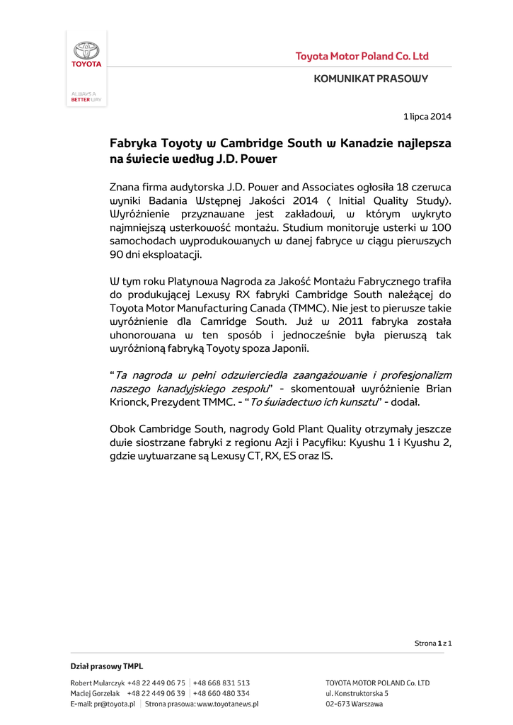 1 lipca 2014 Fabryka Toyoty w Cambridge South w Kanadzie najlepsza na świecie według J.D. Power Znana firma audytorska J.D. Power and Associates ogłosiła 18 czerwca wyniki Badania Wstępnej Jakości 2014 ( Initial Quality Study). Wyróżnienie przyznawane jest zakładowi, w którym wykryto najmniejszą usterkowość montażu. Studium monitoruje usterki w 100 samochodach wyprodukowanych w danej fabryce w ciągu pierwszych 90 dni eksploatacji. W tym roku Platynowa Nagroda za Jakość Montażu Fabrycznego trafiła do produkującej Lexusy RX fabryki Cambridge South należącej do Toyota Motor Manufacturing Canada (TMMC). Nie jest to pierwsze takie wyróżnienie dla Camridge South. Już w 2011 fabryka została uhonorowana w ten sposób i jednocześnie była pierwszą tak wyróżnioną fabryką Toyoty spoza Japonii. “Ta nagroda w pełni odzwierciedla zaangażowanie i profesjonalizm naszego kanadyjskiego zespołu” - skomentował wyróżnienie Brian Krionck, Prezydent TMMC. - “To świadectwo ich kunsztu” - dodał. Obok Cambridge South, nagrody Gold Plant Quality otrzymały jeszcze dwie siostrzane fabryki z regionu Azji i Pacyfiku: Kyushu 1 i Kyushu 2, gdzie wytwarzane są Lexusy CT, RX, ES oraz IS. Strona 1 z 1