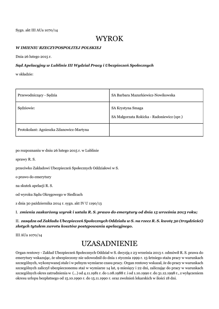 Sygn. akt III AUa 1070/14 WYROK W IMIENIU RZECZYPOSPOLITEJ POLSKIEJ Dnia 26 lutego 2015 r. Sąd Apelacyjny w Lublinie III Wydział Pracy i Ubezpieczeń Społecznych w składzie: Przewodniczący - Sędzia SA Barbara Mazurkiewicz-Nowikowska Sędziowie: SA Krystyna Smaga SA Małgorzata Rokicka - Radoniewicz (spr.) Protokolant: Agnieszka Zdanowicz-Martyna po rozpoznaniu w dniu 26 lutego 2015 r. w Lublinie sprawy R. S. przeciwko Zakładowi Ubezpieczeń Społecznych Oddziałowi w S. o prawo do emerytury na skutek apelacji R. S. od wyroku Sądu Okręgowego w Siedlcach z dnia 30 października 2014 r. sygn. akt IV U 1190/13 I. zmienia zaskarżony wyrok i ustala R. S. prawo do emerytury od dnia 15 września 2013 roku; II. zasądza od Zakładu Ubezpieczeń Społecznych Oddziału w S. na rzecz R. S. kwotę 30 (trzydzieści) złotych tytułem zwrotu kosztów postępowania apelacyjnego. III AUa 1070/14 UZASADNIENIE Organ rentowy - Zakład Ubezpieczeń Społecznych Oddział w S. decyzją z 23 września 2013 r. odmówił R. S. prawa do emerytury wskazując, że ubezpieczony nie udowodnił do dnia 1 stycznia 1999 r. 15-letniego stażu pracy w warunkach szczególnych, wykonywanej stale i w pełnym wymiarze czasu pracy. Organ rentowy wskazał, że do pracy w warunkach szczególnych zaliczył ubezpieczonemu staż w wymiarze 14 lat, 9 miesięcy i 22 dni, zaliczając do pracy w warunkach szczególnych okres zatrudnienia w (...) od 4.11.1981 r. do 1.08.1988 r. i od 1.10.1990 r. do 31.12.1998 r., z wyłączeniem okresu urlopu bezpłatnego od 15.10.1990 r. do 15.11.1990 r. oraz zwolnień lekarskich w ilości 18 dni. Od tej decyzji odwołanie do Sądu Okręgowego w Siedlcach złożył R. S. wnosząc o jej zmianę i ustalenie mu prawa do emerytury. W uzasadnieniu wskazał, że do pracy w warunkach szczególnych powinien być również zaliczony okres zatrudnienia na stanowisku tokarza od 1.09.1971 r. do 14.06.1974 r. Wskazał, że jego praca w tym okresie polegała na wykańczaniu odlewów poprzez obróbkę wiórową – toczenie i faktycznie był operatorem maszyn do obróbki wiórowej odlewów żeliwnych, co stanowi pracę w warunkach szczególnych. Sąd Okręgowy w Siedlcach wyrokiem z dnia 30 października 2014 roku oddalił odwołanie. Sąd Okręgowy ustalił, że ubezpieczony R. S. ur. (...), który nie przystąpił do otwartego funduszu emerytalnego, w dniu (...)ukończył 60-ty rok życia. W dniu 3 września 2013 r. złożył wniosek o ustalenie prawa do emerytury. Na podstawie przedłożonych do wniosku dokumentów organ rentowy ustalił, że na dzień 1 stycznia 1999 r. ubezpieczony udowodnił staż ubezpieczeniowy w wymiarze 28 lat, 11 miesięcy i 13 dni, z czego okresy składkowe wynoszą 28 lat, 11 miesięcy i 13 dni, a okresy nieskładkowe 18 dni. Ponadto organ rentowy stwierdził, że ubezpieczony udowodnił staż pracy w warunkach szczególnych w wymiarze 14 lat, 9 miesięcy i 22 dni zaliczając do pracy w warunkach szczególnych okres zatrudnienia w (...) od 4.11.1981 r. do 1.08.1988 r. i od 01.10.1990 r. do 31.12.1998 r. Z uwagi na brak wymaganego ustawą stażu pracy w warunkach szczególnych zaskarżoną decyzją organ rentowy odmówił ubezpieczonemu przyznania emerytury. Ubezpieczony był zatrudniony w okresie od 10 października 1968 r. do 13 listopada 2000 r. w Fabryce (...) Sp. z o.o. w Ł.. Od 10.10.1968 r. został zatrudniony jako uczeń w ramach umowy o praktyczna naukę zawodu na okres 3 lat. Następnie od 1 lipca 1971 r. powierzono mu obowiązki tokarza –stażysty na wydziale P-2 (następnie na wydziale W-2). Z dniem 15 czerwca 1974 r. powierzono ubezpieczonemu obowiązki wytaczacza. Fabryka (...) Sp. z o.o. w Ł. zajmowała się produkcją maszyn budowlanych: przesiewaczy, koparek. Przedmiotowa fabryka miała swoja odlewnię żeliwa i na wydziale W-2 miała miejsce obróbka odlewów żeliwnych oraz obróbką odlewów nieżelaznych (tzw. kolorowych), które przychodziły do zakładu. Ubezpieczony od 1 lipca 1971 r. do 14.06.1974 r. pracował na tokarce, jego praca polegała wiórowym zdejmowaniu warstw żeliwa w celu uzyskania odpowiedniego kształtu detalu służącego do produkcji maszyn budowlanych. Obróbka na tokarce jest obróbką wiórową. Ubezpieczony oprócz odlewów żeliwnych obrabiał również odlewy kolorowe: z mosiądzu, brązu, obrabiając detale tj. głównie tulejki, które również były wykorzystywane do produkcji maszyn produkowanych przez pracodawcę. Obróbka wiórowa materiałów kolorowych zajmowała ubezpieczonemu ok. 2-3 dni w tygodniu w zależności od ilości dostarczonych odlewów. Sąd Okręgowy orzekł, że w oparciu o przepis art. 184 ust. 1 ustawy z dnia 17 grudnia 1998r. o emeryturach i rentach z Funduszu Ubezpieczeń Społecznych wnioskodawca urodzony po dniu 31 grudnia 1948 roku mógłby uzyskać prawo do emerytura po osiągnięciu wieku przewidzianego w art.32 – czyli 60 roku życia, pod warunkiem osiągnięcia w dniu wejścia w życie ustawy 15 letniego okresu zatrudnienia w szczególnych warunkach lub w szczególnym charakterze wymaganym w przepisach dotychczasowych do nabycia prawa do emerytury w wieku niższym niż 65 lat - dla mężczyzn oraz okresu składkowy i nieskładkowego wynoszącego 25 lat. Poza sporem w niniejszej sprawie pozostaje, że wnioskodawca osiągnął wiek 60 lat i udowodnił wymagany 25 letni okres zatrudnienia, nie przystąpił również do otwartego funduszu emerytalnego. Przedmiotem sporu w sprawie było to, czy wnioskodawca przez co najmniej 15 lat pracował w warunkach szczególnych. Zgodnie z §4 ust.1 pkt 3 rozporządzenia Rady Ministrów z 7 lutego 1983r. w sprawie wieku emerytalnego pracowników zatrudnionych w szczególnych warunkach lub w szczególnym charakterze (Dz.U. Nr 8, poz.43 ze zm.) pracownik, który wykonywał prace w szczególnych warunkach, wymienione w wykazie A załącznika do rozporządzenia, nabywa prawo do emerytury w w/w wieku jeżeli ma wymagany okres zatrudnienia (co najmniej 25 lat mę