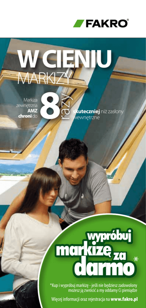 W CIENIU MARKIZY 8 razy Markiza zewnętrzna AMZ chroni do skuteczniej niż zasłony wewnętrzne wypróbuj markize za darmo * *Kup i wypróbuj markizę - jeśli nie będziesz zadowolony możesz ją zwrócić a my oddamy Ci pieniądze Więcej informacji oraz rejestracja na www.fakro.pl ZALETY MARKIZY ZEWNĘTRZNEJ OPTYMALNA OCHRONA PRZED NAGRZANIEM PODDASZA Zamontowana markiza na oknie dachowym to optymalna ochrona (efekt-cena) przed nagrzewaniem poddasza. Markiza absorbuje promieniowanie słoneczne już przed szybą i emituje ciepło na zewnątrz przez co w słoneczne dni bardzo dobrze chroni wnętrze przed uciążliwym upałem. Z przeprowadzonych przez firmę FAKRO badań wynika, że markiza chroni przed ciepłem promieniowania słonecznego do 8 razy skuteczniej, niż roleta wewnętrzna zaciemniająca. NATURALNE ŚWIATŁO NA PODDASZU Markiza umożliwia jednocześnie dopływ naturalnego światła i kontakt wzrokowy z otoczeniem. Dodatkowo umieszczenie markizy za oknem nie zmniejsza powierzchni przeszklenia okna. Markiza z materiału o 10% prześwicie przepuszcza wystarczającą ilość światła i umożliwia obserwacje okolicy, dlatego nie ma potrzeby codziennej obsługi markizy. Można ją zaciągnąć na całe lato. POPRAWA WARUNKÓW ERGONOMICZNYCH Markiza poprawia warunki ergonomiczne w miejscach pracy. Zapewnia równomierny rozkład natężenia światła, co daje naszym oczom wizualny komfort i chroni je przed szkodliwym oddziaływaniem refleksów, szczególnie przy pracy z komputerem. W pomieszczeniach z zaciągniętą markizą, oczy nie męczą się, tak jak w pomieszczeniu bez markizy, gdzie rozkład natężenia światła jest bardzo nierównomierny. REDUKCJA HAŁASU Zaciągnięta w czasie deszczu markiza redukuje odgłos spadających kropel. Ten dodatkowy atut markizy zewnętrznej jest nieoceniony podczas snu. PRYWATNOŚĆ Zaciągnięta markiza zapewnia poczucie prywatności. Chroni przed niepożądanym zaglądaniem z zewnątrz i zapewnia poczucie prywatności. OCHRONA PRZED PROMIENIOWANIEM UV Markiza ogranicza przenikanie szkodliwego promieniowania UV do wnętrza pomieszczenia. Zaciągnięta markiza pomaga chronić przedmioty i materiały znajdujące się w pomieszczeniu przed szkodliwym promieniowaniem UV, które powoduje odbarwianie się przedmiotów. ŁATWY I SZYBKI MONTAŻ Markizę montujemy od wewnątrz pomieszczenia (wystarczy wykręcić cztery wkręty z oblachowania, założyć markizę i haczyki oraz ponownie wkręcić wkręty w te same otwory). Sprawdź jak przyjemnie może być cieniu markizy.... Od teraz nawet w najbardziej upalne dni, możesz zrelaksować się w chłodnym pomieszczeniu na poddaszu. Wystarczy, że kupisz markizę FAKRO AMZ – my gwarantujemy Ci 100% zadowolenia. Jeśli jednak nie będziesz wystarczająco usatysfakcjonowany, po 3 miesiącach od daty zakupu markizy możesz ją zwrócić i otrzymać pieniądze, które zainwestowałeś w jej zakup. W ten sposób testujesz markizę zupełnie za darmo! Jak skorzystać z programu... 1. Kup min. jedną sztukę markizy zewnętrznej typu: AMZ089, AMZ090, AMZ091, AMZ 092, AMZ093, AMZ094i zachowaj dowód zakupu. Markizę możesz kupić w dowolnym punkcie handlowym lub w sklepie internetowym FAKRO w preferowanym rozmiarze. 2. W ciągu 30 dni od dokonania zakupu markizy zarejestruj się na stronie www.fakro.pl – zakładka„Wypróbuj markizę za darmo”. 3. Zamontuj i testuj markizę przez min. 3 miesiące od dnia jej zakupu. 4. Po upływie 3 miesięcy od daty zakupu, lecz nie później niż 6 miesięcy, możesz zwrócić markizę do punktu handlowego, w którym ją kupiłeś, lub jeśli zakup odbywał się przez internet, możesz ją odesłać bezpośred nio do firmy FAKRO. 5. Do zwracanych markiz dołącz dowód zakupu i formularz zgłoszeniowy. Zapraszamy do zapoznania się z regulaminem programu oraz z szeroką gamą produktów dostępną na stronie internetowej FAKRO, tj. www.fakro.pl. Więcej informacji na temat programu można też uzyskać dzwoniąc pod nr 18 444 0 342. Markizę AMZ poleca: nr Sprzedawcy Firma pieczątka firmy